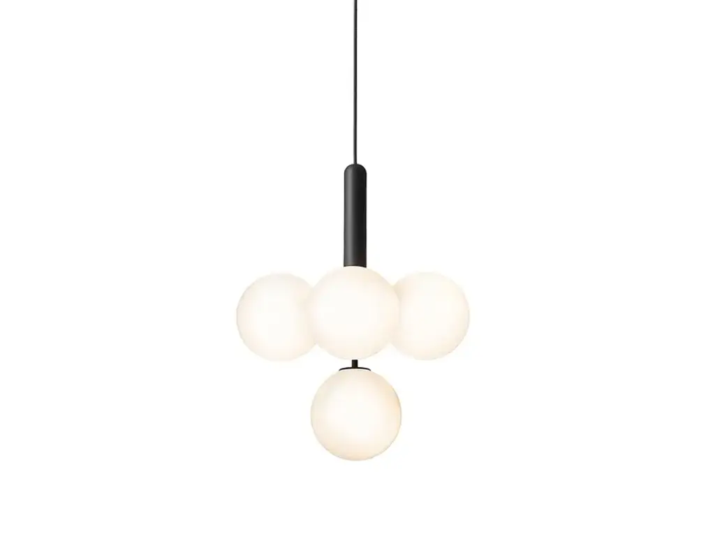 Miira 4 Opal a chandelier in perfect dimensions suitable both over the dining table, livingroom and kitchen areas.Glass / Metal, Rock Grey / Opal White, G9Miira is a series of lamps in a simple and timeless design which embraces the Nordic elegance and function. The neatly mouth-blown glass and stylish processed metal give the design balance and depth. The Optic Clear glass with the unique embossed pattern give a playful light and spreads a unique atmosphere to the room the lamp is placed in.Soft Nordic light shines from the Opal White glass and spreads a unique atmosphere to the room the lamp placed in.