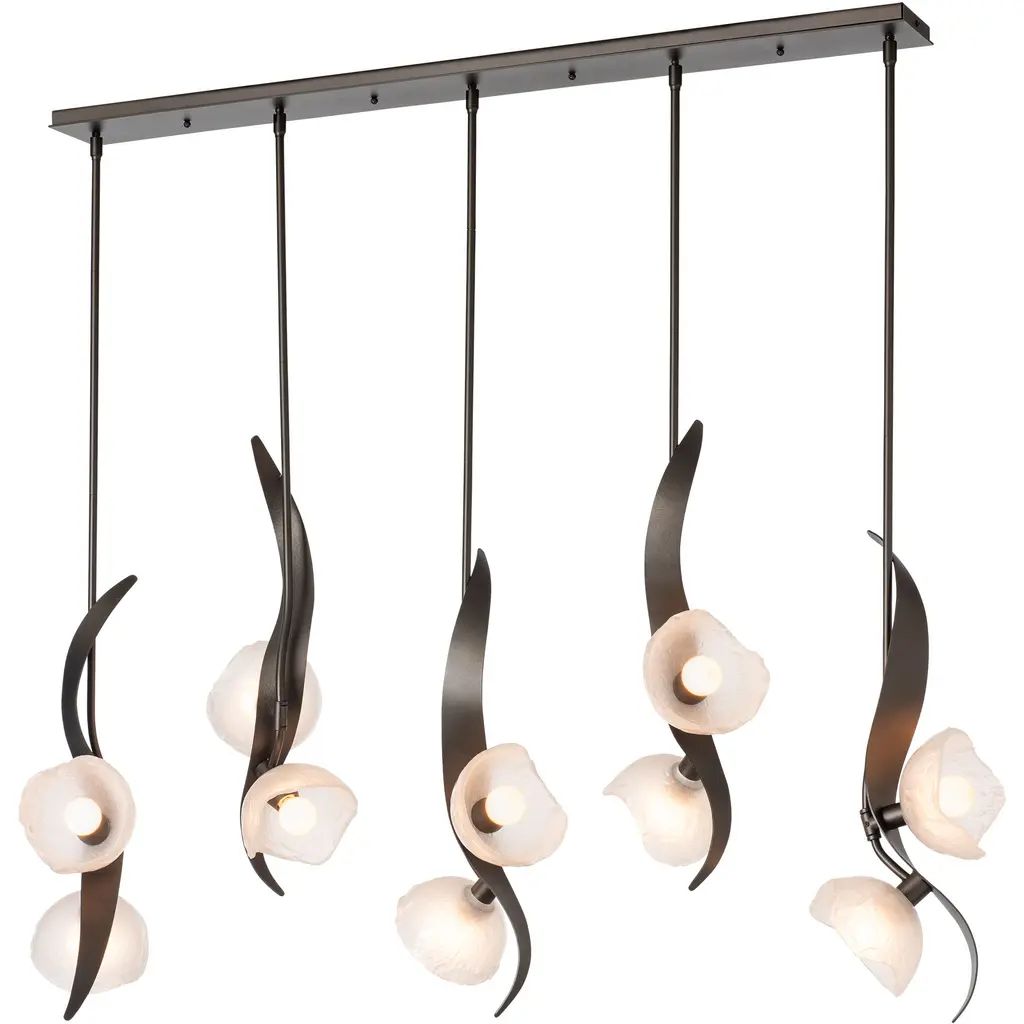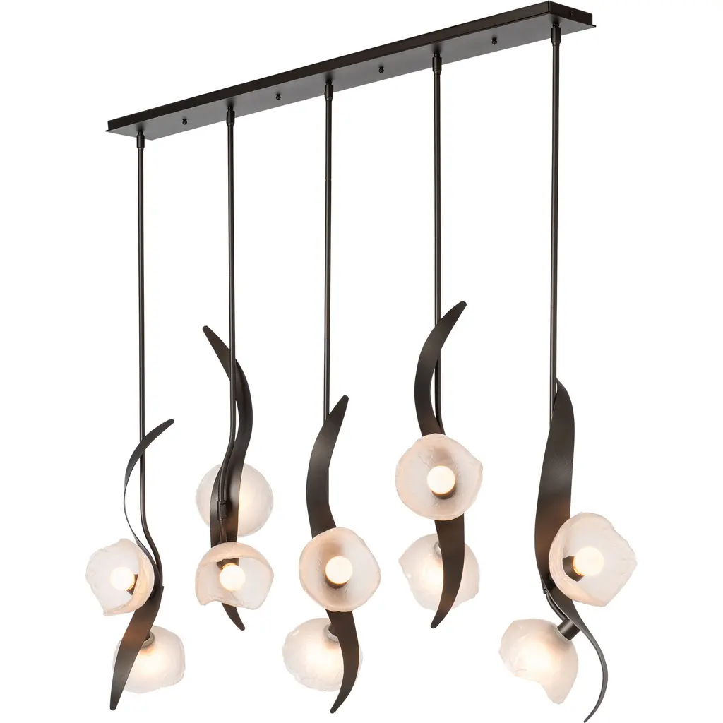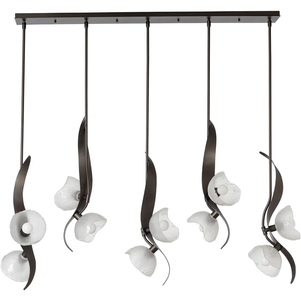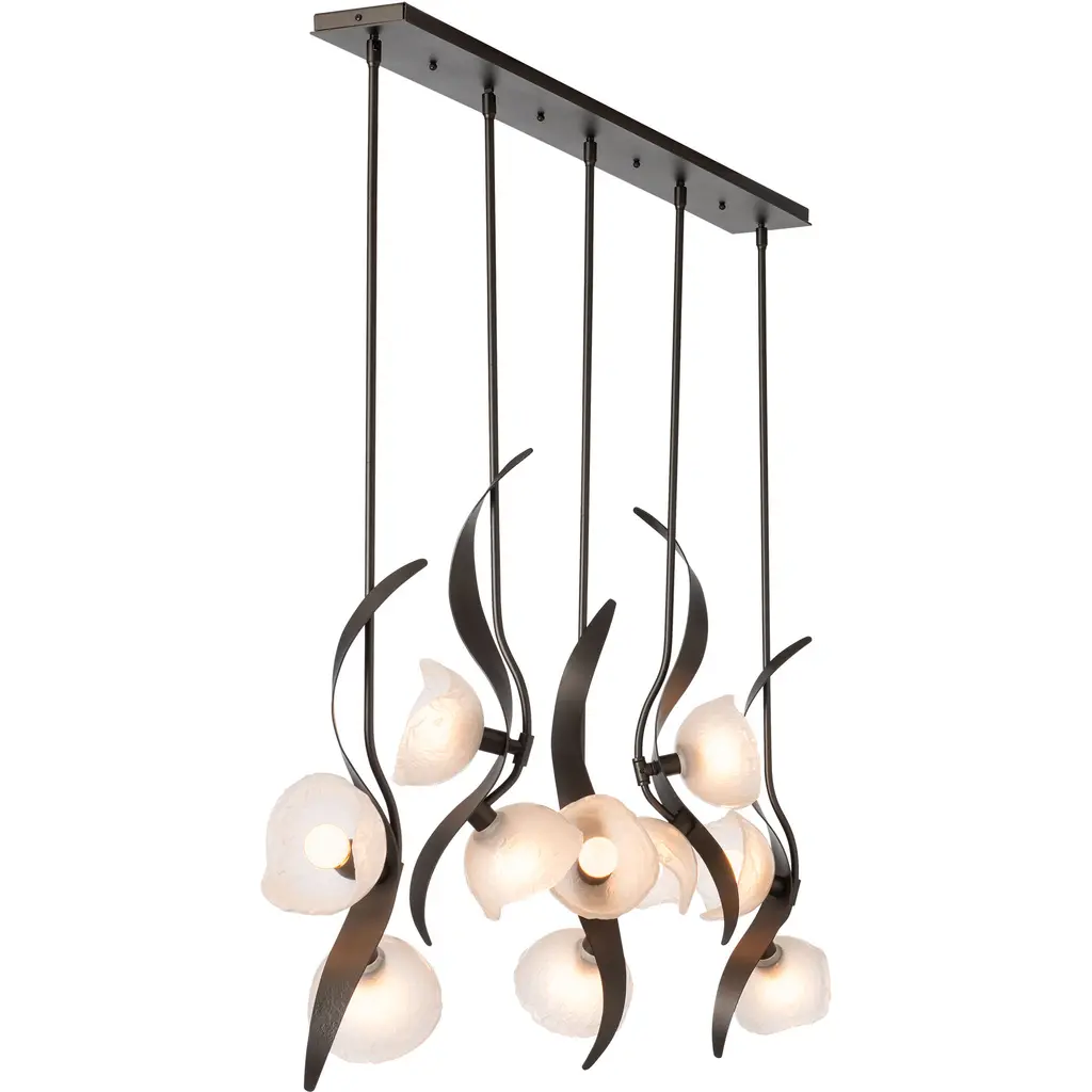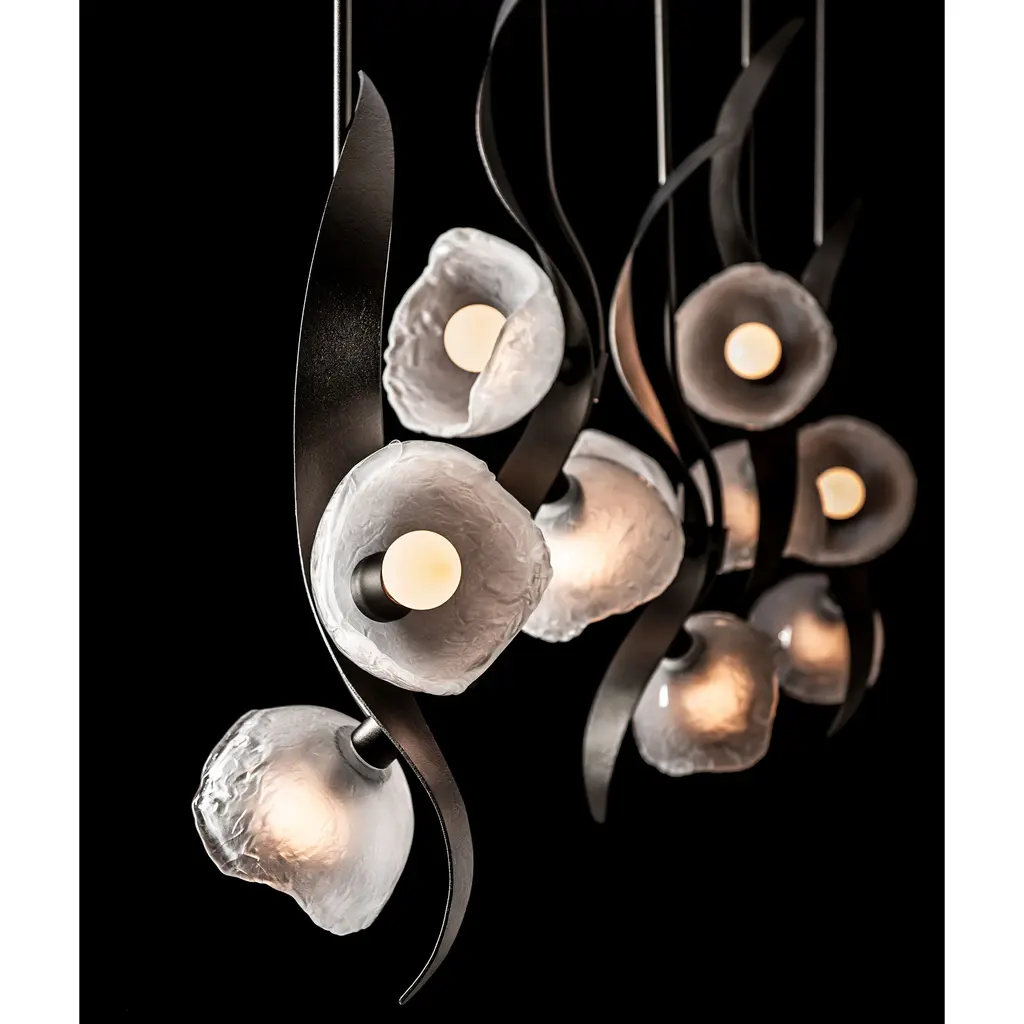 Named for Designer Ori Goldberg's talented daughter, the Mika 10-Light Pendant captures the graceful flow and movement of a young dancer through its sculptural metal design. Each steel "tige" showcases not just one, but two beautiful lights, illuminating any space with a warm and inviting glow. The Mika’s unique, handmade glass from Italy creates a stunning interplay with the hand-forged steel—a true testament to beauty and craftsmanship.