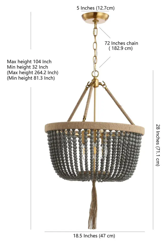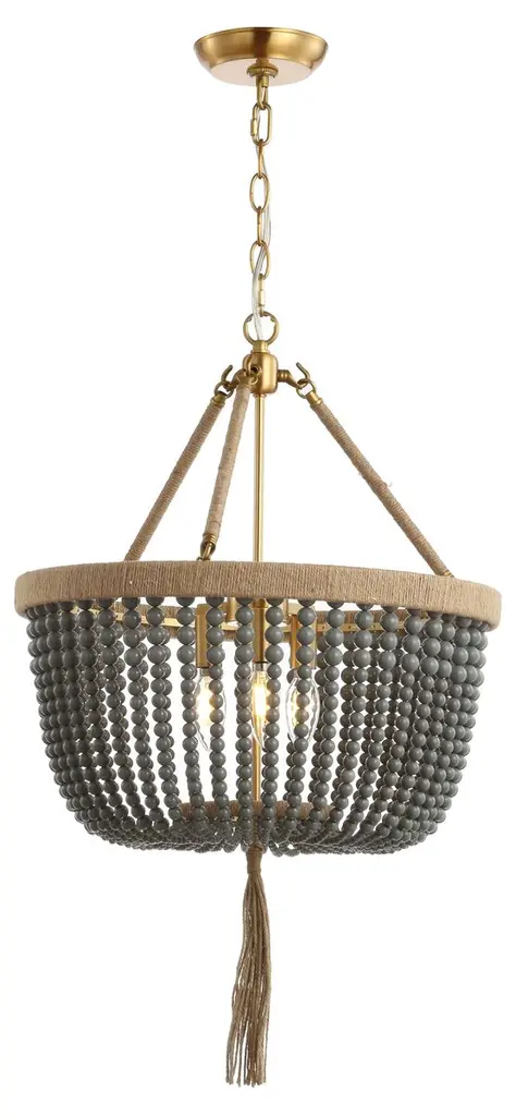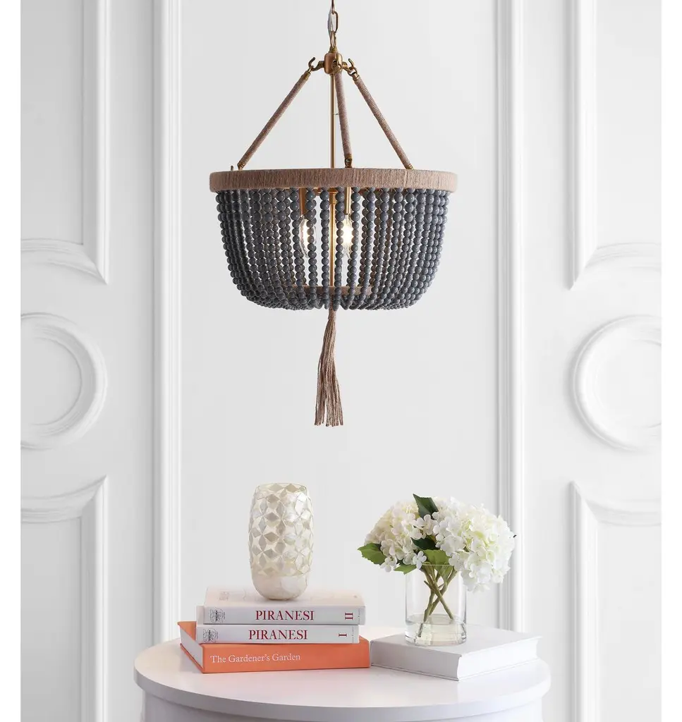 The epitome of organic elegance, this pendant displays a classic silhouette, with gray beads in lieu of crystals. The rope-wrapped frame and rope tassel add earthy texture. Hardwired.
