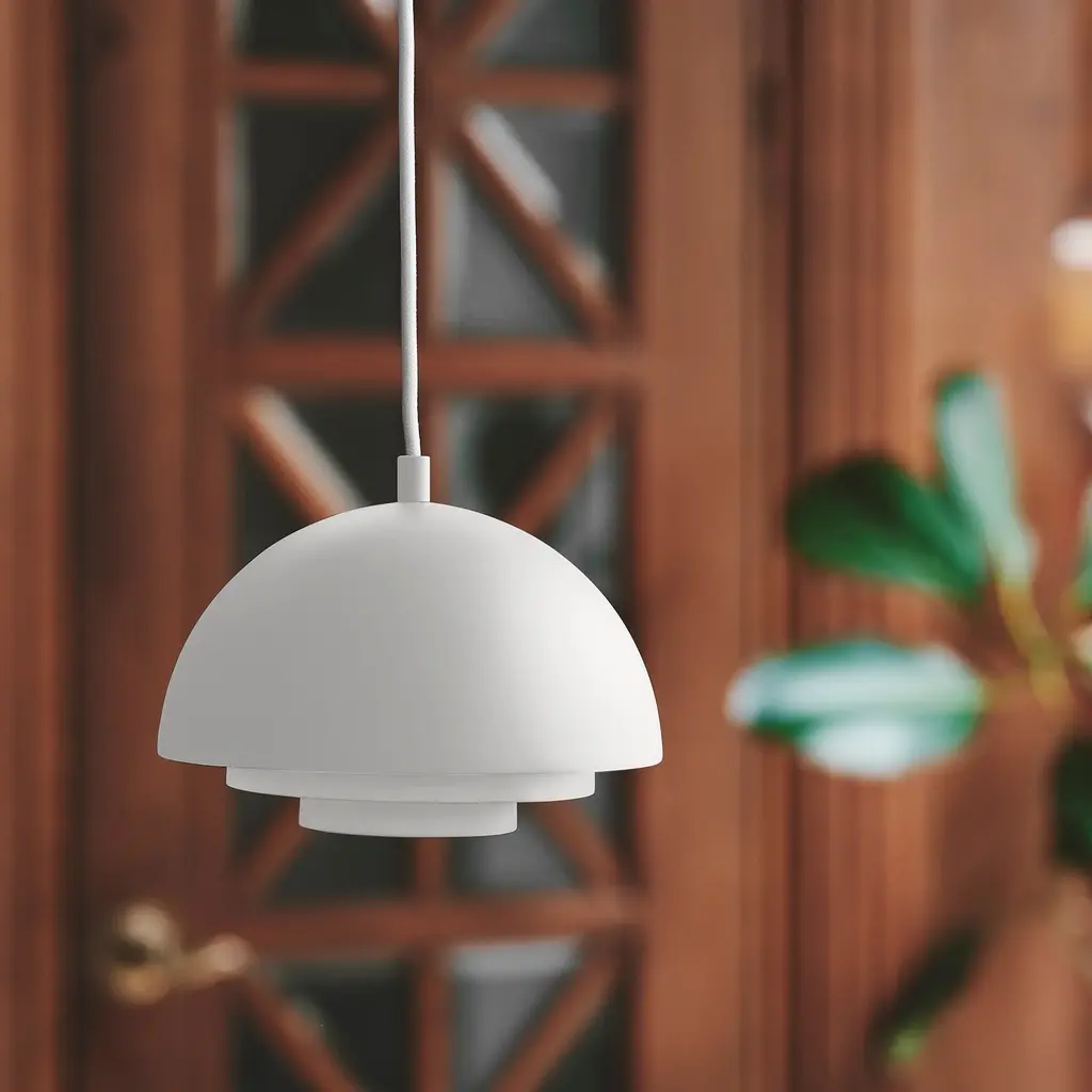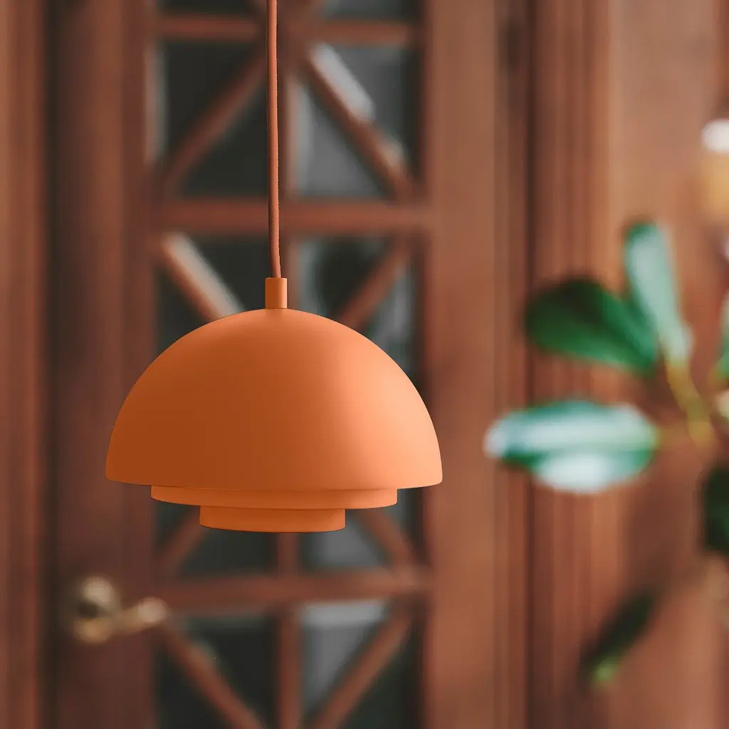 The Milieu Colour Mini Pendant features a multi-layered hemispherical shape that creates a soft, non-dazzling light effect. Inspired by the designer's passion for flying and skydiving, the design resembles a parachute unfolding gracefully. Available in various color combinations, including Clear White and Matt Black with Brass accents, the pendant is suitable for dining areas, living rooms, or hallways.