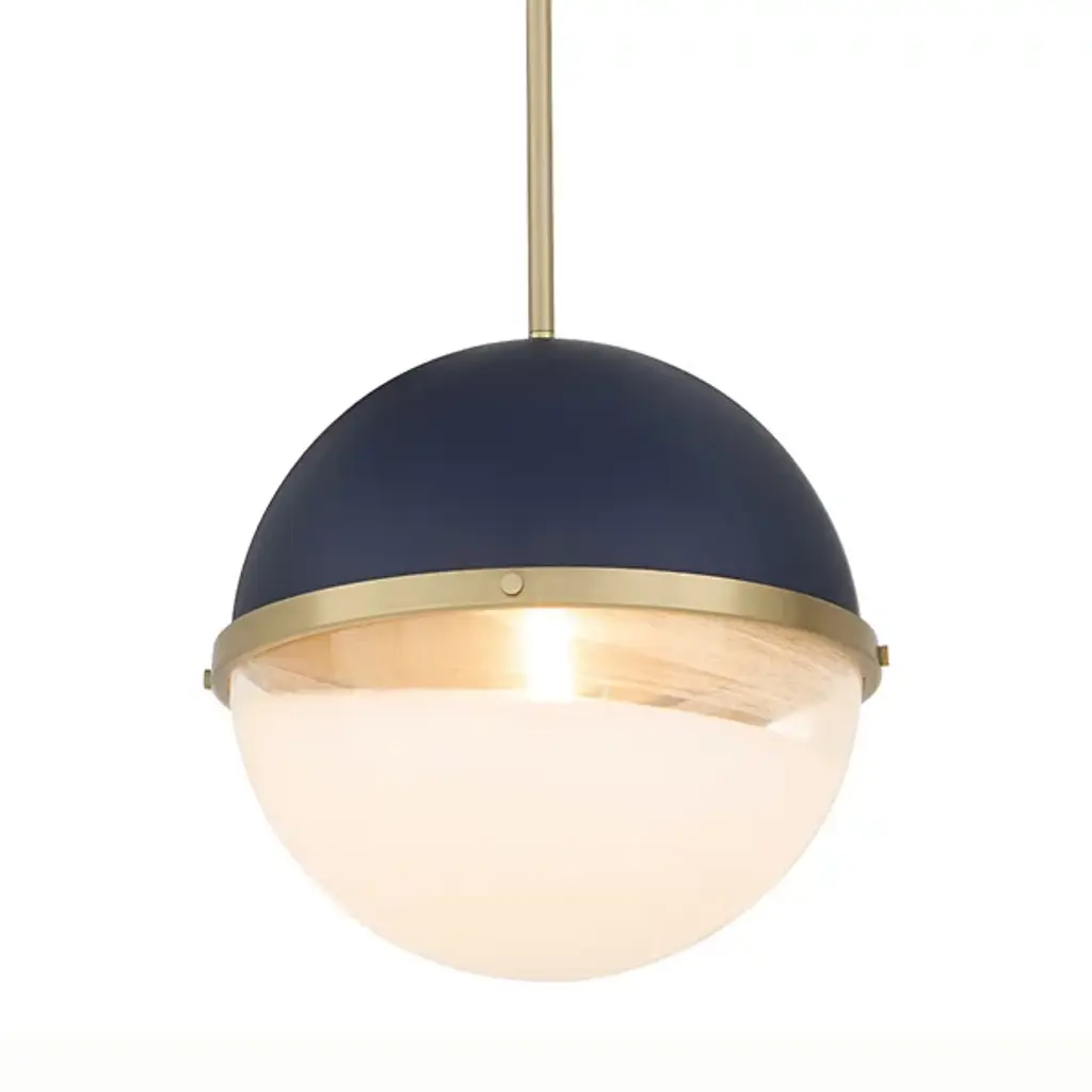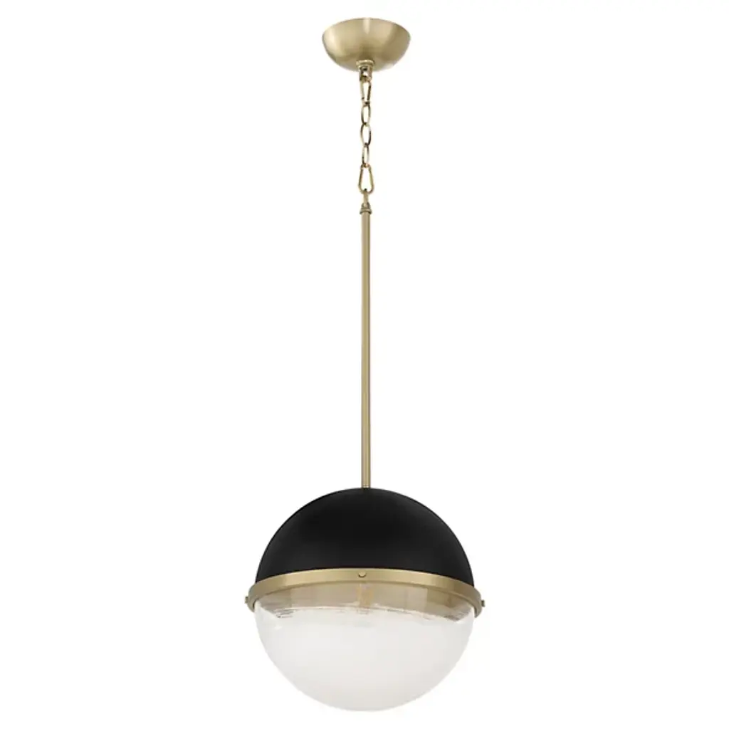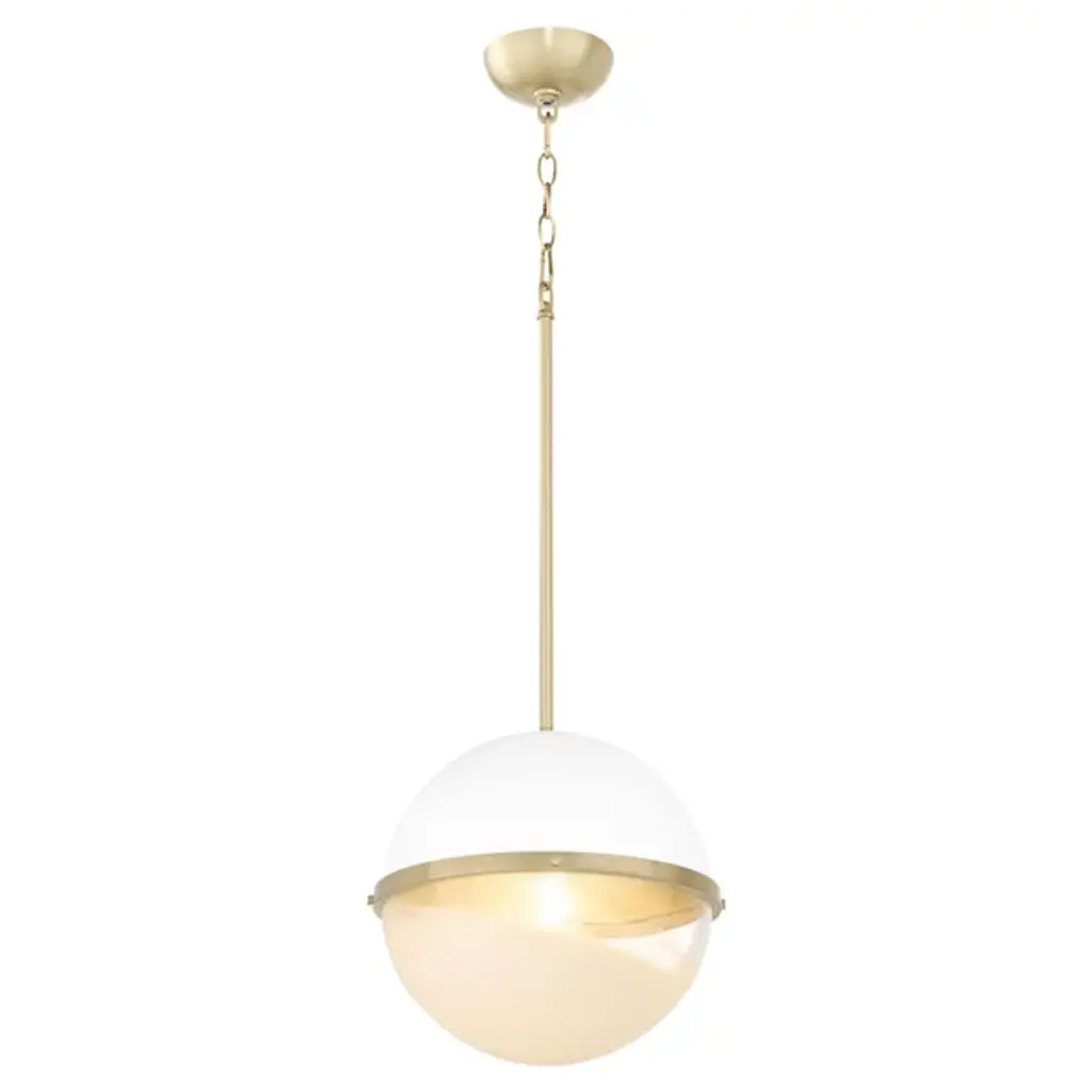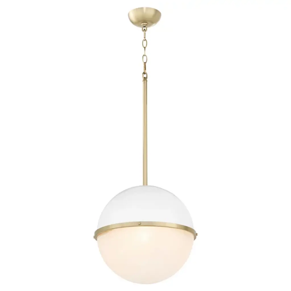The Milk Glass Pendant from Quorum International divides its spherical shade into two distinct sections. A vintage-style capture ring separates the studio cap from the milky glass base, creating a unique two-part look. Decorative screws add period-authentic details that match the aged brass chain and stem. Featuring adjustable hanging length, this dimmable pendant fits naturally in spaces that mix old and new elements. The design pulls inspiration from industrial heritage while staying current enough for today's homes.