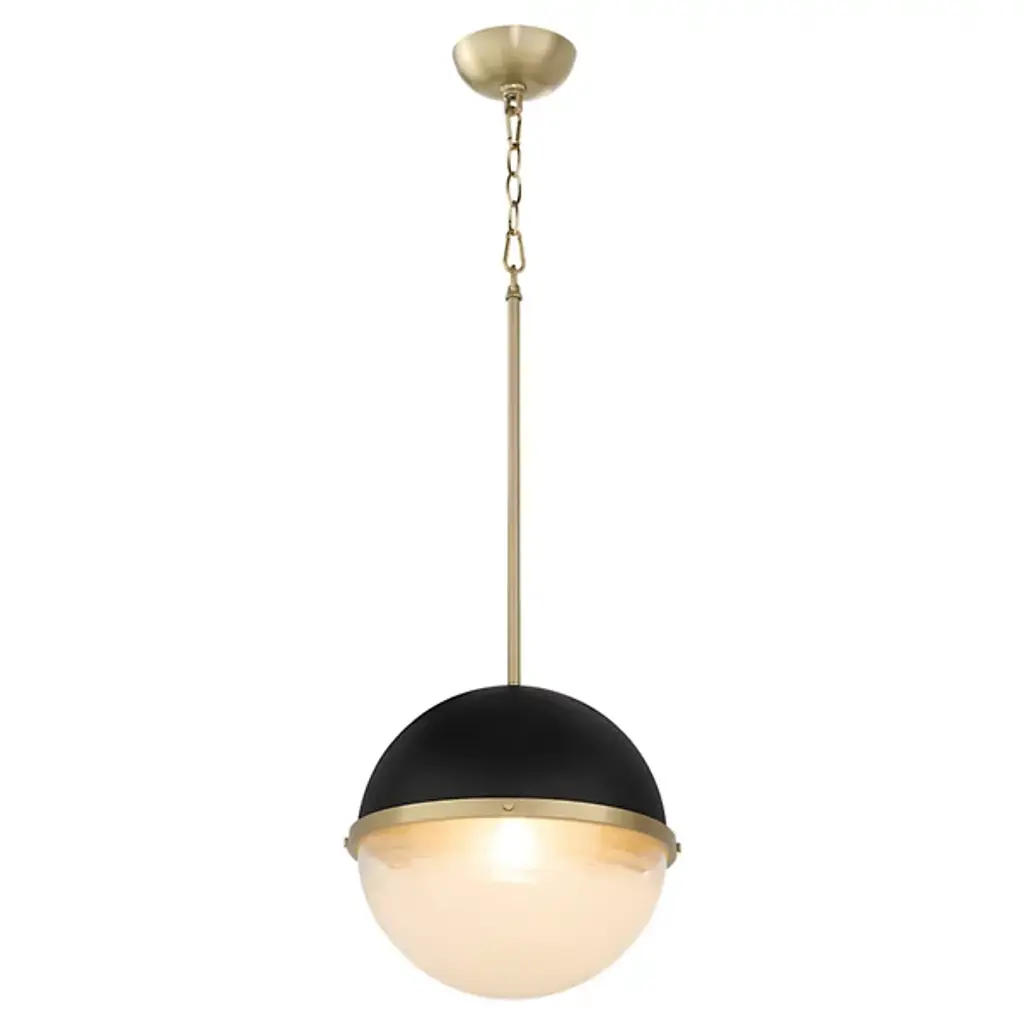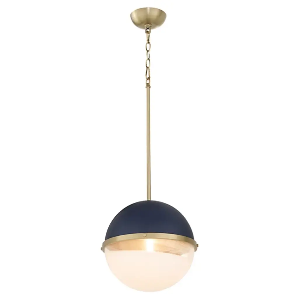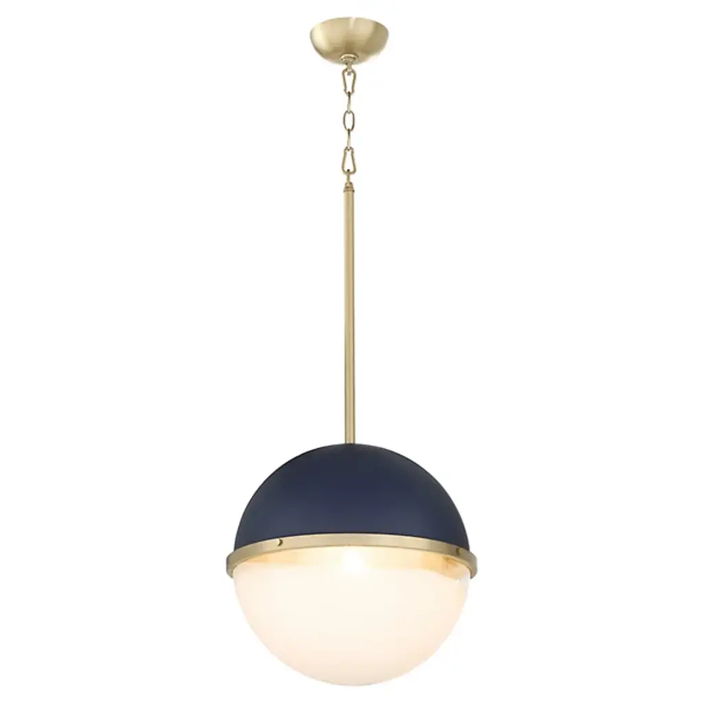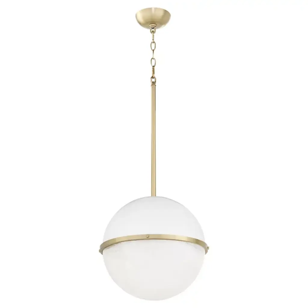 The Milk Glass Pendant from Quorum International divides its spherical shade into two distinct sections. A vintage-style capture ring separates the studio cap from the milky glass base, creating a unique two-part look. Decorative screws add period-authentic details that match the aged brass chain and stem. Featuring adjustable hanging length, this dimmable pendant fits naturally in spaces that mix old and new elements. The design pulls inspiration from industrial heritage while staying current enough for today's homes.