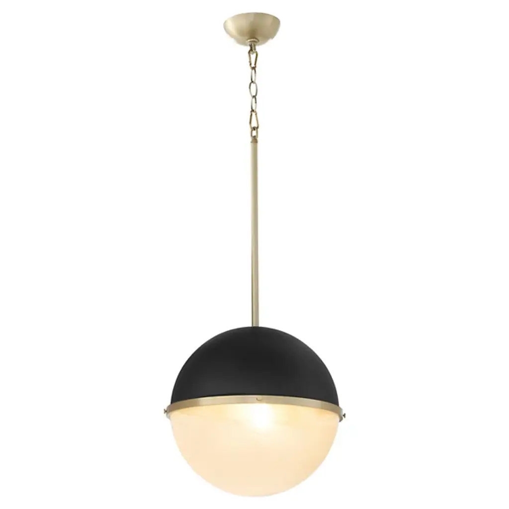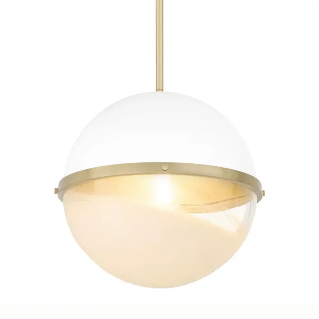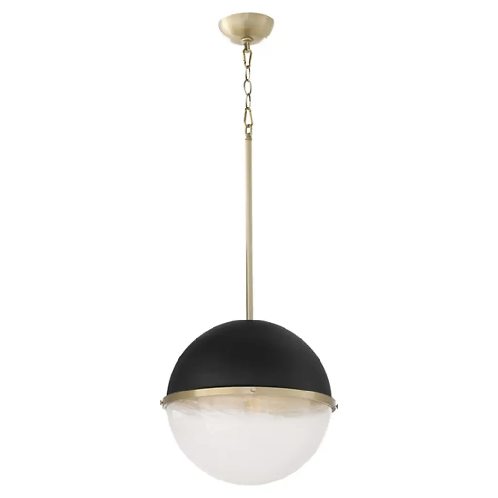 The Milk Glass Pendant from Quorum International divides its spherical shade into two distinct sections. A vintage-style capture ring separates the studio cap from the milky glass base, creating a unique two-part look. Decorative screws add period-authentic details that match the aged brass chain and stem. Featuring adjustable hanging length, this dimmable pendant fits naturally in spaces that mix old and new elements. The design pulls inspiration from industrial heritage while staying current enough for today's homes.