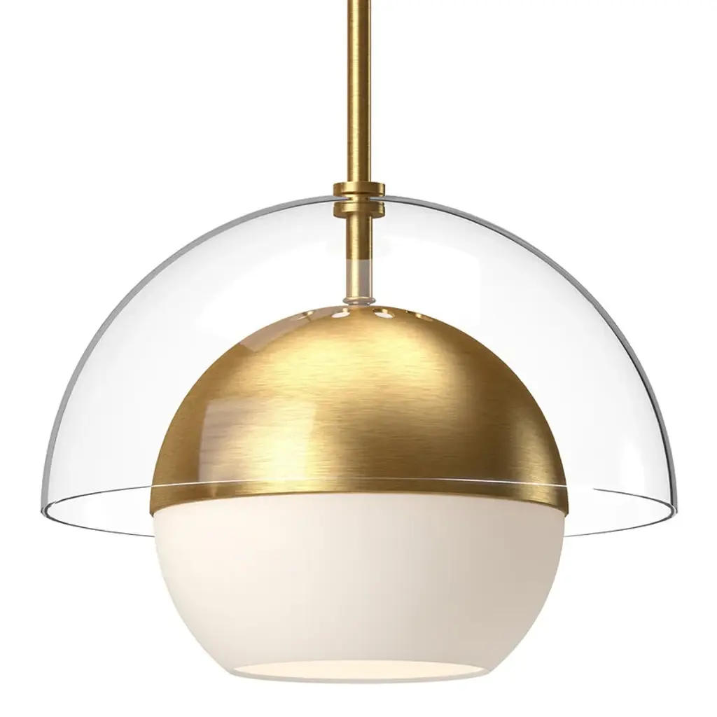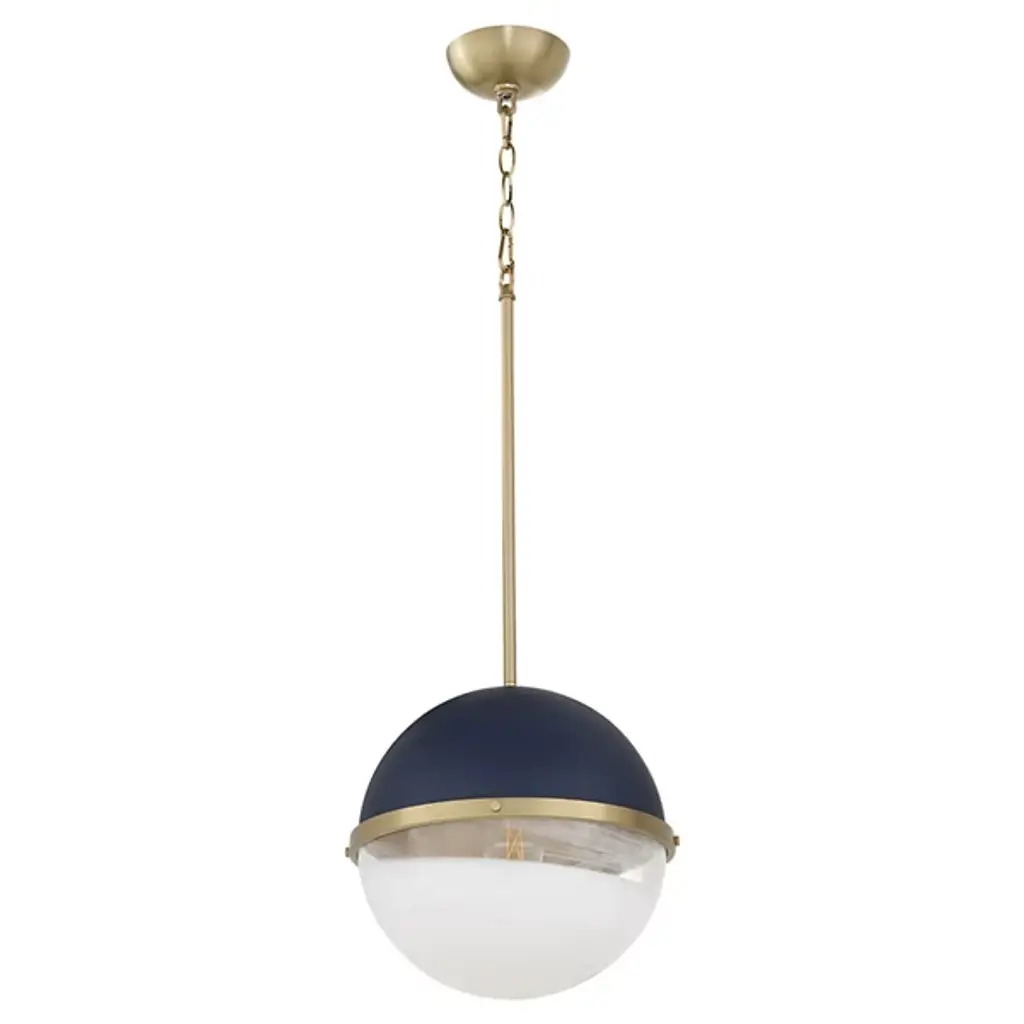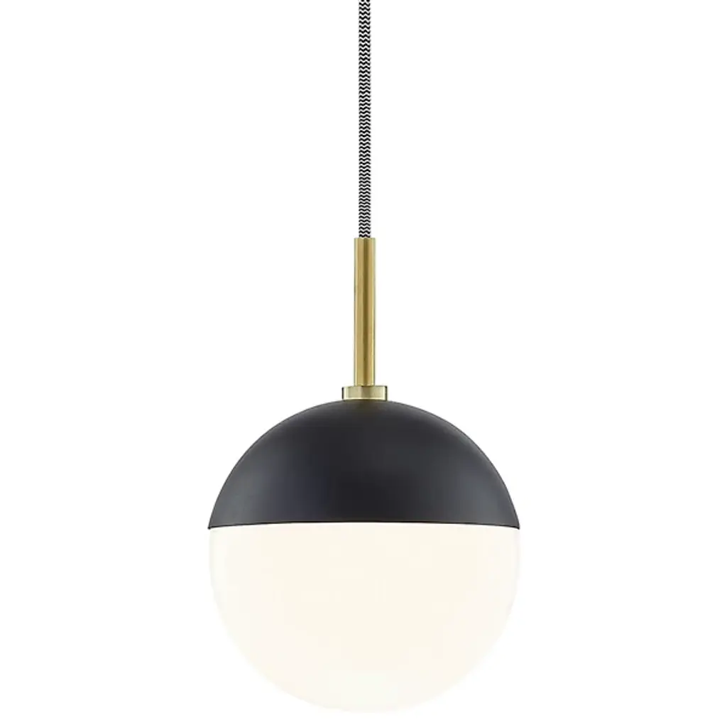 The Milk Glass Pendant from Quorum International divides its spherical shade into two distinct sections. A vintage-style capture ring separates the studio cap from the milky glass base, creating a unique two-part look. Decorative screws add period-authentic details that match the aged brass chain and stem. Featuring adjustable hanging length, this dimmable pendant fits naturally in spaces that mix old and new elements. The design pulls inspiration from industrial heritage while staying current enough for today's homes.