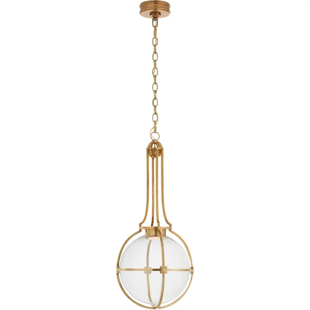 Functional lighting meets geometric design in the Mill Pendant by Visual Comfort Signature, formerly known as Visual Comfort, Its spherical body consists of artisan-sculpted metal framework, denoting the familiar longitudinal and latitudinal lines of a globe. A low-profile candelabra sits at the center of the sphere, providing a dynamic illumination that shifts with your perspective.