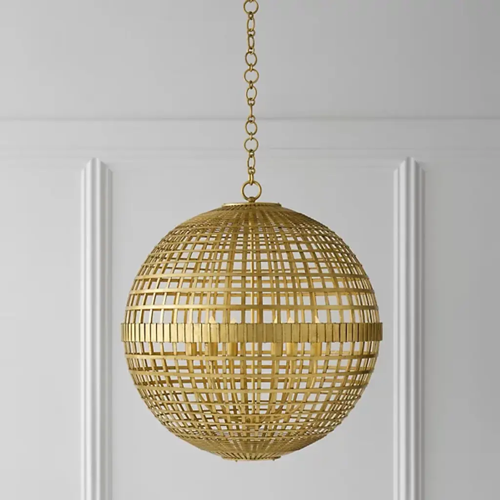 Functional lighting meets geometric design in the Mill Pendant by Visual Comfort Signature, formerly known as Visual Comfort, Its spherical body consists of artisan-sculpted metal framework, denoting the familiar longitudinal and latitudinal lines of a globe. A low-profile candelabra sits at the center of the sphere, providing a dynamic illumination that shifts with your perspective.