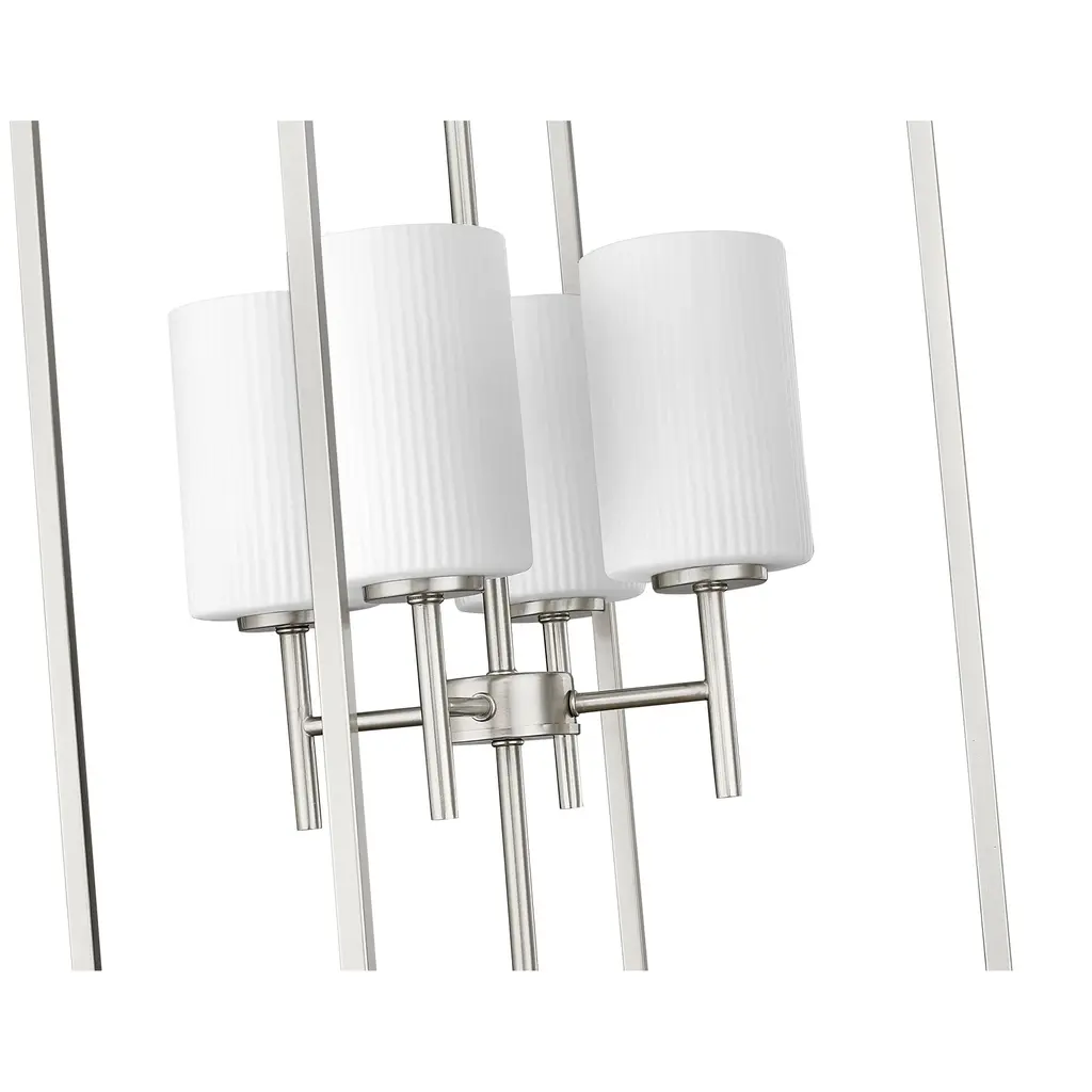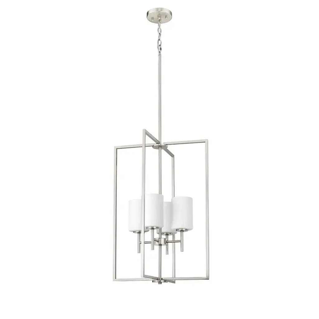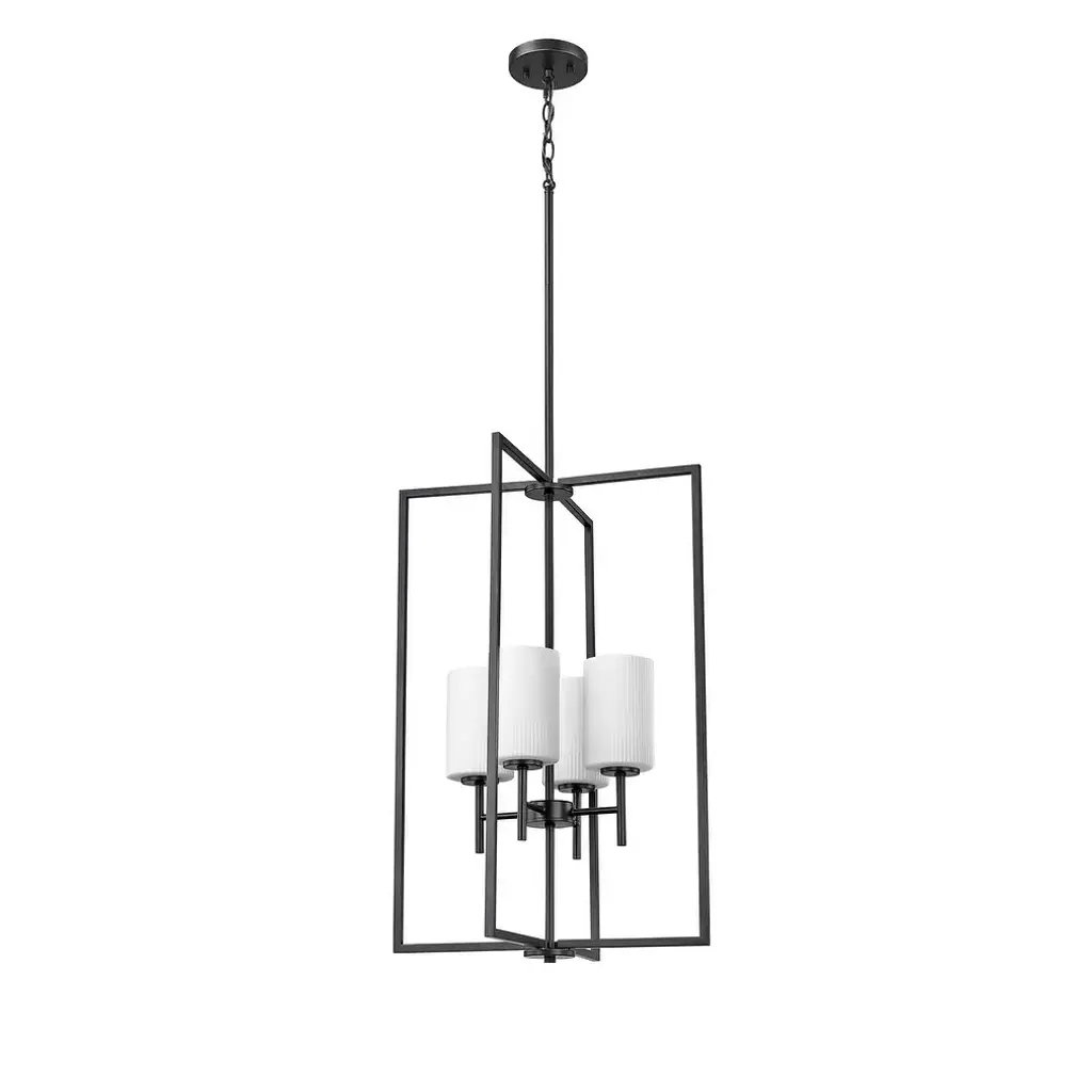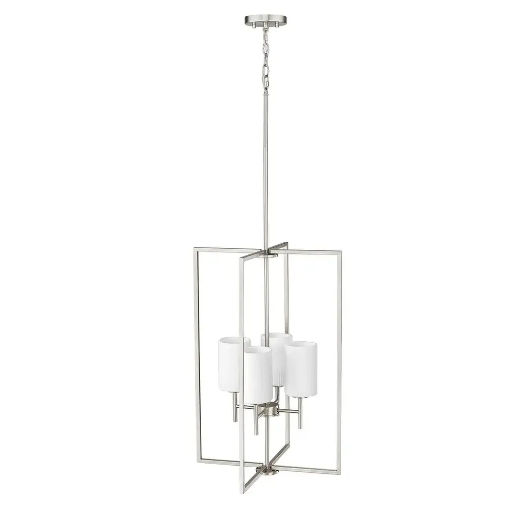 A true statement piece for any kitchen or entryway, the Luxx family of pendant lighting incorporates angular lines to provide a dramatic framework for the 4-lights and the ribbed etched, opal white glass globes. Available in either matte black or brushed nickel, the profile evokes a dramatic and contemporary homage to classic suspended-style lanterns.Features:Dimensions:Electrical Specifications: