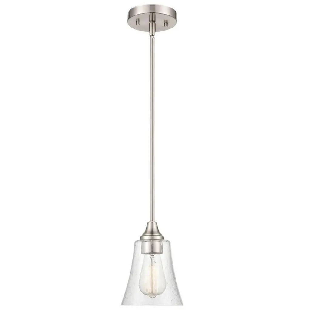 Collection: Caily, Finish Color: Brushed Nickel, Width: 5.75", Height: 46.25", Number Of Bulbs: 1, Wattage: 60 Watts, Moisture Rating: Dry Rated, Desc: Pendants are the perfect opportunity to blend a utilitarian task light with your own unique design style. Select a pendant light that will reflect not only a beautiful glow, but also your refinement and taste. Light bulbs are not included. Place this fixture over your kitchen island, dining room table or even in your hallway. Compatible with standard wall dimmer 1 year limited manufacture's warranty This item is UL listed Meets CSA standards This item is rated for dry location. Professional installation recommended. Warranty: 1 Year LimitedShade Included: Yes. ,