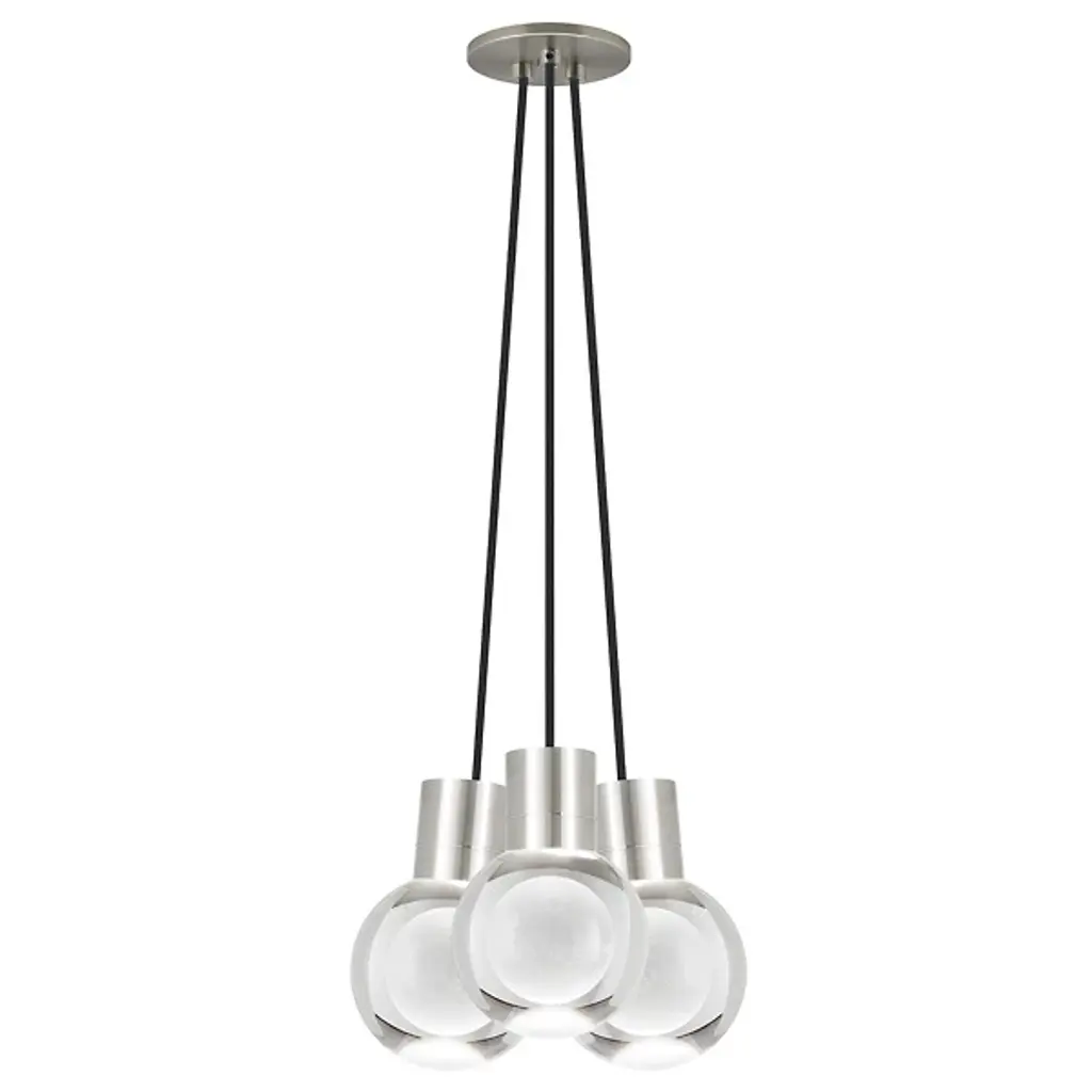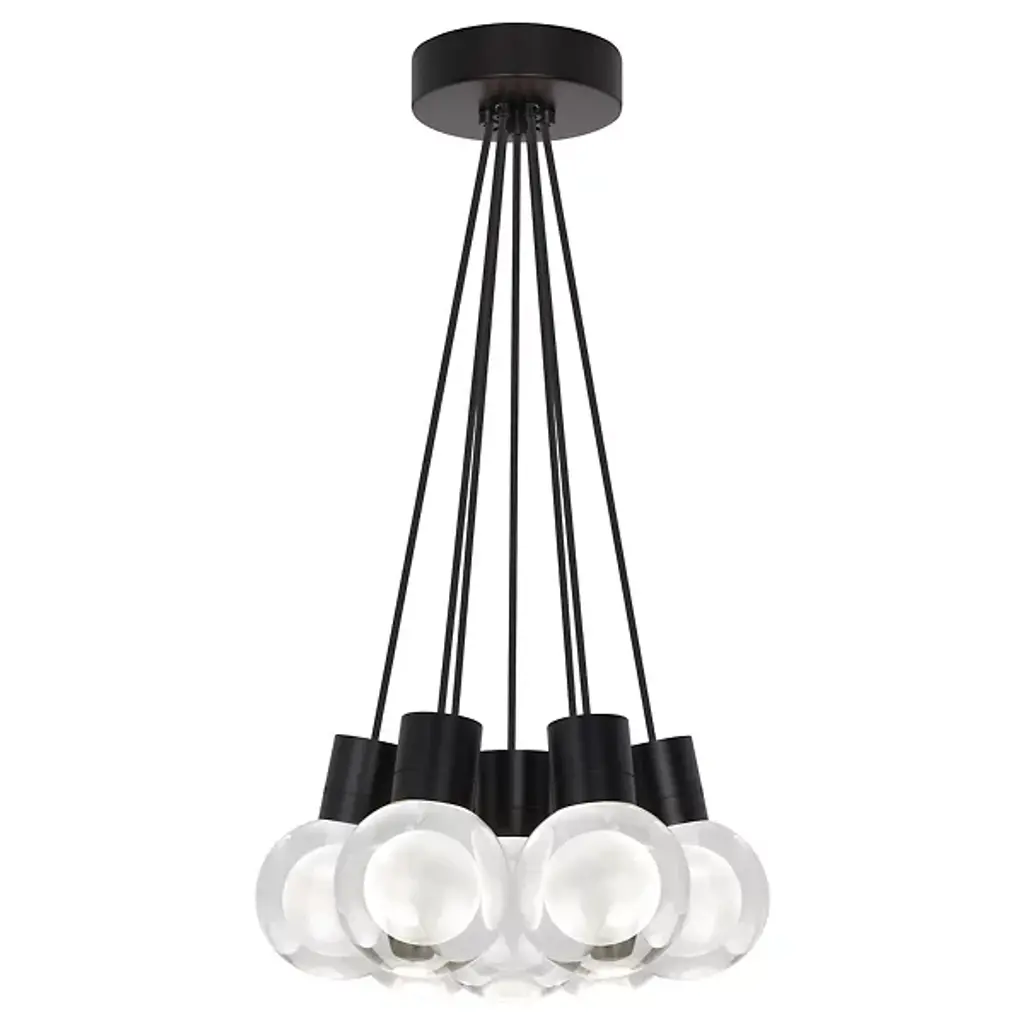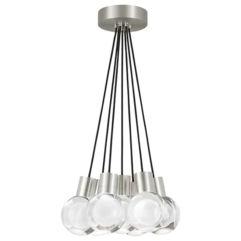 The Mina LED Multi-Light Pendant from Visual Comfort Modern offers a mix of contemporary clarity and retro character, using the force of gravity to assemble a dynamic design of slim cables and rounded geometrical elements. Designed by Sean Lavin, its smooth metal canopy extends slim, field-cuttable cables to rounded collars that hold efficient LED lights, each one placed within a thick glass sphere shade. The thick glass reduces direct light, transforming it into even warmth, while each shade sits against others, separating the metal collars and creating a bubbly, approachable appearance.