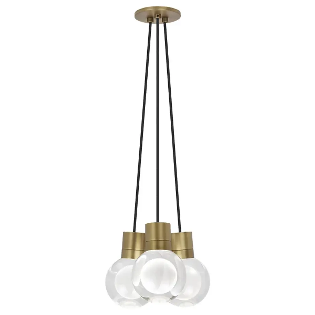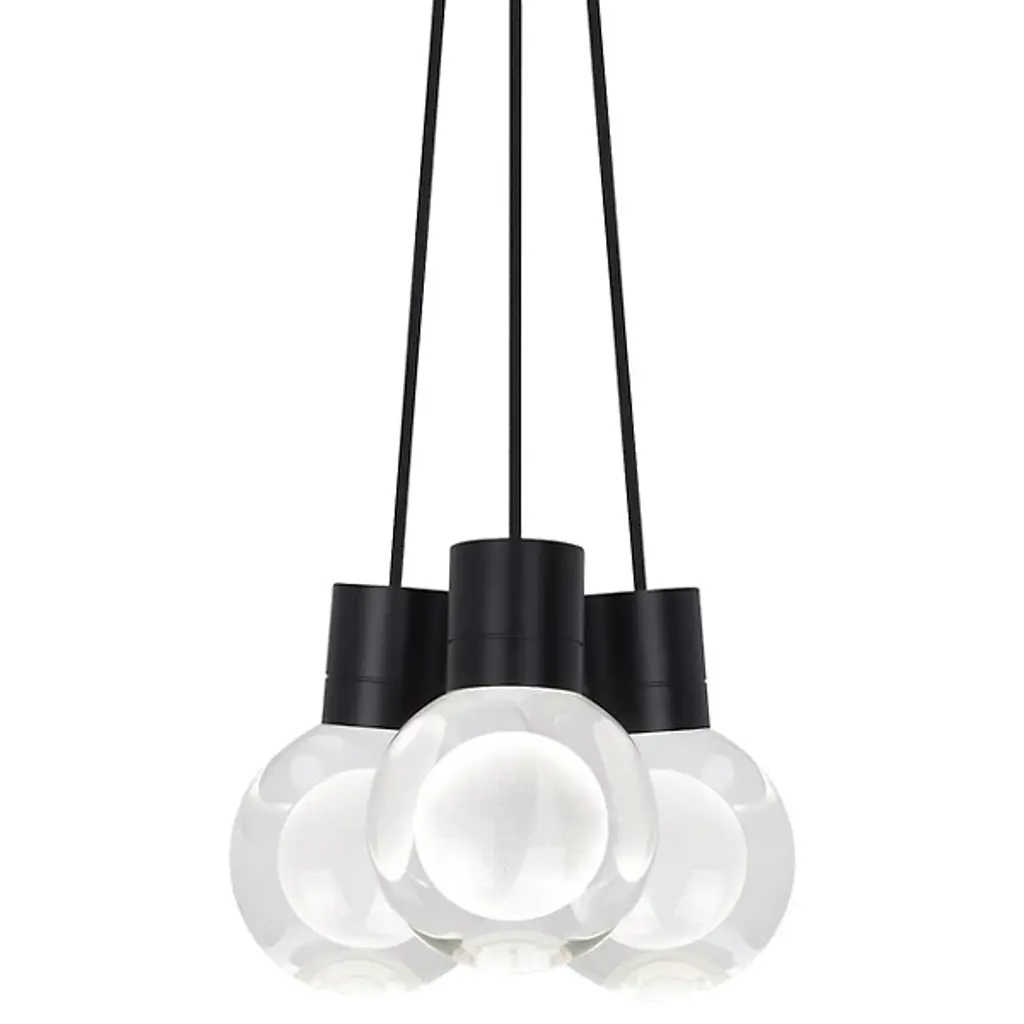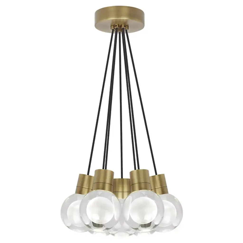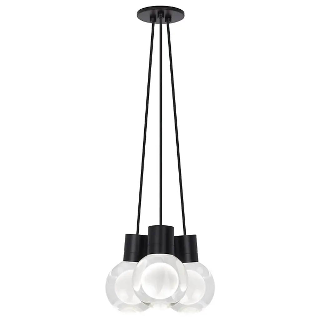 The Mina LED Multi-Light Pendant from Visual Comfort Modern offers a mix of contemporary clarity and retro character, using the force of gravity to assemble a dynamic design of slim cables and rounded geometrical elements. Designed by Sean Lavin, its smooth metal canopy extends slim, field-cuttable cables to rounded collars that hold efficient LED lights, each one placed within a thick glass sphere shade. The thick glass reduces direct light, transforming it into even warmth, while each shade sits against others, separating the metal collars and creating a bubbly, approachable appearance.