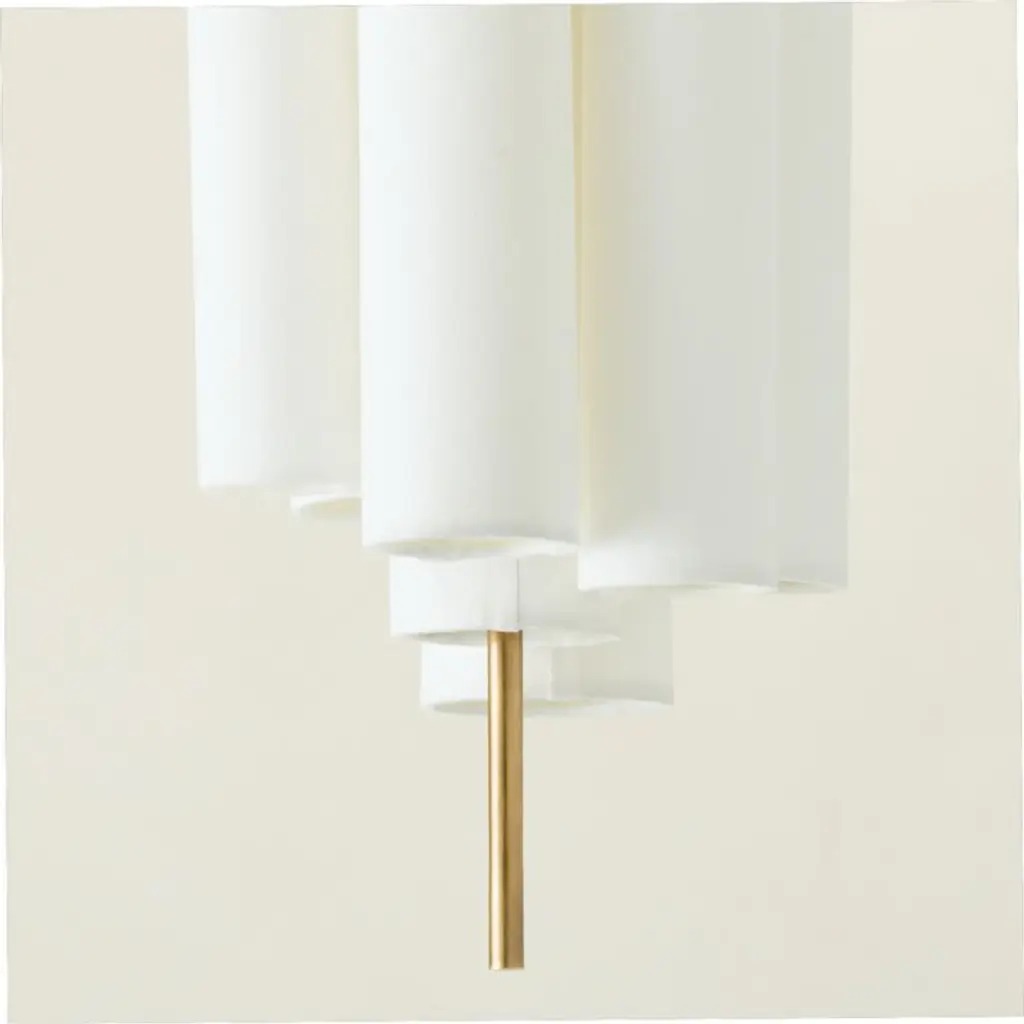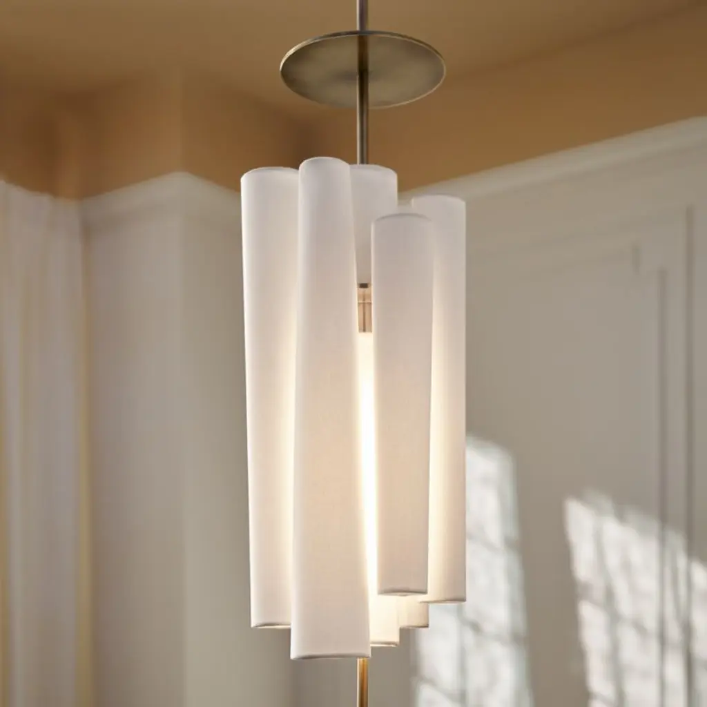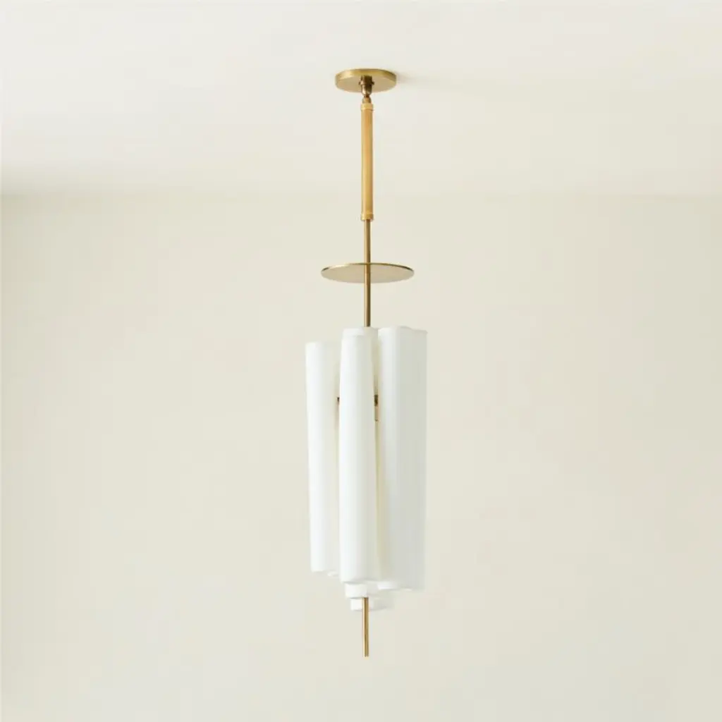Sleek linen shades make for a captivating focal point in Los Angeles-based AD100 designer Ross Cassidy's striking pendant. A work of modern art, the intricate design is suspended from a contrasting warm brass frame that is aged by hand. CB2 exclusive.