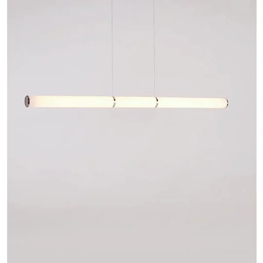 The Mini Endless Pendant Light from Roll & Hill is a simple piece designed to be architectural and adaptable. Designed by Jason Miller, this piece is inspired by the look of classic ship’s masts, reimagined with a modern twist. A slender white acrylic shade in the shape of an extended tube drops from a pair of thin cables, glowing warmly with light from integrated LEDs. Sleek metal bands accent the piece while matching ends cap either side of the shade.