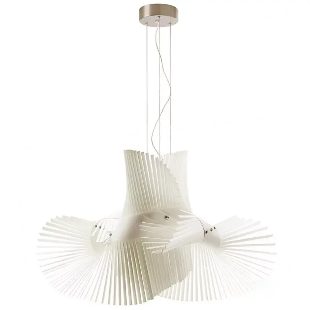 The LZF Mini Mikado Pendant is composed of two die-cut sheets of wood veneer, mounted in a pattern that lends torsion and dynamism. Like entwined feathers, the stamped strips create a pliable shape in the air that is charged with sensuality, creating an overall airiness and interesting plays of light and shadow. The Mini Mikado Pendant features a Natural timber wood veneer shade in a variety of colors and Nickel canopy.