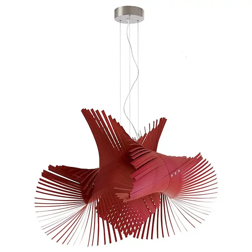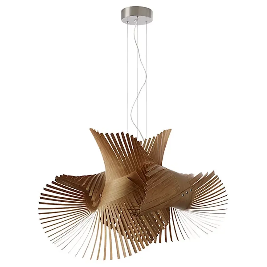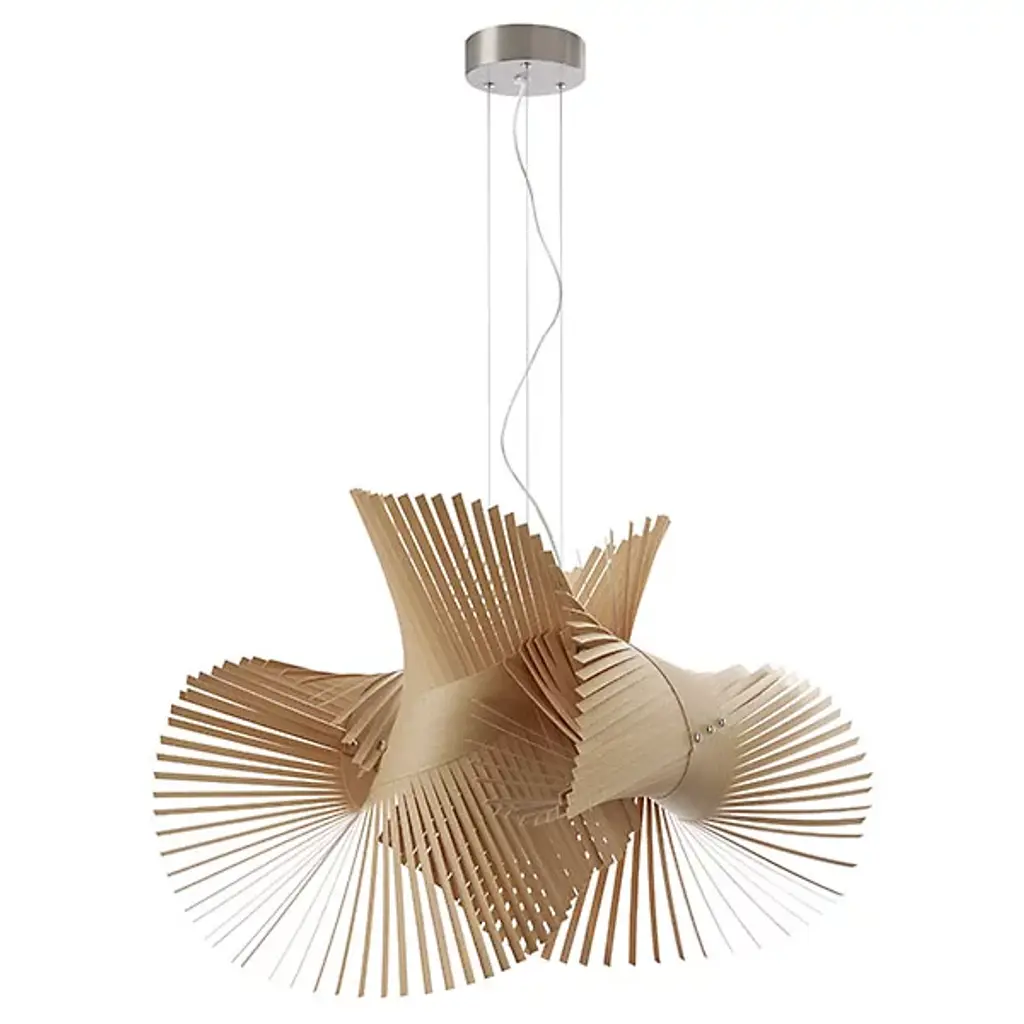 The LZF Mini Mikado Pendant is composed of two die-cut sheets of wood veneer, mounted in a pattern that lends torsion and dynamism. Like entwined feathers, the stamped strips create a pliable shape in the air that is charged with sensuality, creating an overall airiness and interesting plays of light and shadow. The Mini Mikado Pendant features a Natural timber wood veneer shade in a variety of colors and Nickel canopy.