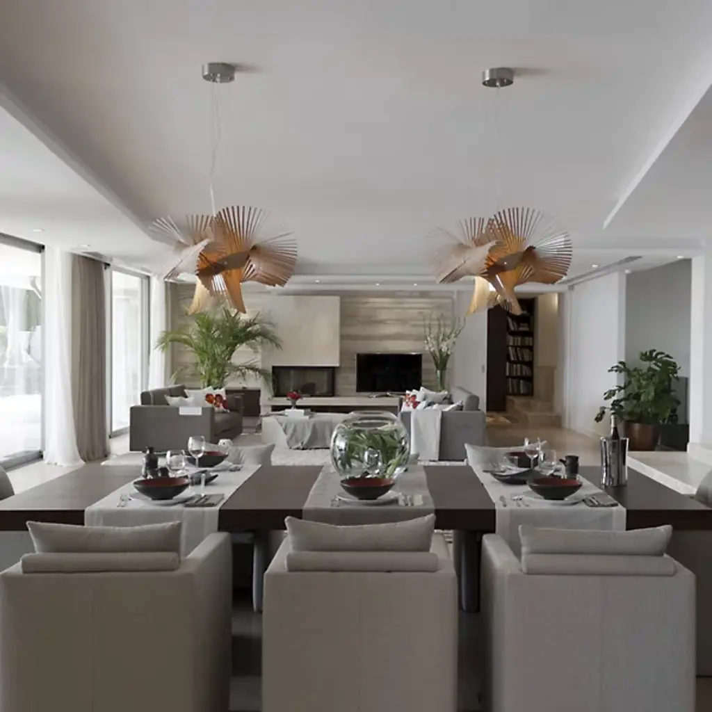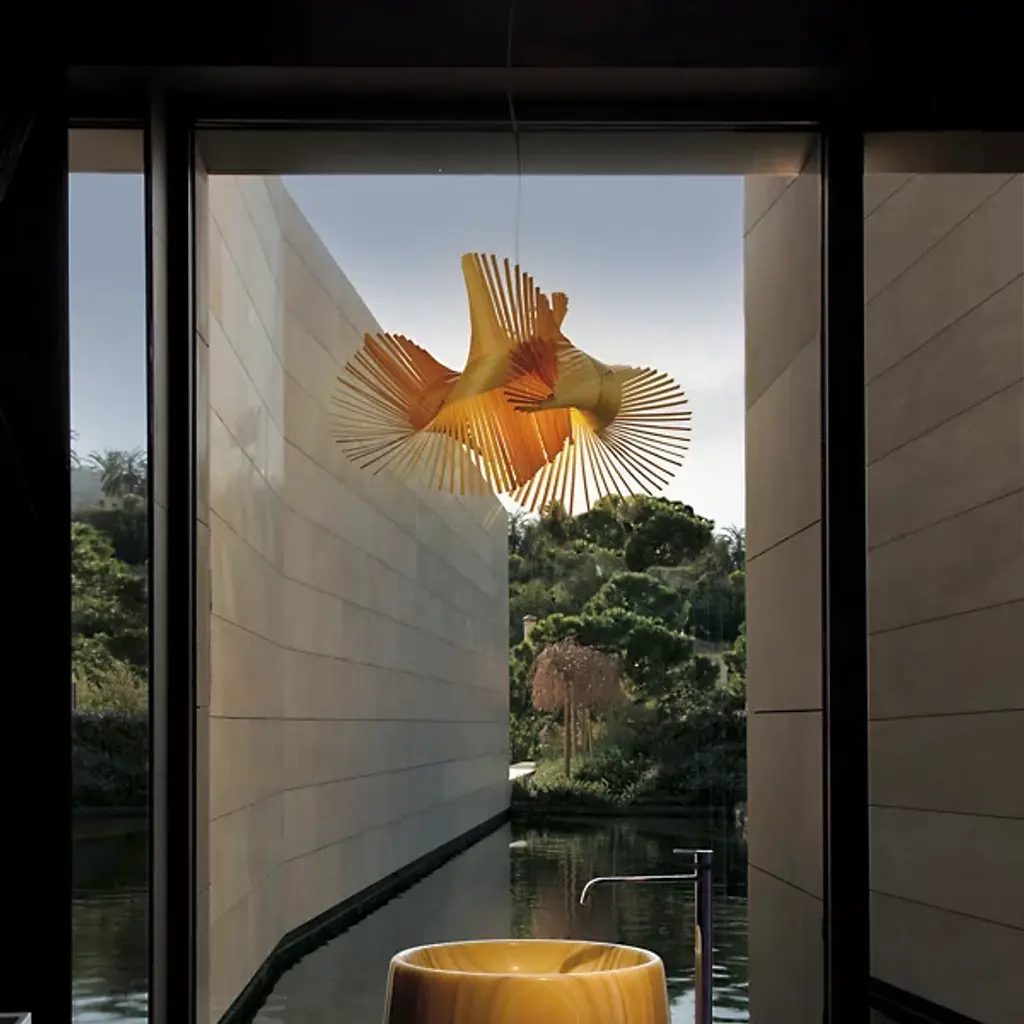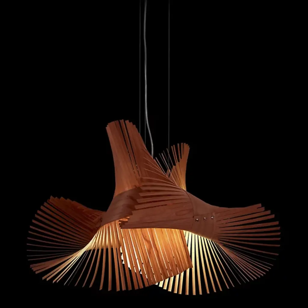 The LZF Mini Mikado Pendant is composed of two die-cut sheets of wood veneer, mounted in a pattern that lends torsion and dynamism. Like entwined feathers, the stamped strips create a pliable shape in the air that is charged with sensuality, creating an overall airiness and interesting plays of light and shadow. The Mini Mikado Pendant features a Natural timber wood veneer shade in a variety of colors and Nickel canopy.
