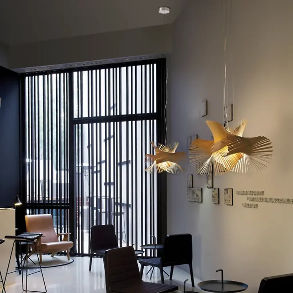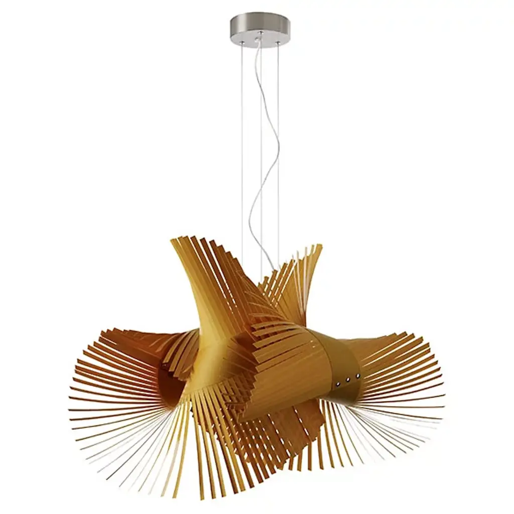 The LZF Mini Mikado Pendant is composed of two die-cut sheets of wood veneer, mounted in a pattern that lends torsion and dynamism. Like entwined feathers, the stamped strips create a pliable shape in the air that is charged with sensuality, creating an overall airiness and interesting plays of light and shadow. The Mini Mikado Pendant features a Natural timber wood veneer shade in a variety of colors and Nickel canopy.