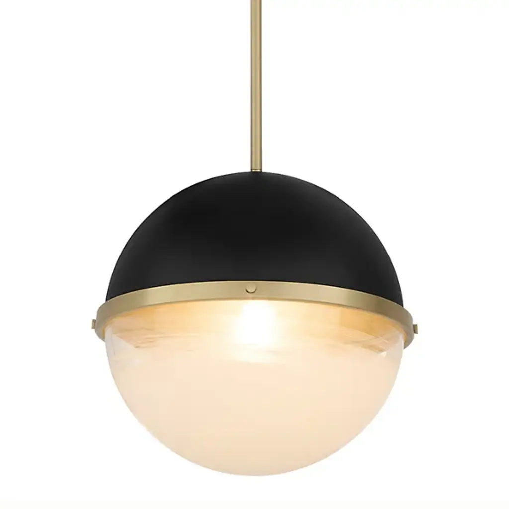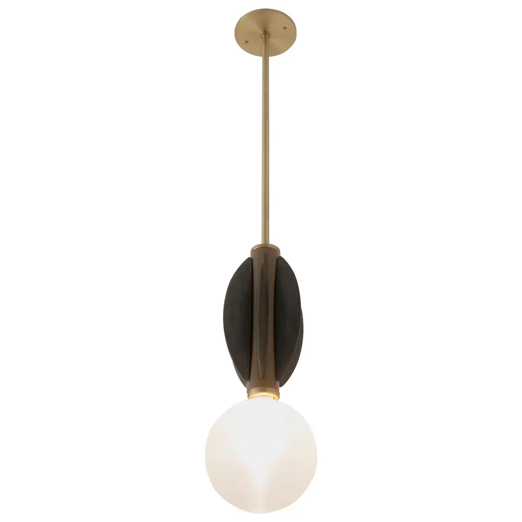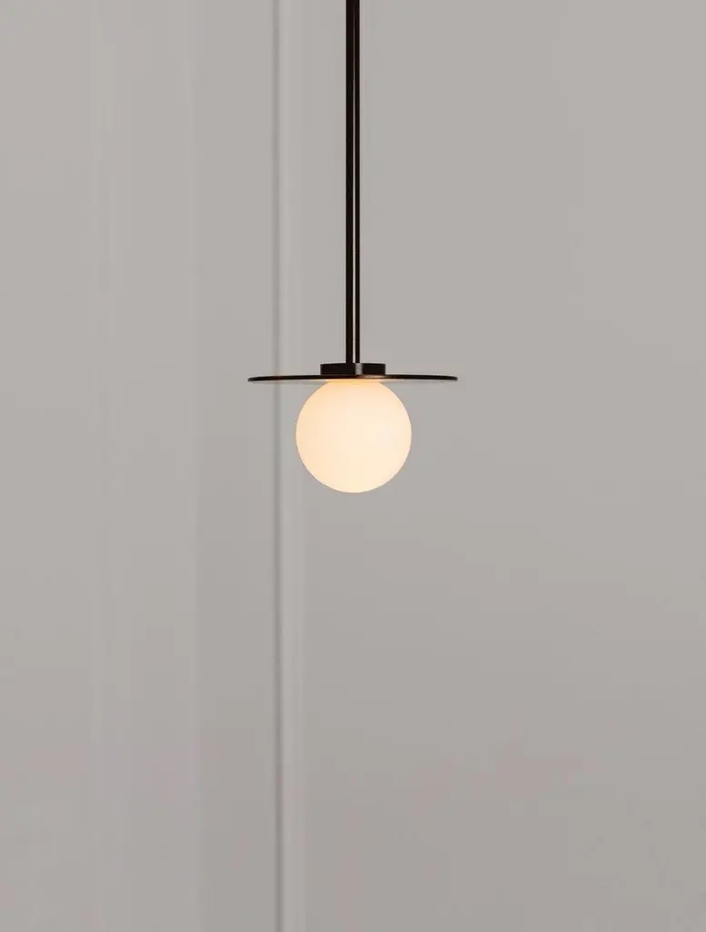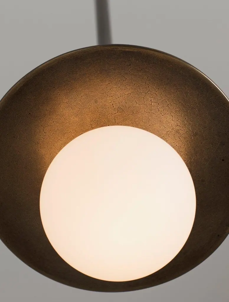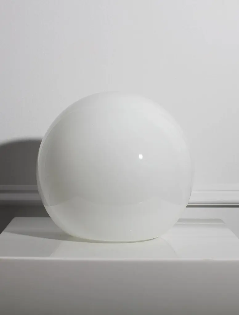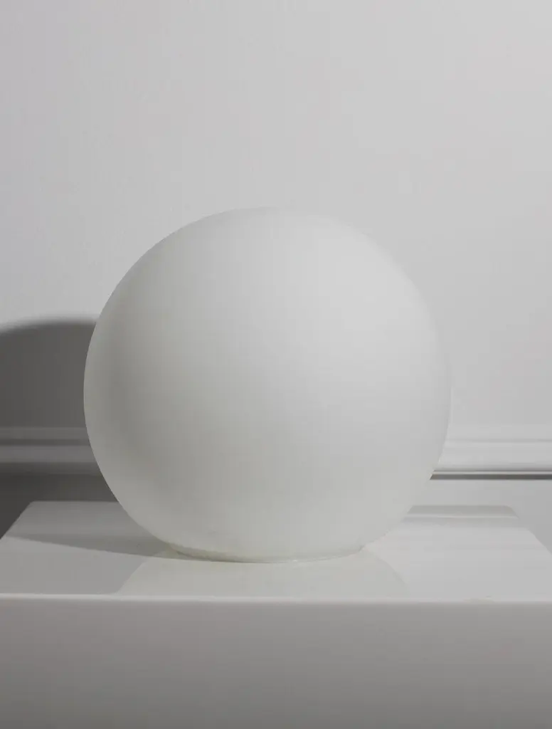 A mouth-blown glass globe sits flush on a cast-brass disc. Hardware disappears, and the sphere becomes mysteriously endless.