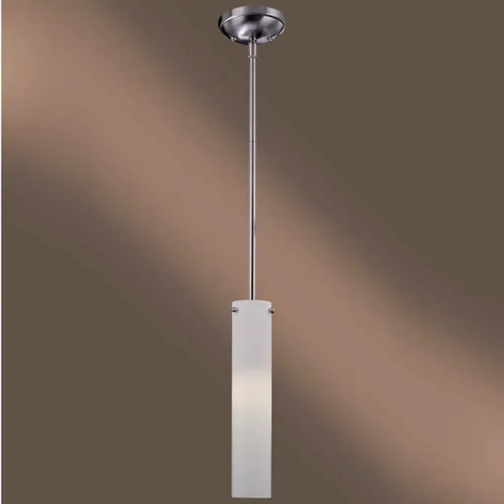 Long and lean, cool and contemporary. The Minka-Lavery Mini Pendant No. 62-84 features a cylindrical tube of Etched Opal glass that diffuses an energy efficient CFL into a cool, gentle glow. The frosty effect of the glass is complemented by the Brushed Nickel finish on the accompanying metal surfaces.