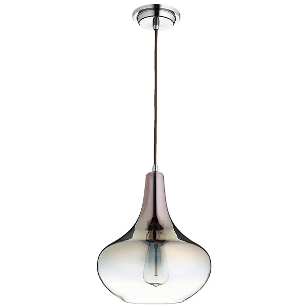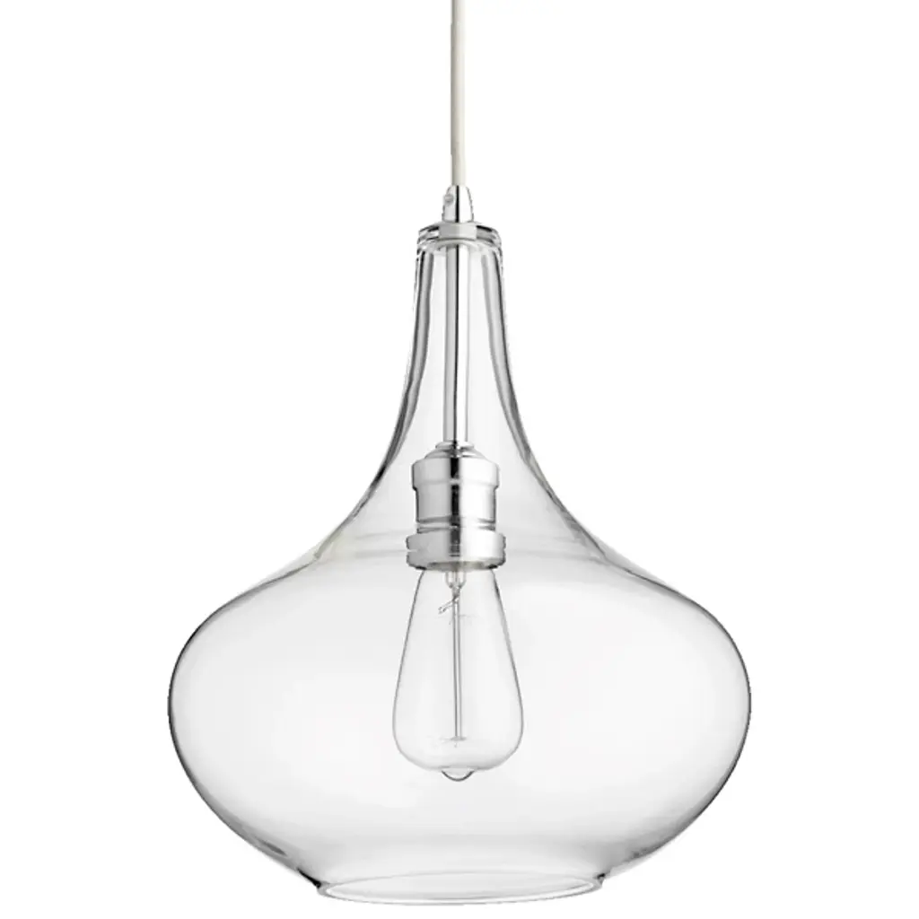 Bold style dropping in from above. Fitted with a curvy glass shade, the Mini Pendant No. 8004 by Quorum International boasts an assertive raindrop motif that satisfies any room's thirst for trendy lighting. This cool design pairs beautifully with a vintage-style filament lamp, then changes style on demand by swapping light bulb styles when it's time for a fresh new look.