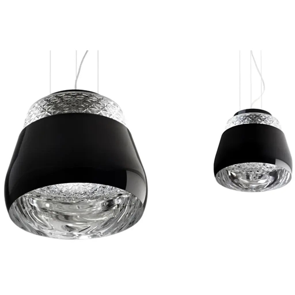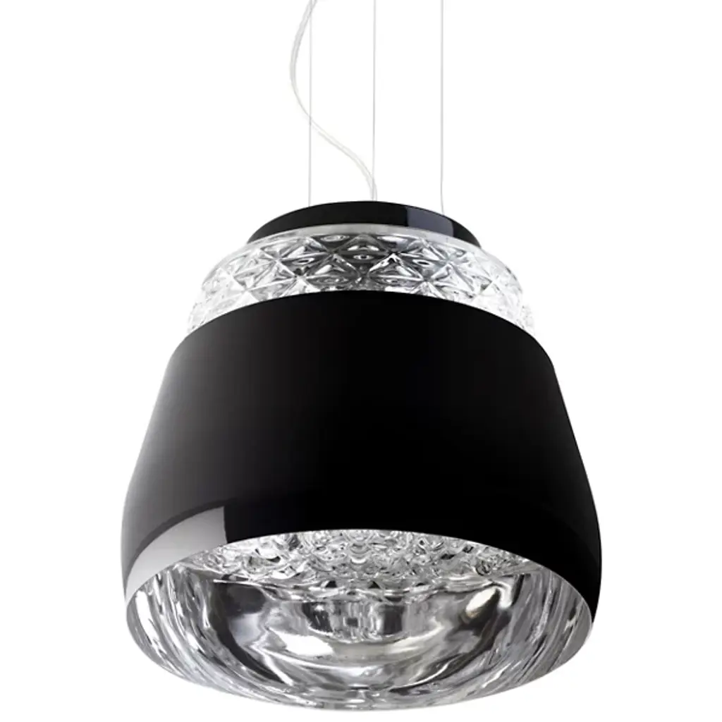 At first glance, the Marcel Wanders-designed Moooi Baby Valentine Pendant looks like a suspended, scaled down automobile headlamp. Sharing a similar optic architecture, Valentine employs a faceted blown glass diffuser intricately embellished with a lovely floral pattern, the emerging prismatic spread of light enhanced by the mirrored interior. A round ceiling canopy, matching the color of the spun metal shade, is included.