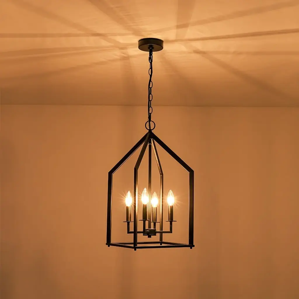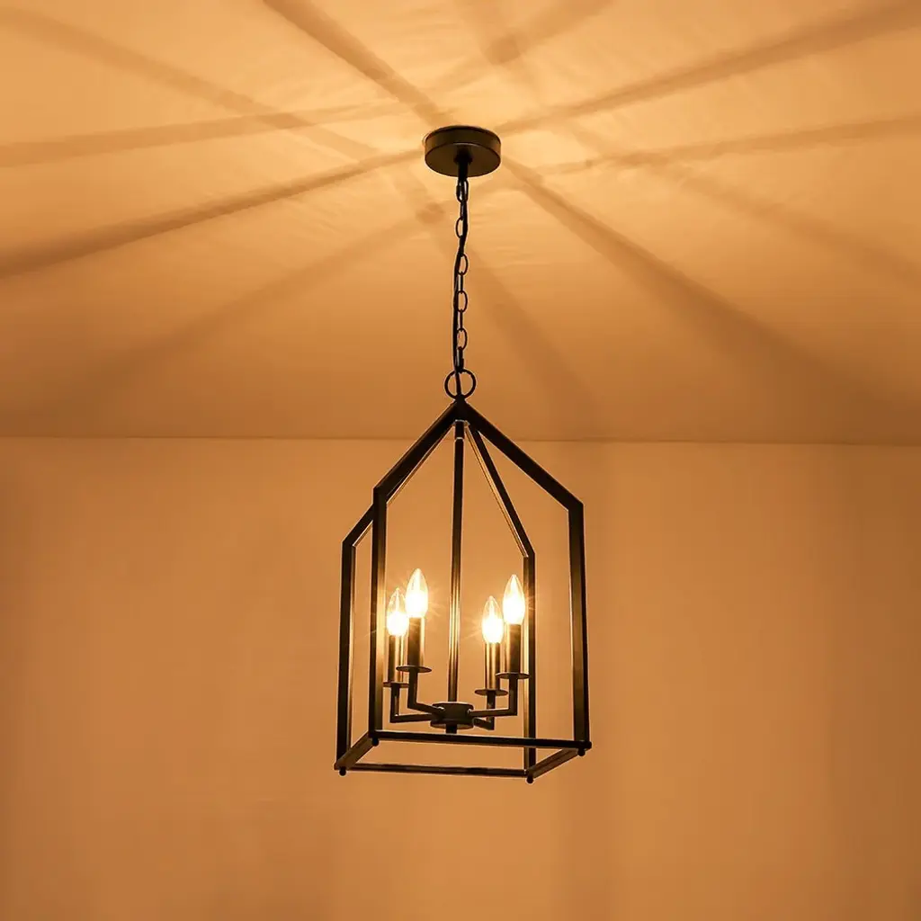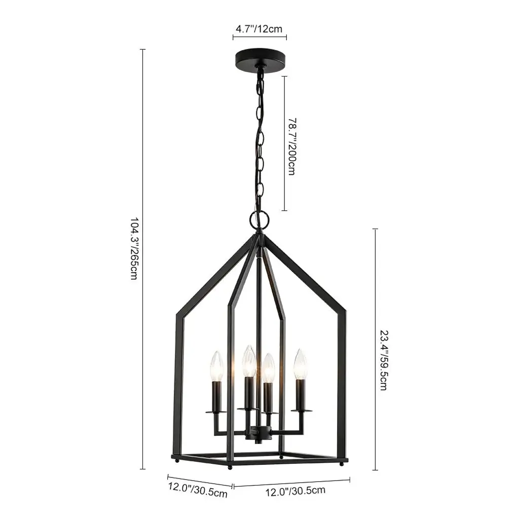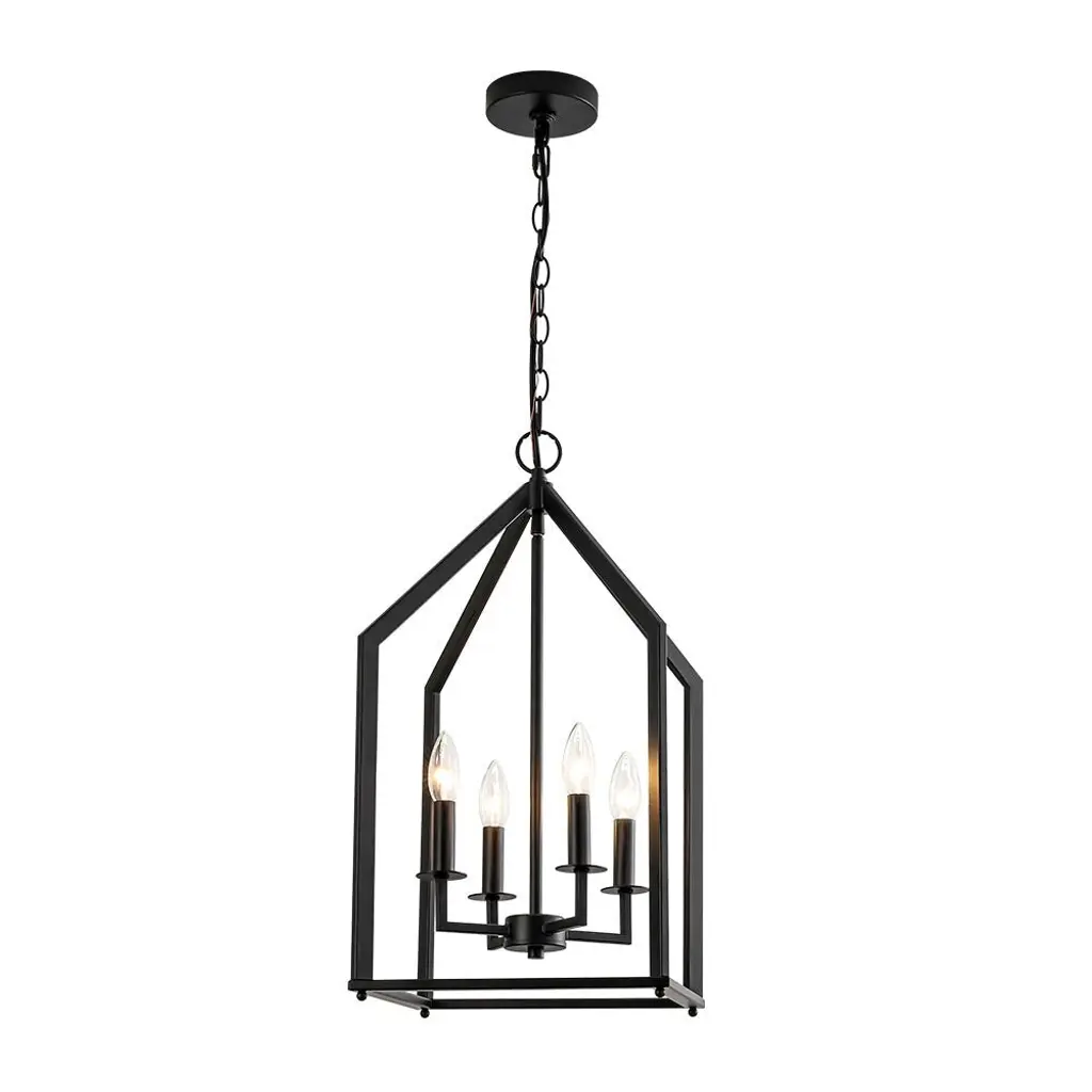 This 4-light lantern pendant light blends modern farmhouse appeal with industrial charm. Featuring a minimalist and airy geometric cage design, this lantern fixture is finished in a sleek matte black. The four candle-style light holders, designed to hold E12 candelabra bulbs (not included), evoke traditional elegance, while the open frame and exposed bulb design provide bright, direct illumination. Ideal for enhancing a variety of spaces—whether it’s an entryway, dining room, kitchen island, foyer, bathroom, or stairwell—this candle style lantern pendant light offers the perfect balance of functionality and vintage-inspired style.Features:Specifications: