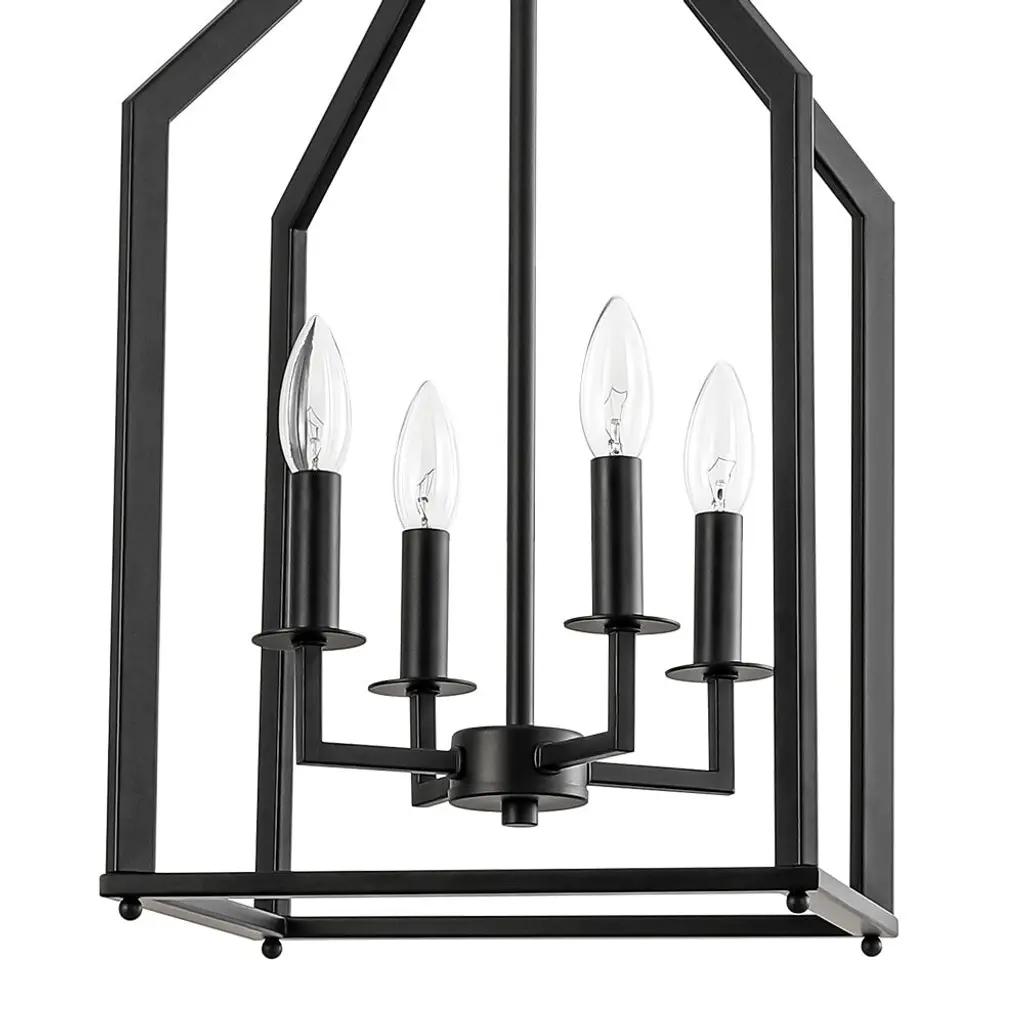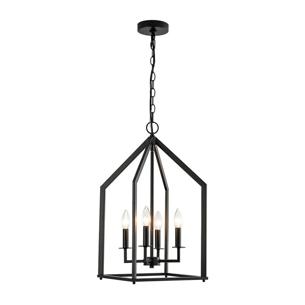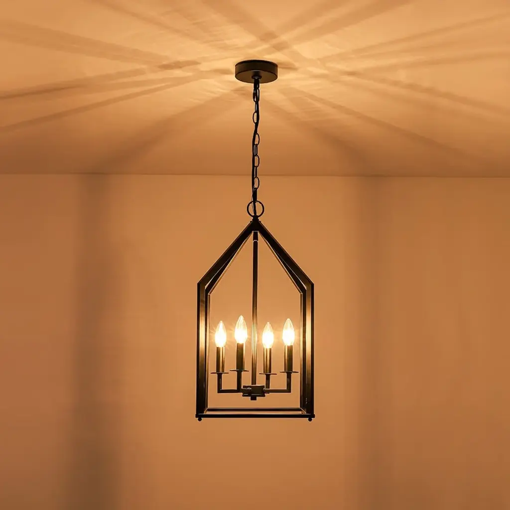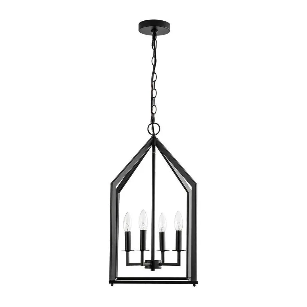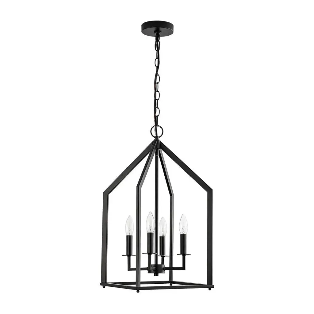 This 4-light lantern pendant light blends modern farmhouse appeal with industrial charm. Featuring a minimalist and airy geometric cage design, this lantern fixture is finished in a sleek matte black. The four candle-style light holders, designed to hold E12 candelabra bulbs (not included), evoke traditional elegance, while the open frame and exposed bulb design provide bright, direct illumination. Ideal for enhancing a variety of spaces—whether it’s an entryway, dining room, kitchen island, foyer, bathroom, or stairwell—this candle style lantern pendant light offers the perfect balance of functionality and vintage-inspired style.Features:Specifications: