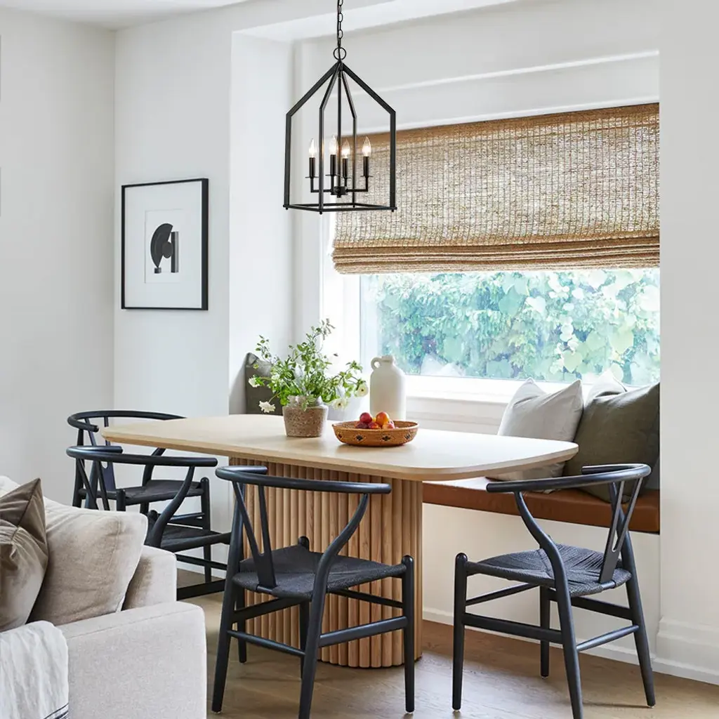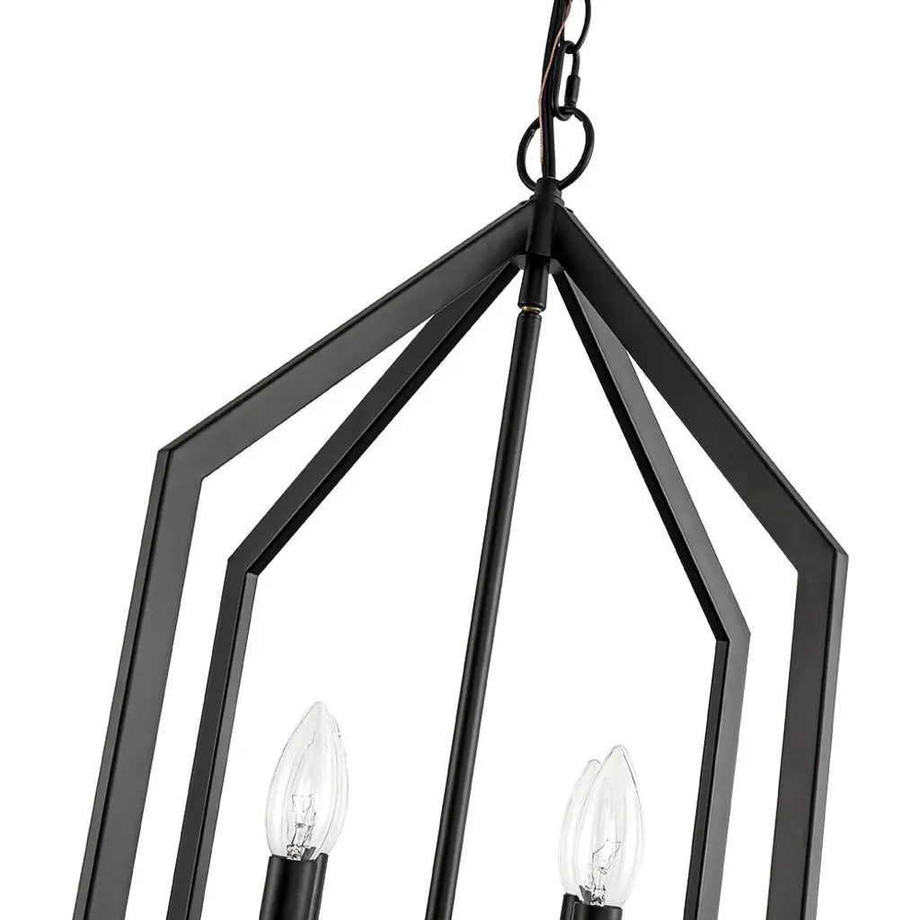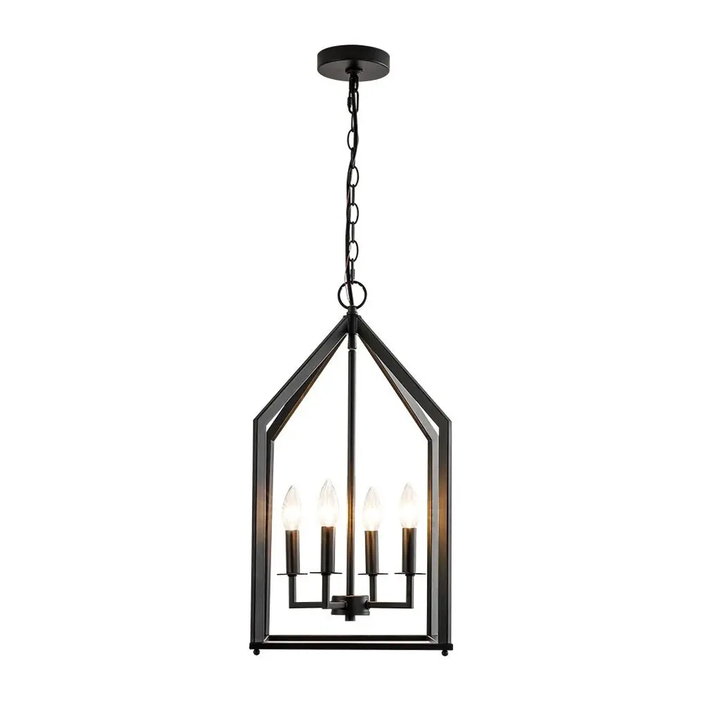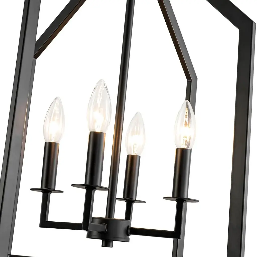 This 4-light lantern pendant light blends modern farmhouse appeal with industrial charm. Featuring a minimalist and airy geometric cage design, this lantern fixture is finished in a sleek matte black. The four candle-style light holders, designed to hold E12 candelabra bulbs (not included), evoke traditional elegance, while the open frame and exposed bulb design provide bright, direct illumination. Ideal for enhancing a variety of spaces—whether it’s an entryway, dining room, kitchen island, foyer, bathroom, or stairwell—this candle style lantern pendant light offers the perfect balance of functionality and vintage-inspired style.Features:Specifications: