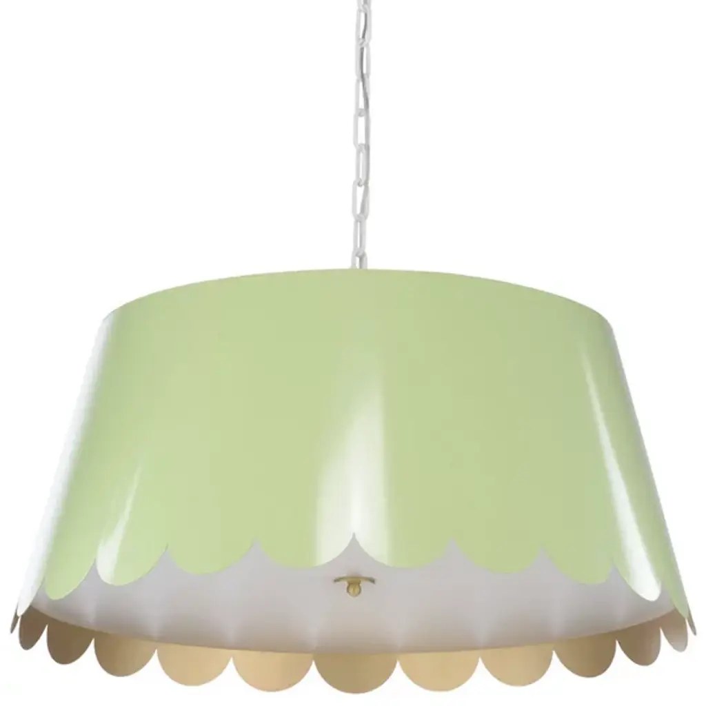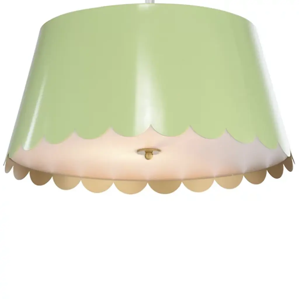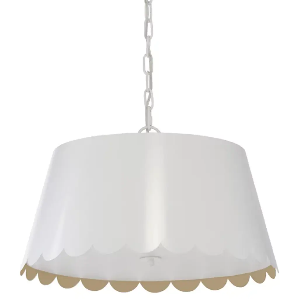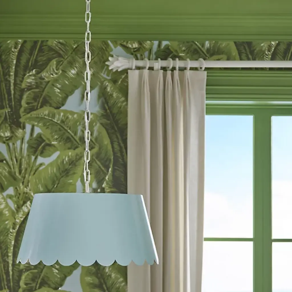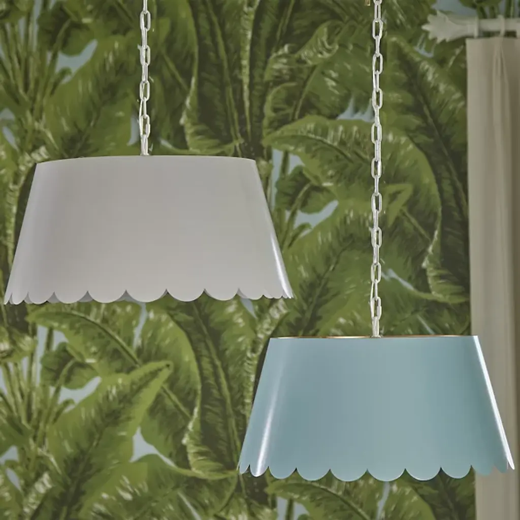 The Mirasol Pendant from Wildwood, designed by Meg Braff for Wildwood, brings playful elegance and vibrant charm to any space. Featuring a sleek design with scalloped detailing, it is suspended from a crisp white chain for a clean, modern touch. The interior of the shade, finished in gold, adds a warm glow and luxurious contrast. This pendant blends fun, color, and sophistication, perfect for brightening a child’s room, cozy breakfast nook, or small foyer.