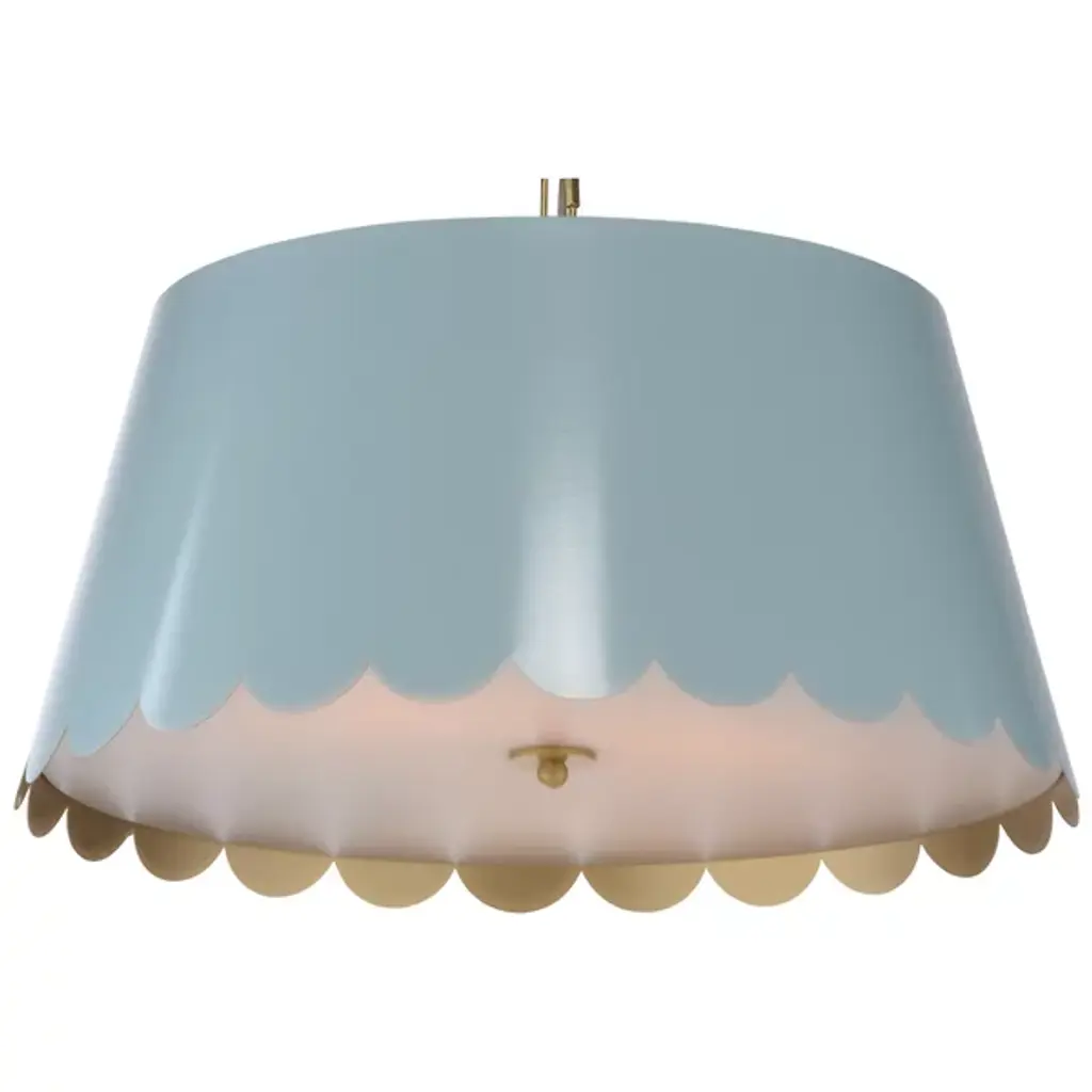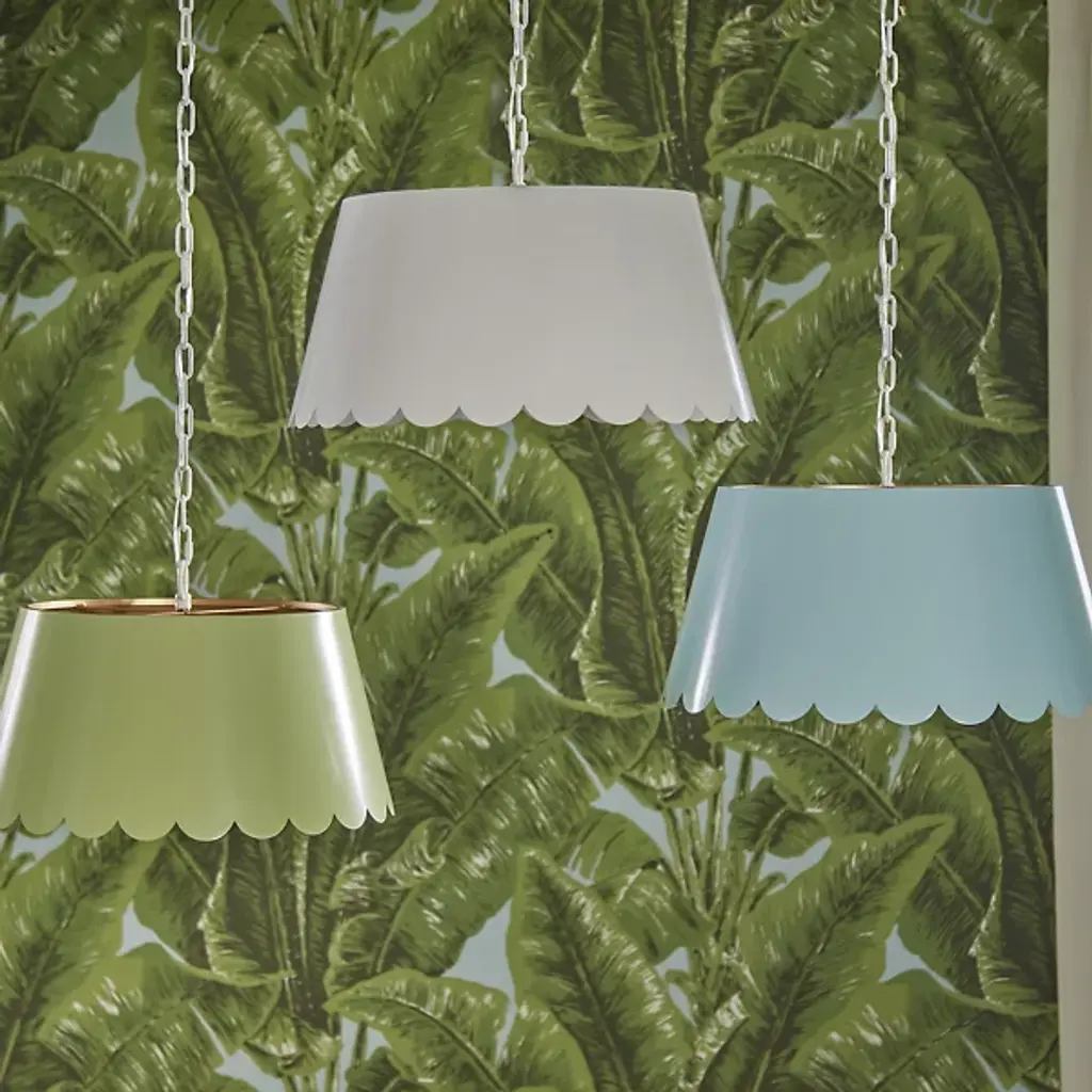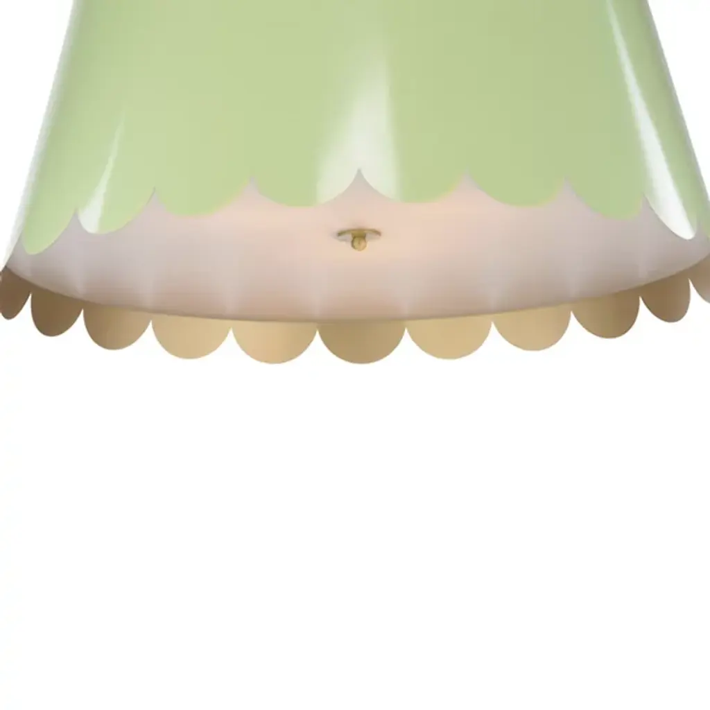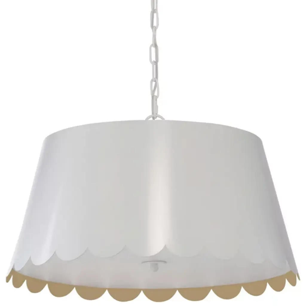 The Mirasol Pendant from Wildwood, designed by Meg Braff for Wildwood, brings playful elegance and vibrant charm to any space. Featuring a sleek design with scalloped detailing, it is suspended from a crisp white chain for a clean, modern touch. The interior of the shade, finished in gold, adds a warm glow and luxurious contrast. This pendant blends fun, color, and sophistication, perfect for brightening a child’s room, cozy breakfast nook, or small foyer.