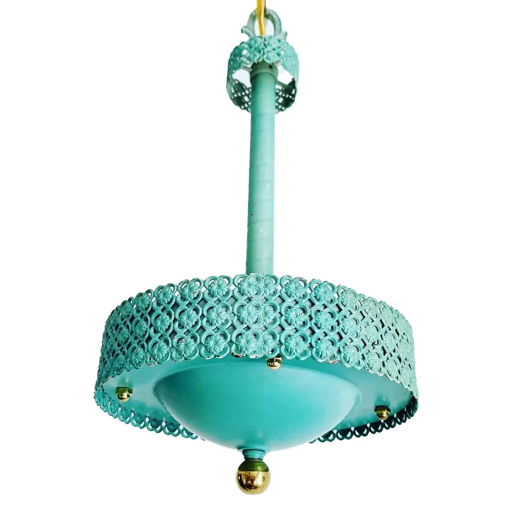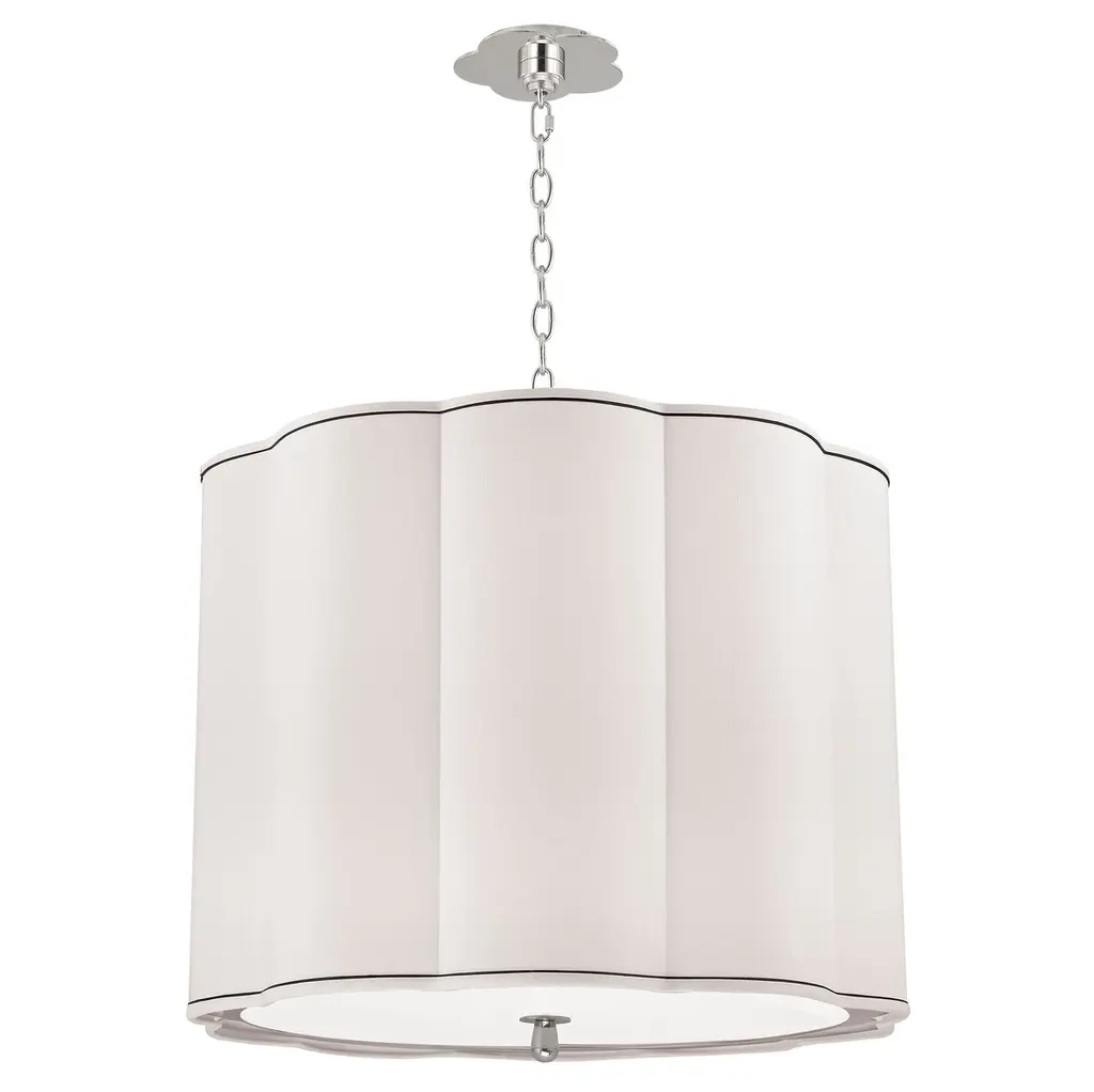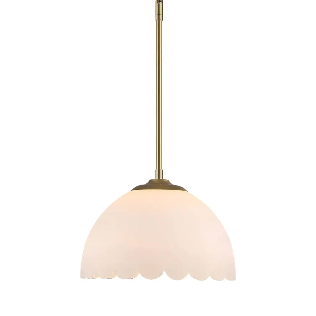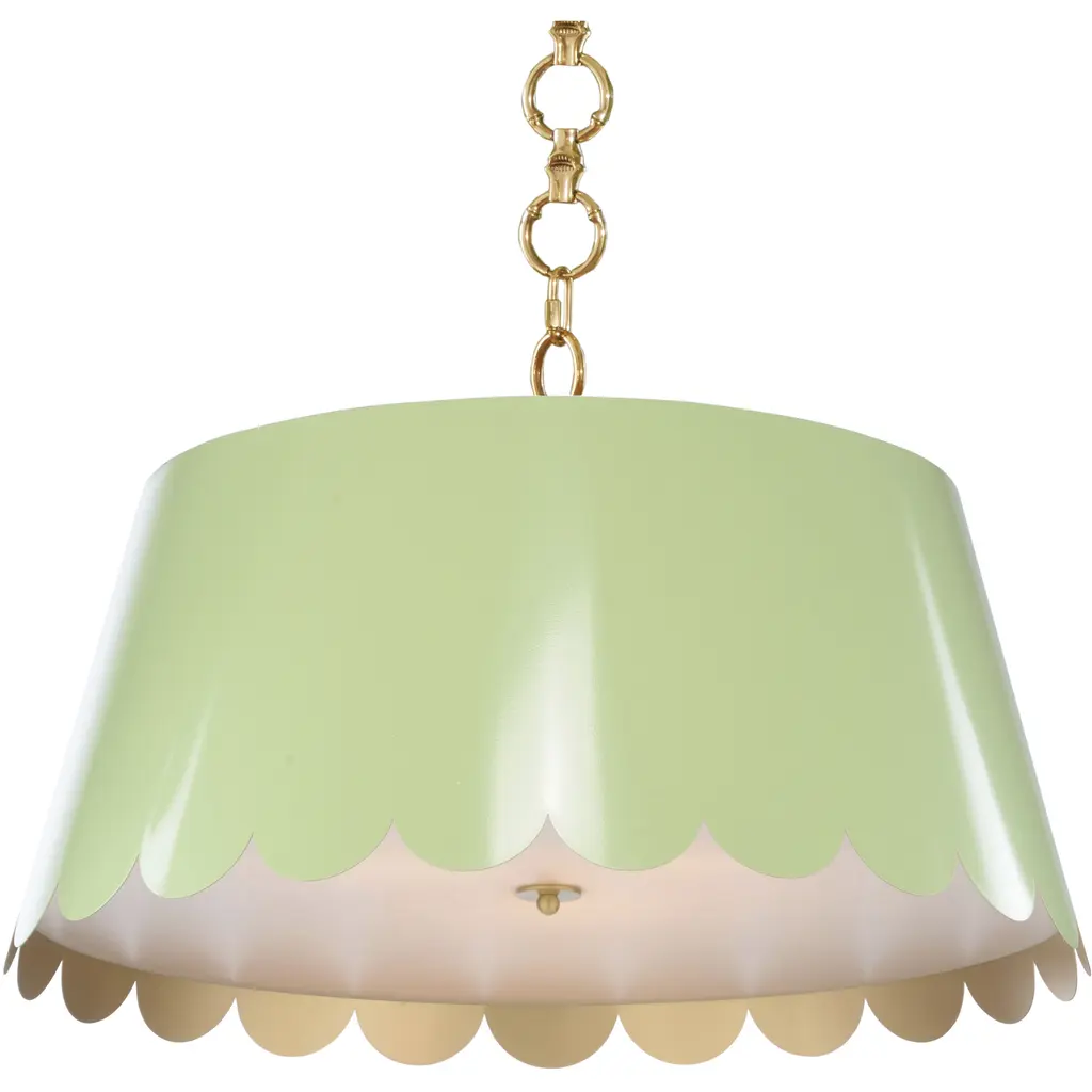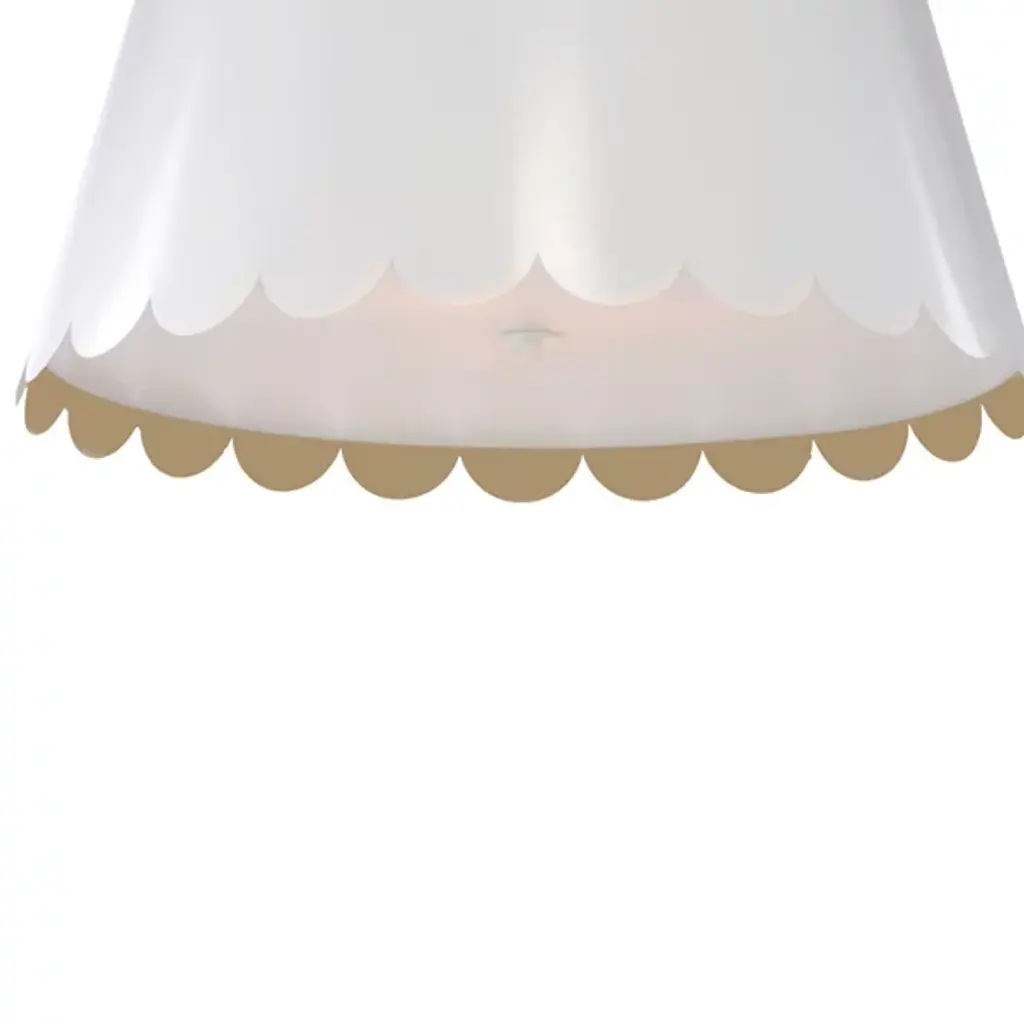 The Mirasol Pendant from Wildwood, designed by Meg Braff for Wildwood, brings playful elegance and vibrant charm to any space. Featuring a sleek design with scalloped detailing, it is suspended from a crisp white chain for a clean, modern touch. The interior of the shade, finished in gold, adds a warm glow and luxurious contrast. This pendant blends fun, color, and sophistication, perfect for brightening a child’s room, cozy breakfast nook, or small foyer.