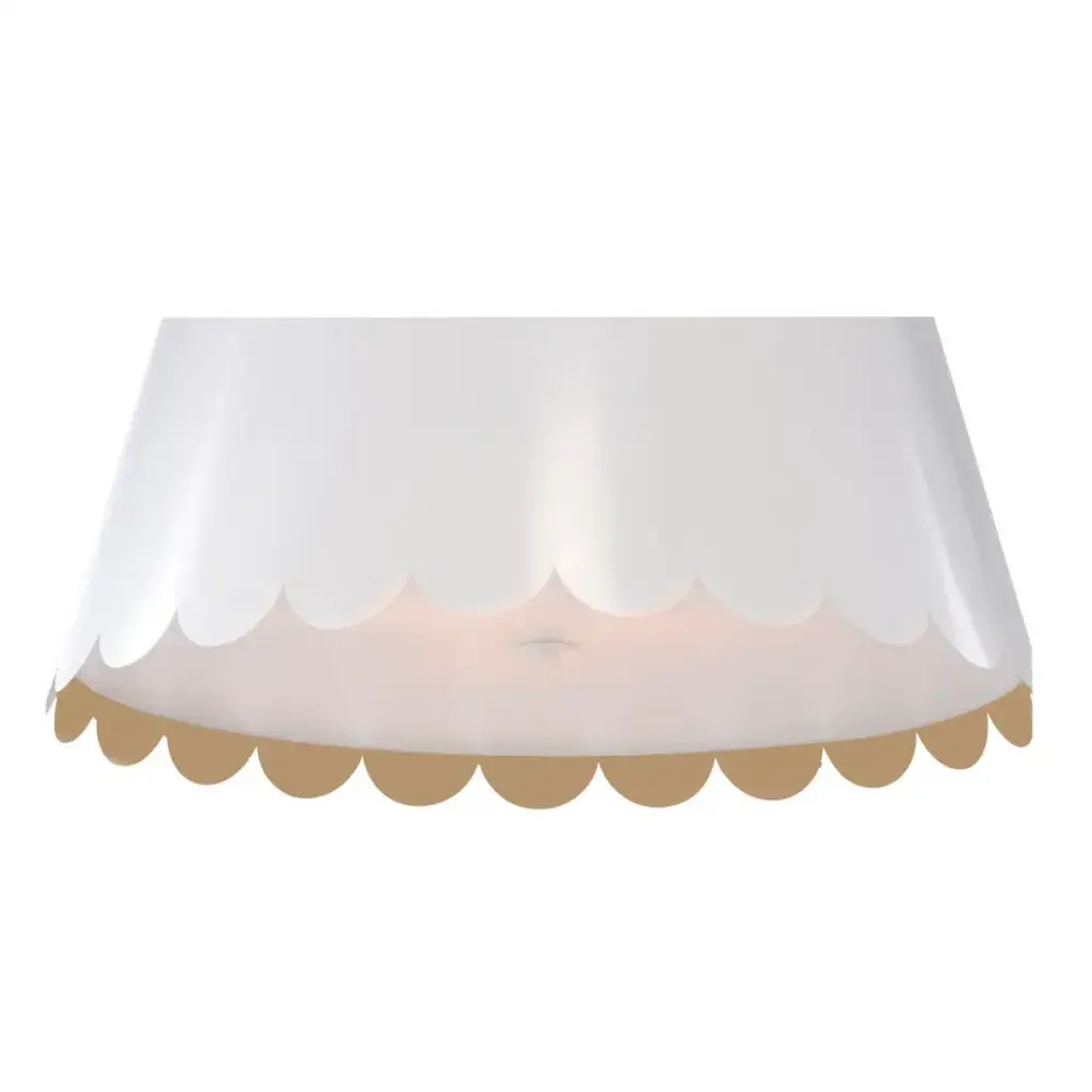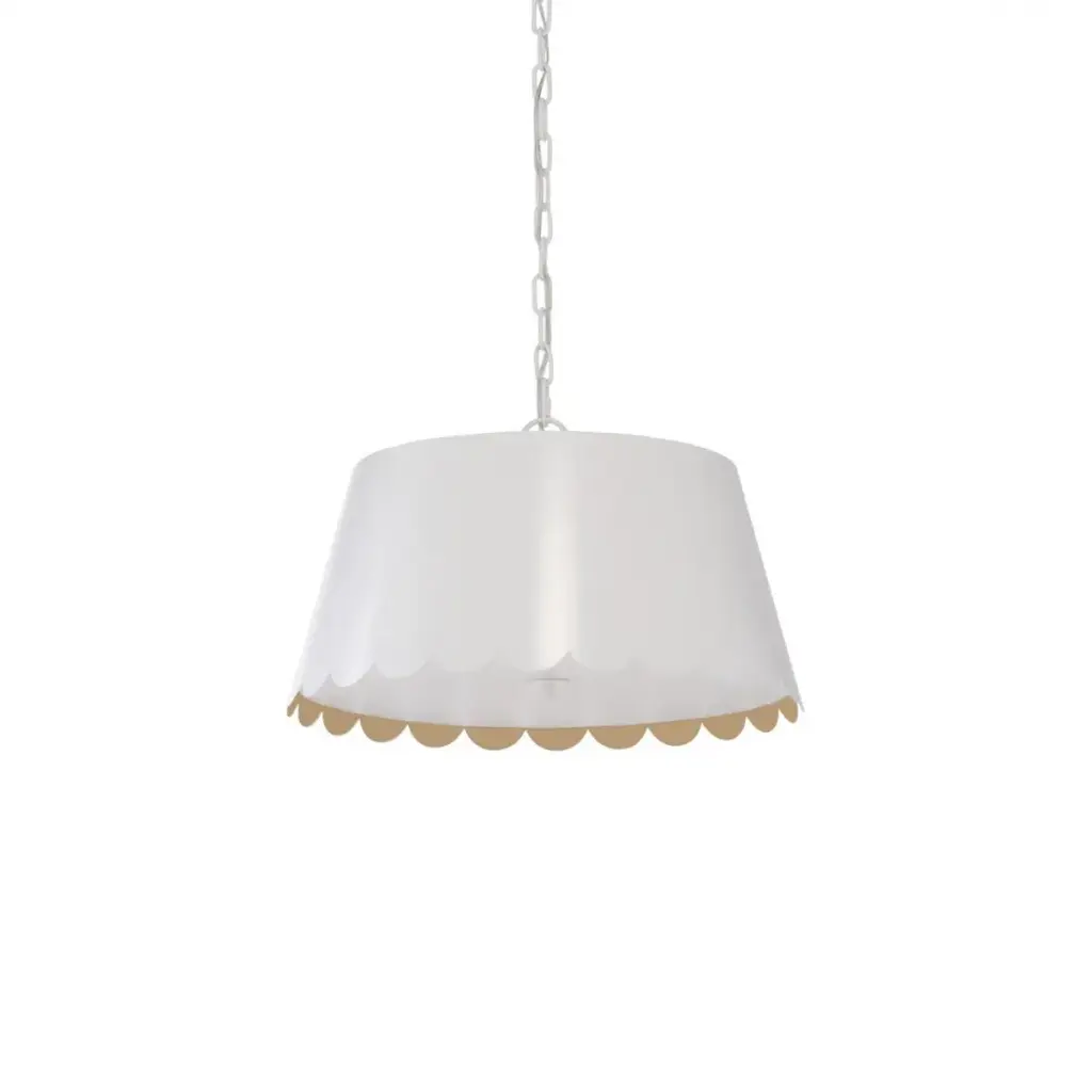 DESIGNED FOR WILDWOOD BY MEG BRAFF DESIGNS, THIS SLEEK PENDANT FEATURES A PLAYFUL SCALLOPED DETAILING SUSPENDED FROM A WHITE CHAIN. MIRASOL PENDANT HAS TWO LIGHTS THAT WILL BRIGHTEN A CHILD'S ROOM, BREAKFAST NOOK OR SMALL FOYER. COMES WITH A 5" CANOPY AND 6' CHAIN.