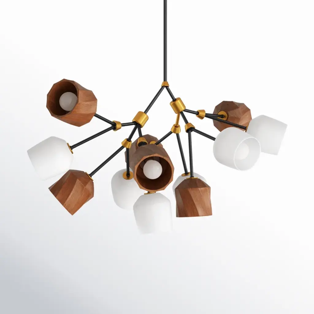 This fashionable modern chandelier combines solid wood shades with warm bronze and brass tones. Posing with arms akimbo, a combination of walnut stained oak and satin white glass shades creates a transitional statement in mixed materials while also providing pleasant glare-free lighting. A coordinating swing arm wall sconce extends horizontally using an attractive and sturdy arm structure. LED lamps are conveniently included with the fixtures as an all-inclusive package, making them energy efficient as well.