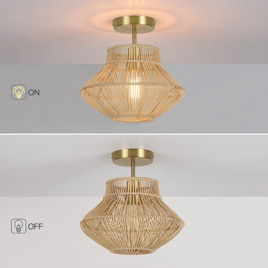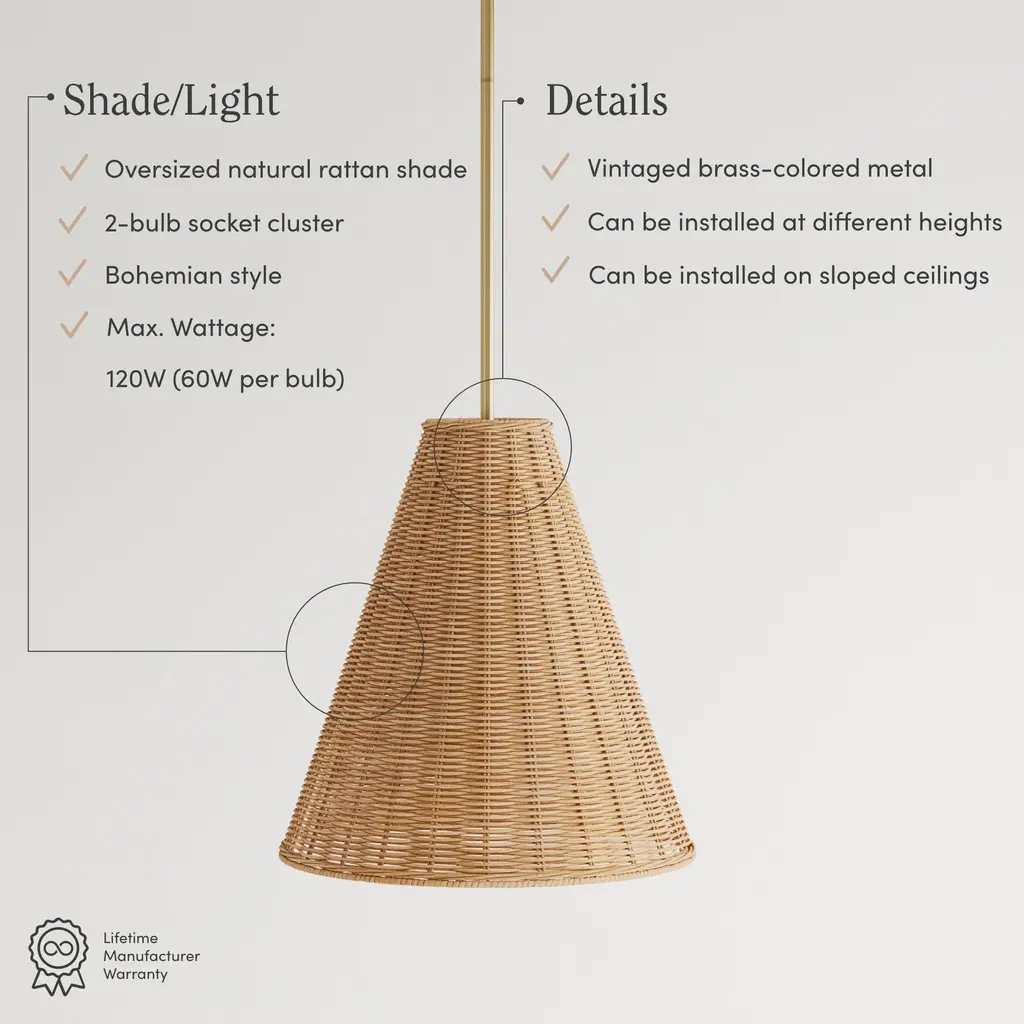 Here's the Mischa boho pendant light - designed for modern boho lovers! This large rattan pendant light features an oversized handwoven cone-shaped shade made from natural rattan for a soft, rustic texture while inviting light to your kitchen, dining area, or entryway. It has vintaged brass accents that give it a subtle retro touch, while the dual bulb socket cluster ensures plenty of illumination. This pendant light is adjustable to different heights and compatible with sloped ceilings, letting it work effortlessly in any setup. The natural rattan shade makes it unique - no two pieces are exactly alike as each one differs slightly in color and texture. Key Features:Materials: Assembly Must-Haves: Phillips-head screwdriverNathan James is the furniture company built for this generation. You don't need to spend a fortune to get quality design-first furniture and when we say easy assembly, we mean it. Our guarantee is our word. Your purchase is backed by a 100% money-back guarantee. If you have any quality issues just contact us and we will send you a replacement immediately—no questions asked. This product is not recommended for commercial use.