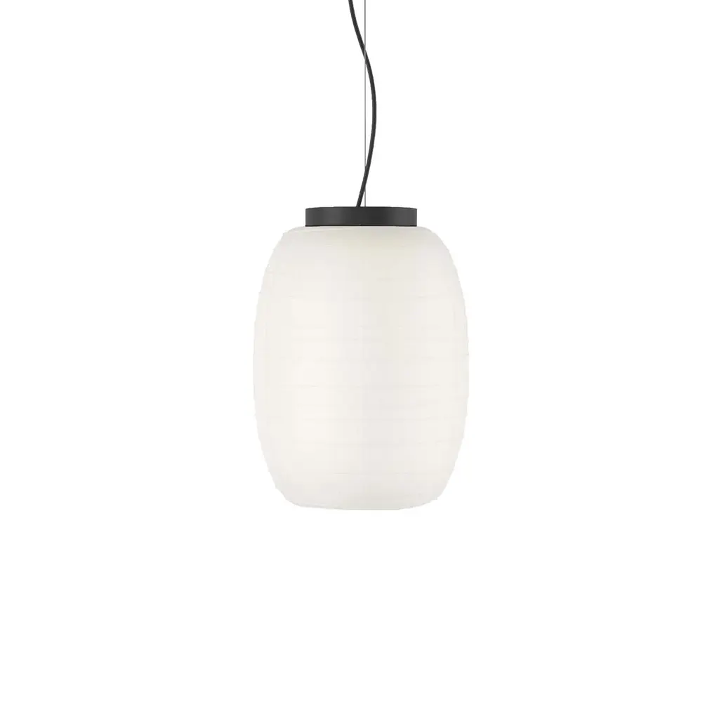 Japanese-inspired single or multiple suspension lamp, all of them created around a disc that houses the light source (E26). This disc is available in a natural wood or painted matte black finish, which supports the textured blown-glass diffuser that comes in an opal matte white finish. The single-unit suspension lamps have one glass diffuser and are available in three sizes (S15, S25 and S35). The version with a natural wood finish has an off-white textile cable, while the black painted version has a black textile cable. Features