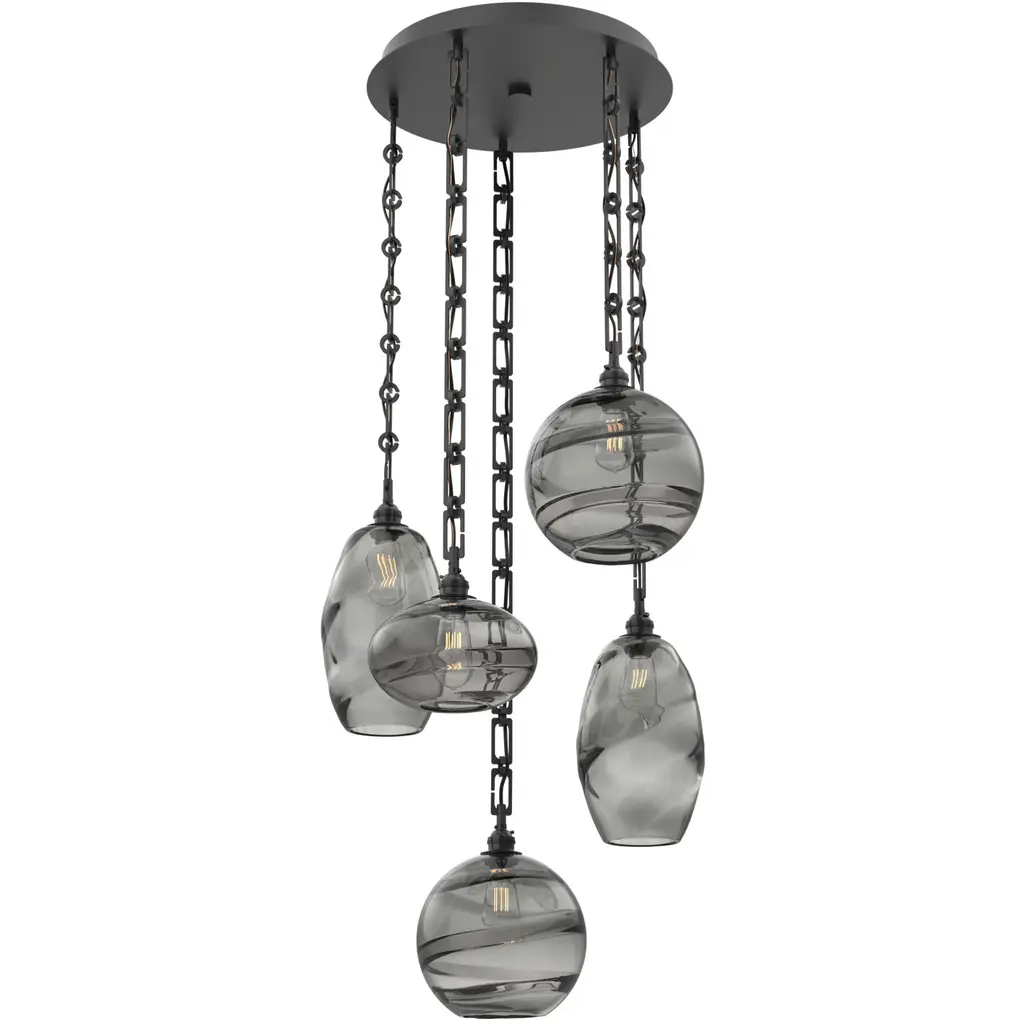 Handcrafted in North America by Hammerton artisans, the Misto Round Multi-pendant Chandelier showcases 5 unique hand-blown crystal glass pendants and suspended from a round canopy by your choice of cloth-braided cord or artisan-forged chain. Each blown glass shade is expertly shaped to refract light in captivating ways, especially when paired with vintage-style bulbs. Suspension options include three vintage-inspired chain styles, all designed and crafted with exceptional attention to detail.
