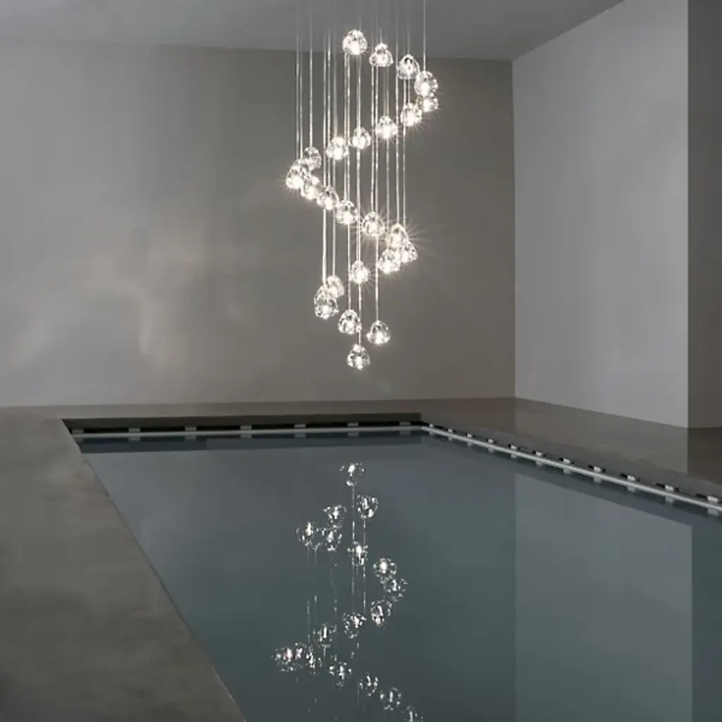 The Terzani Mizu 26-Light Pendant mirrors the refracted tranquility produced when the mediums of light and water intersect. Twenty-six gorgeous globes of suspended super clear crystal casually await the opportunity to bend some rays, resulting in random arrangements of artistic light play around the room. Completely crafted by hand, each pendant is truly individual, offering a unique artisanal treasure.