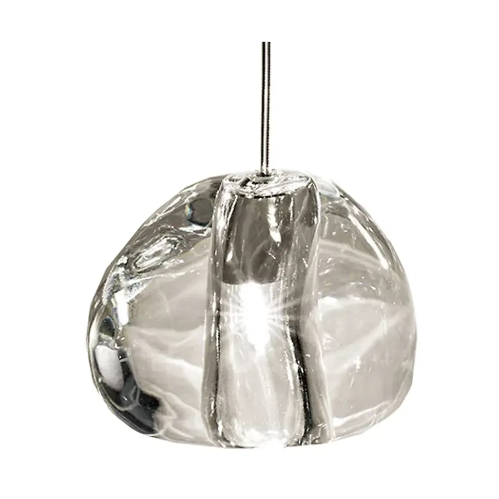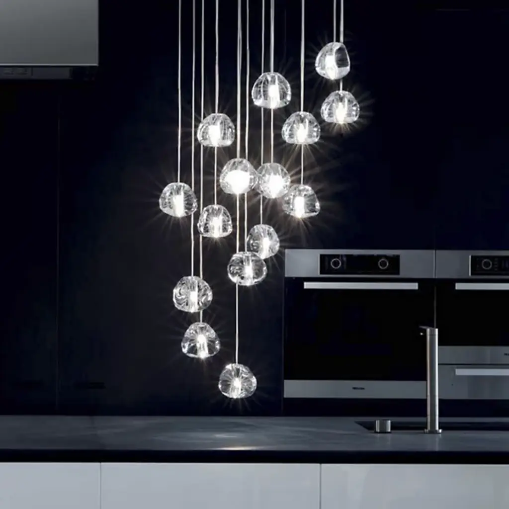 The Terzani Mizu 26-Light Pendant mirrors the refracted tranquility produced when the mediums of light and water intersect. Twenty-six gorgeous globes of suspended super clear crystal casually await the opportunity to bend some rays, resulting in random arrangements of artistic light play around the room. Completely crafted by hand, each pendant is truly individual, offering a unique artisanal treasure.