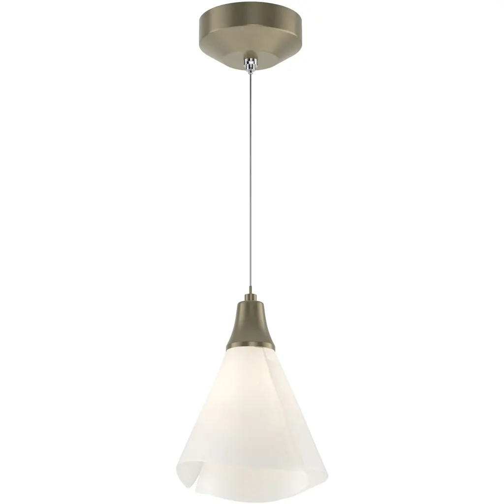 The Mobius Low Voltage Mini Pendant features a single blossoming spun frost shade suspended via low voltage cable that is height-adjustable from a discrete round canopy above. Available in all standard finishes.