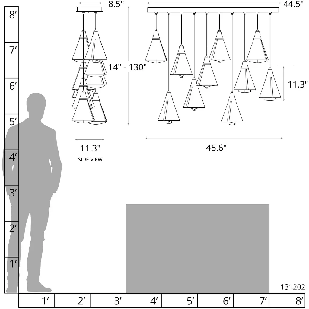 Graceful Mobius spun-frost shades seem to float in space from the rectangular canopy above. With the ability to customize each shade's positioning, whether you prefer the 10 lights to be aligned or staggered heights, the Mobius 10-Light fixture features a double linear multi-port.