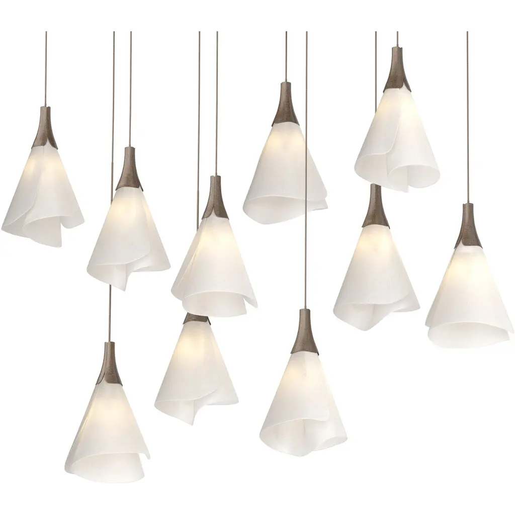 Graceful Mobius spun-frost shades seem to float in space from the rectangular canopy above. With the ability to customize each shade's positioning, whether you prefer the 10 lights to be aligned or staggered heights, the Mobius 10-Light fixture features a double linear multi-port.