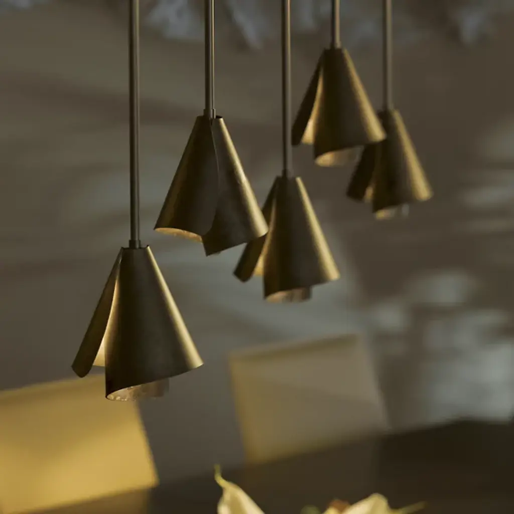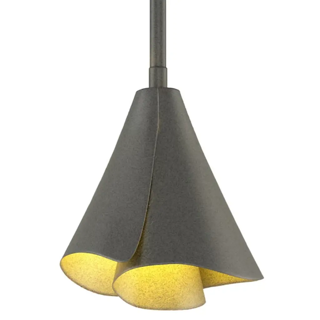 Named for the twisted cylindrical structure that inspired it, the Mobius Steel Shade Mini Pendant by Hubbardton Forge is a beautifully handcrafted addition to your home. With a round canopy and an adjustable stem, this fixture can be placed at just the right height to meet your needs. A hand forged Steel shade is shaped into a soft, calla lily-like conical design and houses a warm light that plays within the shapes and shadows of this piece. Artful and luxurious, this pendant adds a layer of light and style as an individual piece or gathered in a group.