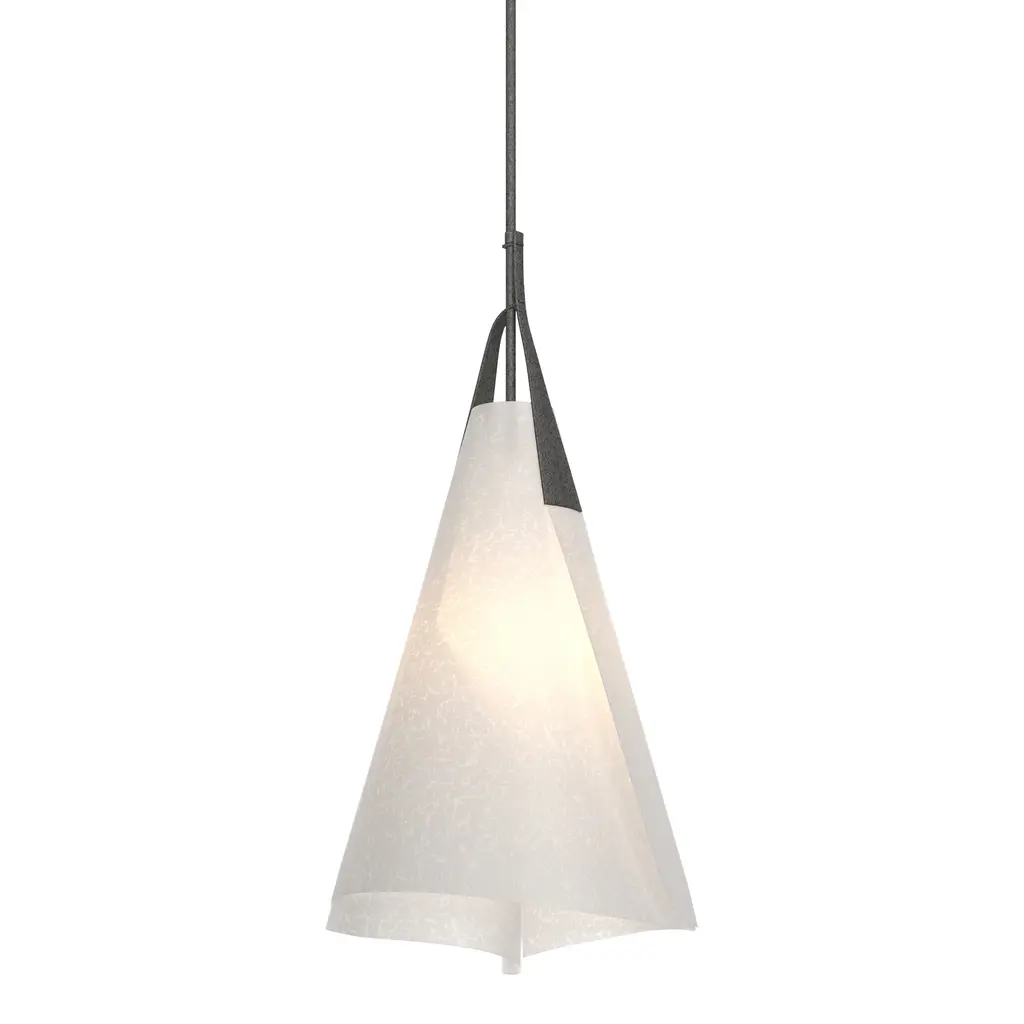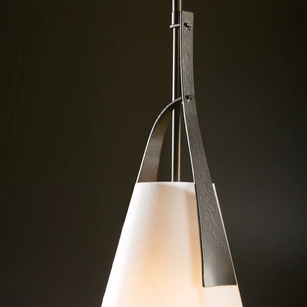 The Mobius Tall Pendant pays tribute to August Ferdinand Mobius, the brilliant pioneer of the Mobius Strip. This single structured form that August Mobius discovered has creatively been captured by Hubbardton Forge's designers in the continuous form of the curved shade suspended in this design. Simple hand-forged detailing tops the shade to add that extra contemporary touch that truly sets this pendant apart from all of the rest. Hubbardton Forge lighting is handcrafted in Vermont, USA by highly skilled artisans. Every lamp is made-to-order and handmade using environmentally friendly metal forging techniques. Powder coatings and aqueous metal cleaning are used in the production of every lamp. Shown in Dark Smoke finish with Spun Frost shade