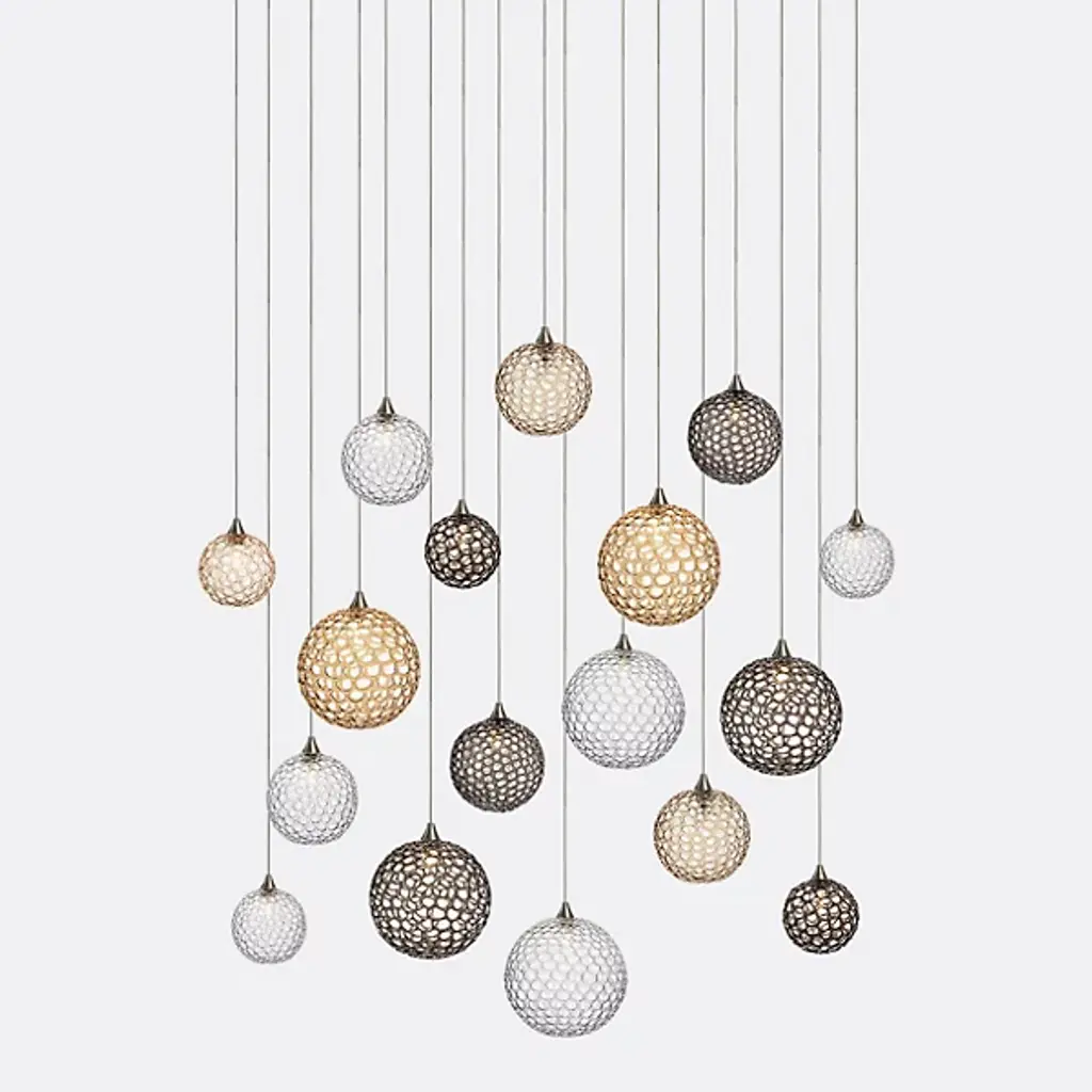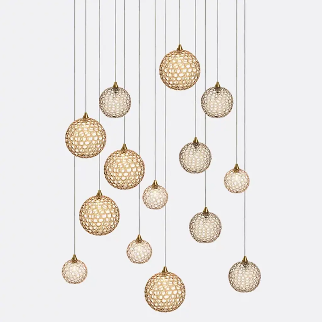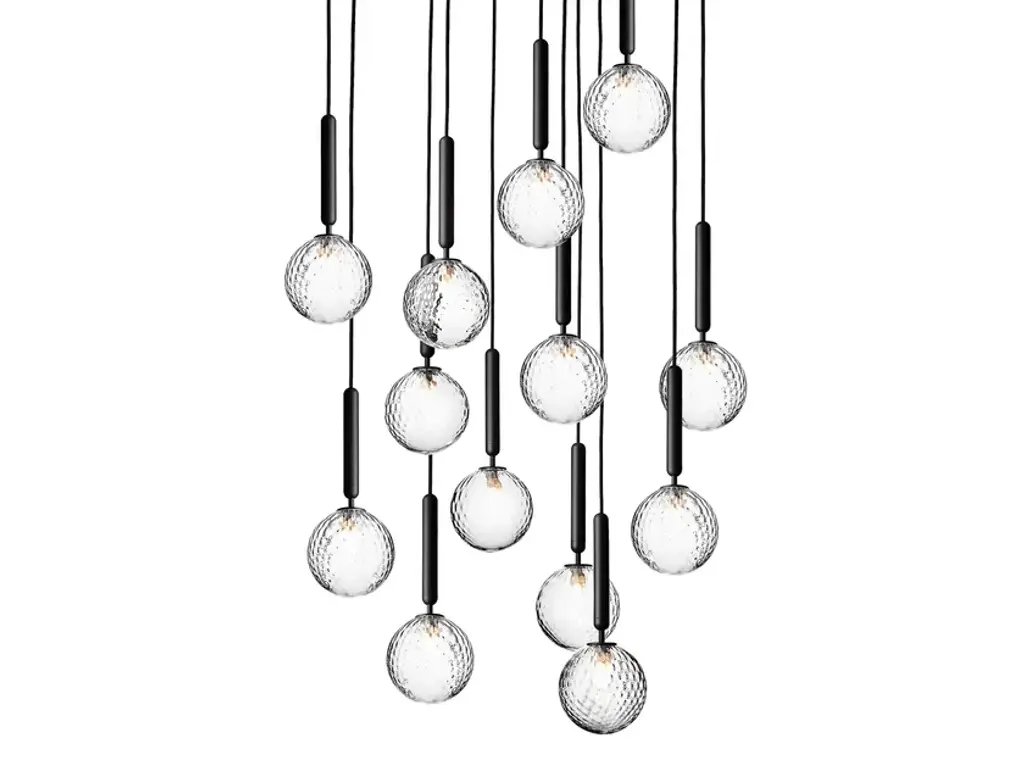 Gather everyone around the inviting orbs of the Mod MD17 Multi-Light Pendant from Shakuff. It's a piece showing great attention to detail, a testament to Shakuff's art meets craft approach. It slots at a low profile over the ceiling with a rectangular canopy that elegantly mirrors a dining table or kitchen island's outline. Fine, adjustable cords flow down like a line drawing. The handblown and hand-decorated shades pack plenty of intrigue in their tight globe forms. Perforations wrapping the shades create a mesh pattern for an artful silhouette and a more relaxing glow. This glow fills up the room with an eye-comforting warmth.