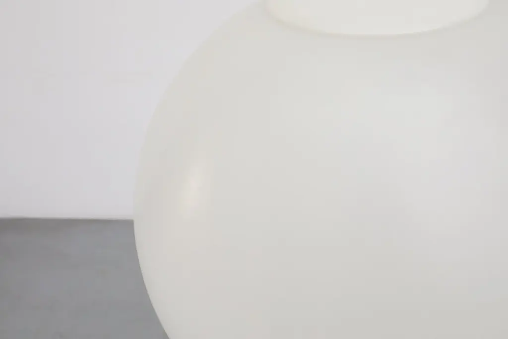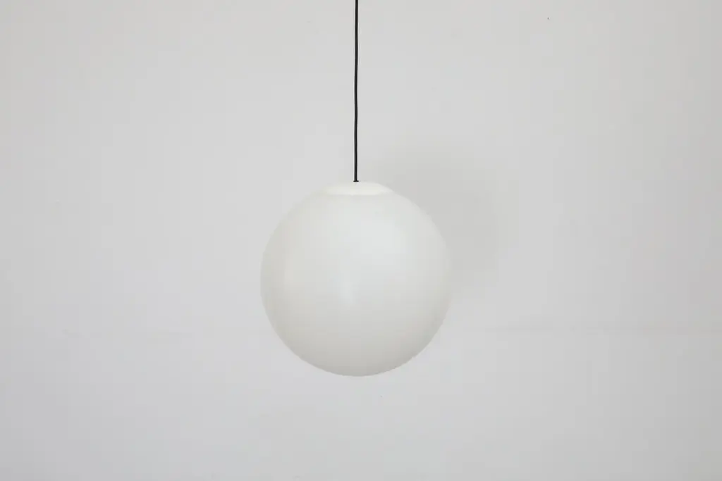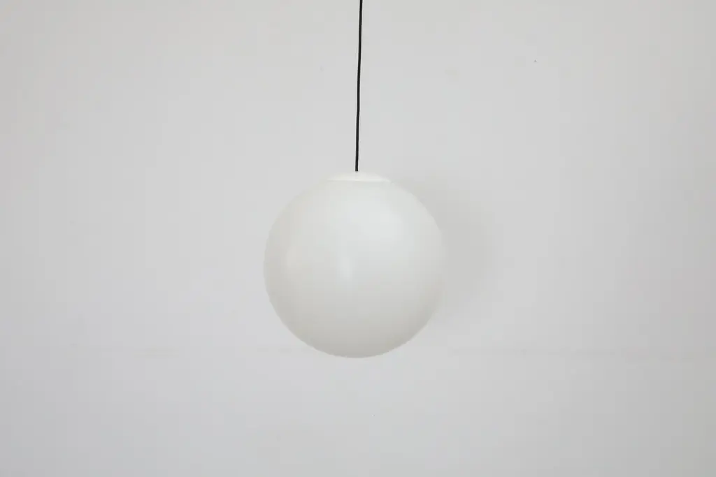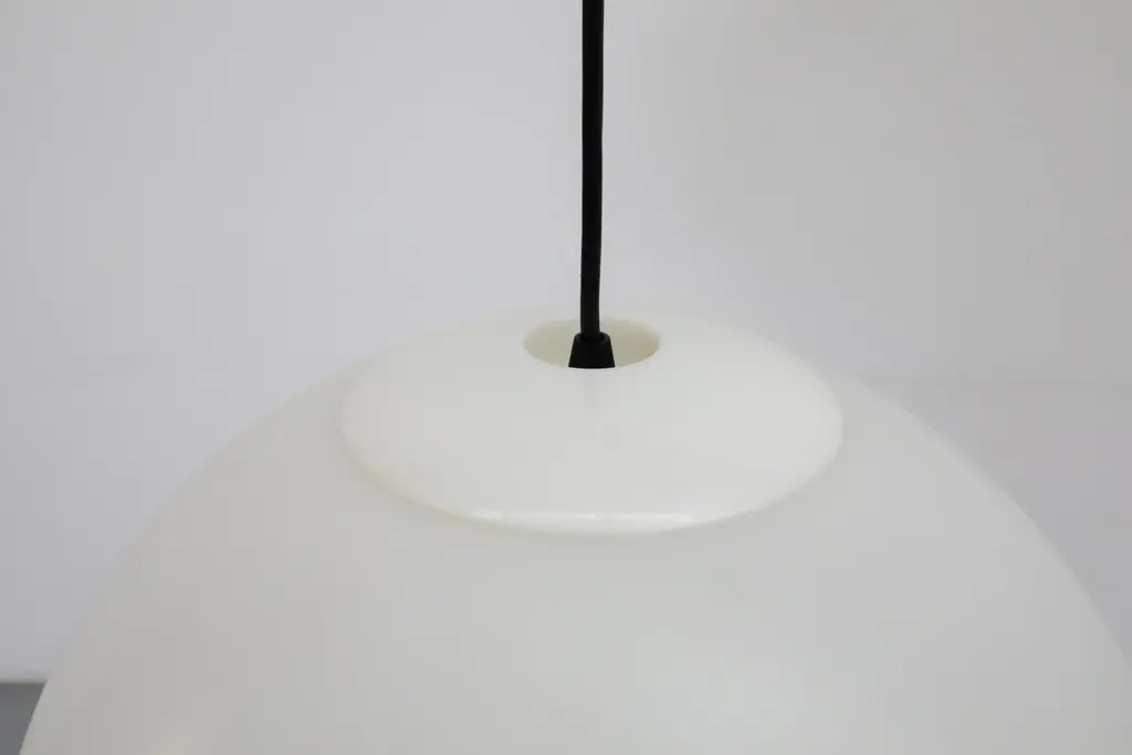 MOD Mid-Century acrylic globe pendants with a white lid on top. In original condition with visible wear, including some visible scratches. Wear is consistent with their age and use. Canopy not included. Shown with other pendants with clear lids, available and listed separately. (LU922443154192).