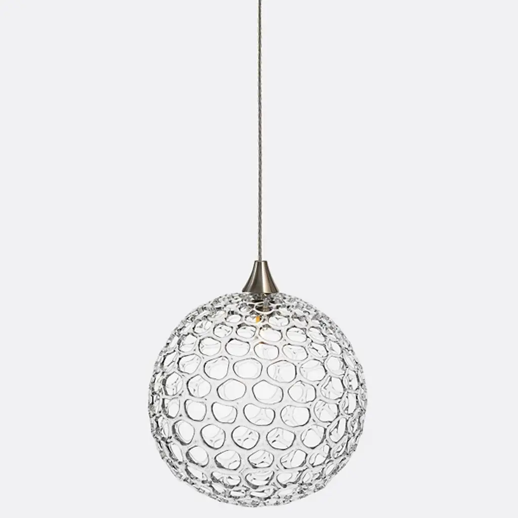 The Mod Mini Pendant from Shakuff helps create intimate shared experiences through a handcrafted volume so chock-full of detail it fascinates around the table. This beautiful, functional sculpture underscores Shakuff's art meets craft approach. A single suspension puts the piece in a clear view, whether over a dining table or kitchen island. The shade's shape pleases with familiarity, drawing inspiration from mid-century modern lighting icons. Glass artists put their spin on the mid-century globe by blowing it by hand and decorating it with organic perforations. The light from inside accentuates the contours of the glass as it passes through to create an ambient down glow.