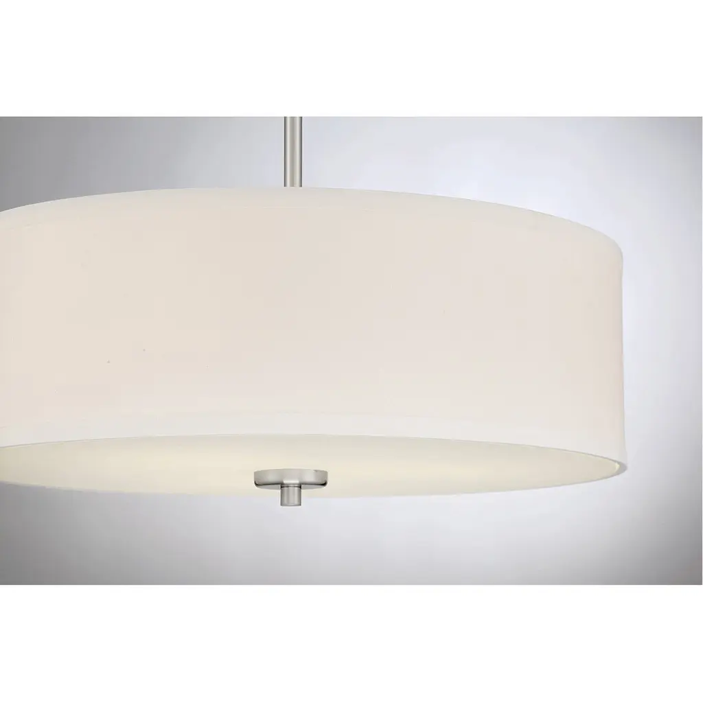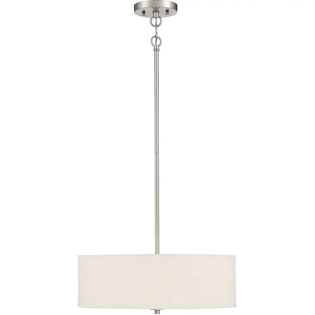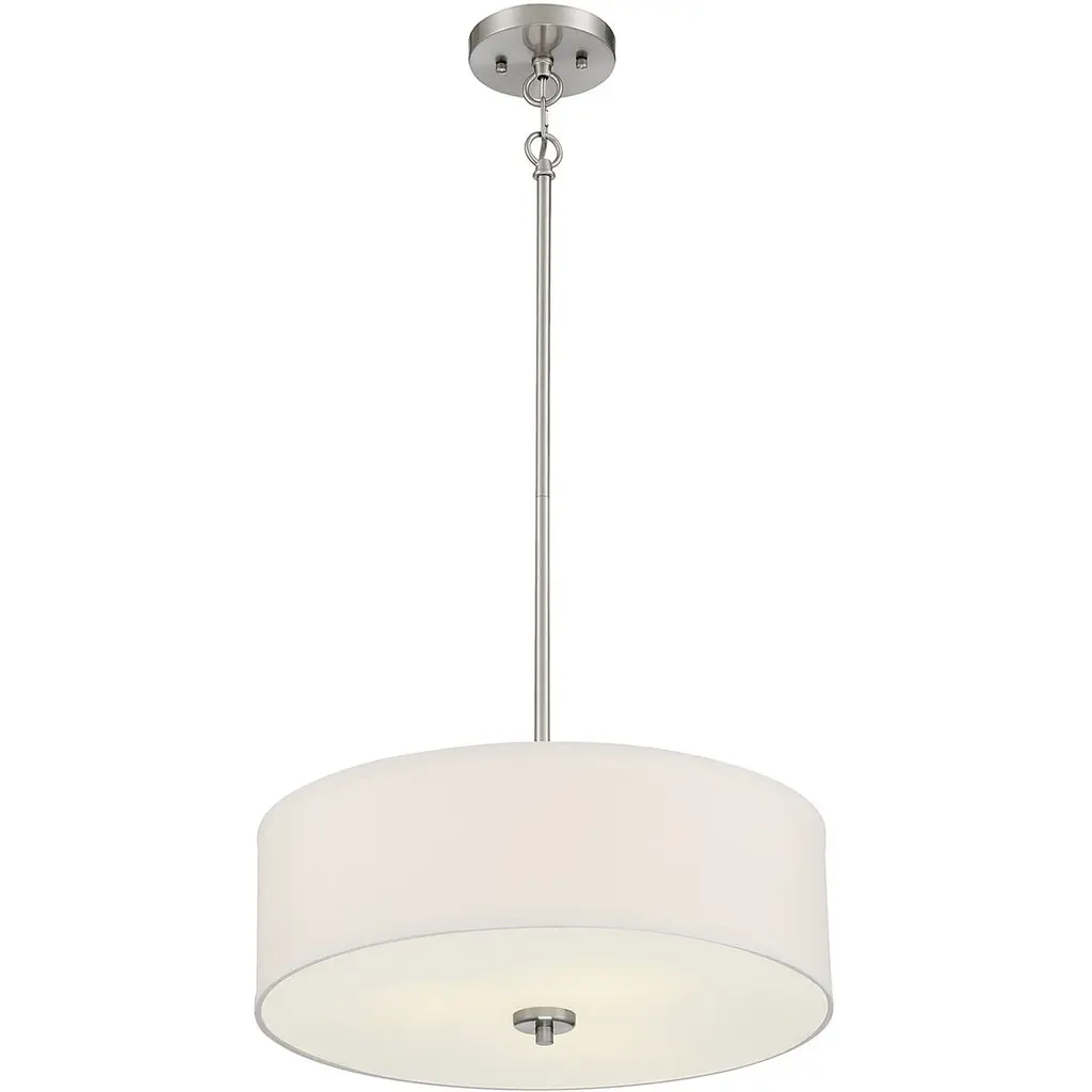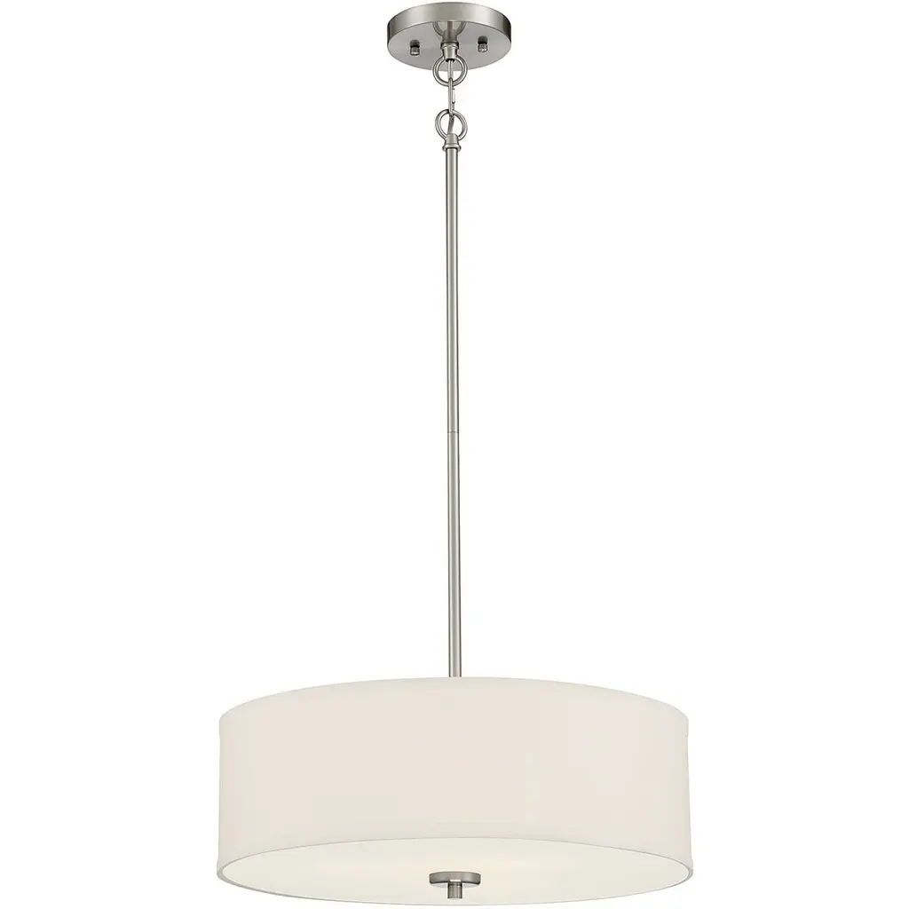 This Meridian 3-light pendant presents timeless drum pendant lighting style that is perfectly suited for brightening up any space. Its crisp shade of white fabric pairs well with the sleek brushed nickel finish. Whether you use this pendant alone or in multiples, you will love how it looks This pendant is 6.5" in height and 18" in width, plus it includes four 12" downrods and one 6" downrod to let you adjust the height for a maximum of 60.5". This pendant uses 3 standard size bulbs of up to 60 watts each, is LED compatible, is dimmable and can be used on a sloped ceiling.