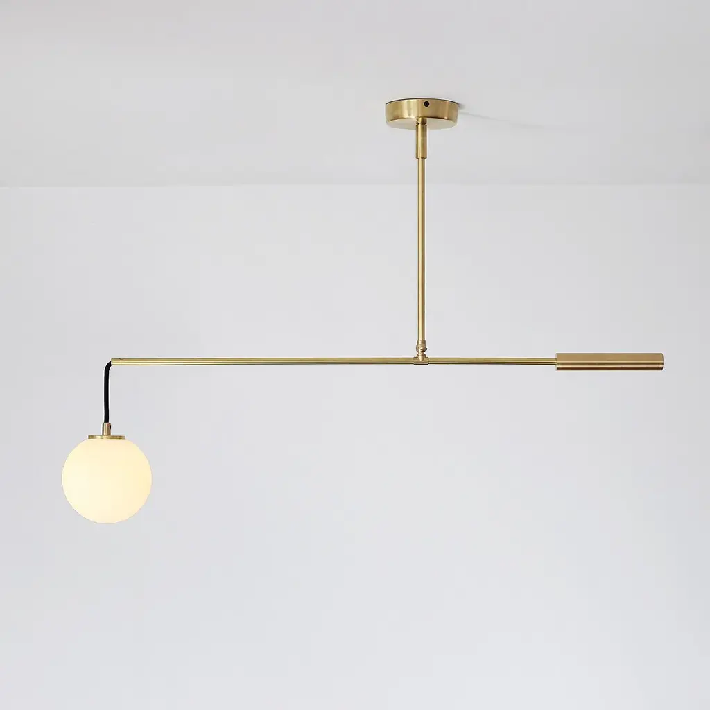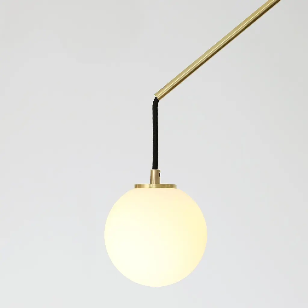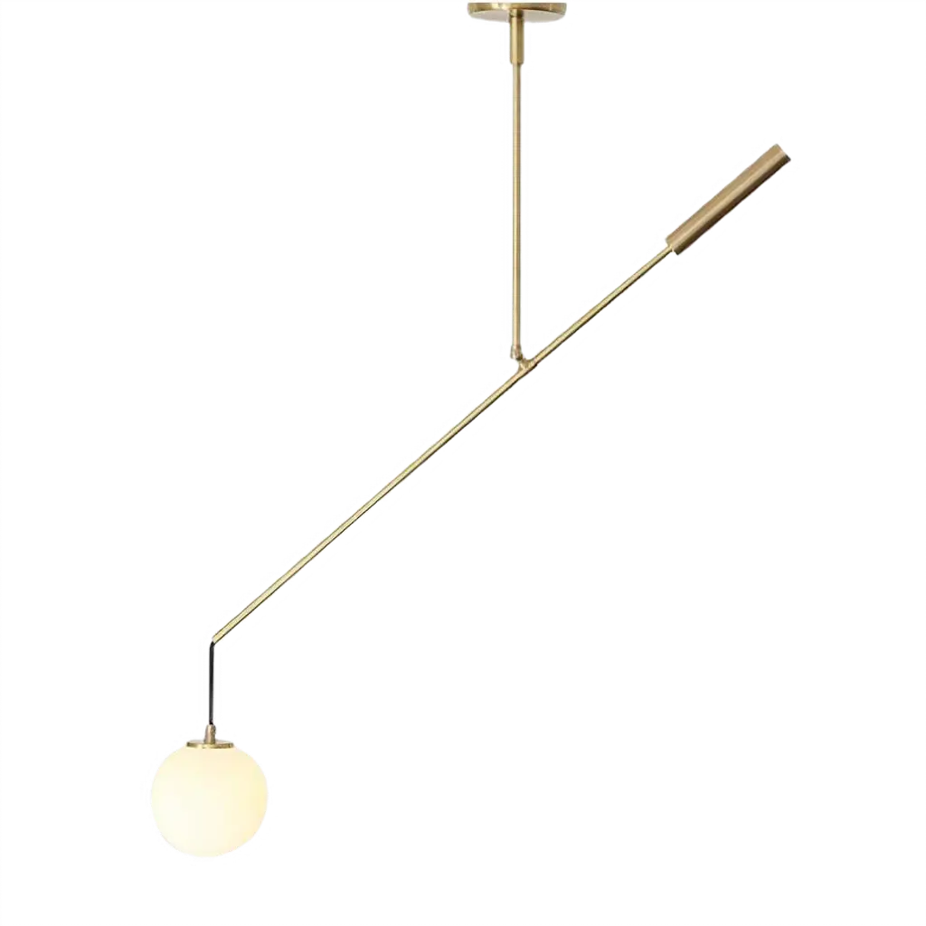 This modern counterbalance pendant lamp is made of brushed brass with a glass globe. The lampshade made of matte opaline glass ideally diffuses the light. The horizontal arm is perfectly balanced but can be set at any angle and locked. The whole arm can be rotated via the joint at the ceiling by 270 degrees. The lamp has to be fitted with a standard g9 led bulb. It is recommended to use max. 60w standard bulbs or leds without limits. Light bulbs are not included. The lamp is suitable for 230v and 110v. additional dimensions:- diameter of the lampshade - 12 cm / 4.7 ''- height - 57 cm / 22.44 '' (horizontal arm position)- height - 85 cm / 33.46 '' (45 degree arm position)- length of the arm - 76 cm / 30 ' (there may be a difference of - 1.5 cm / - 0.6 " due to the different weight of the hand-blown glass shade and the necessity to correct the counterweight)'- ceiling canopy diameter - 10 cm / 3.9 '' up to 250v (europe/uk standard).