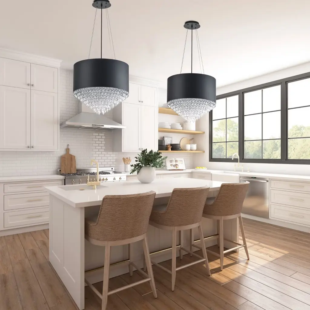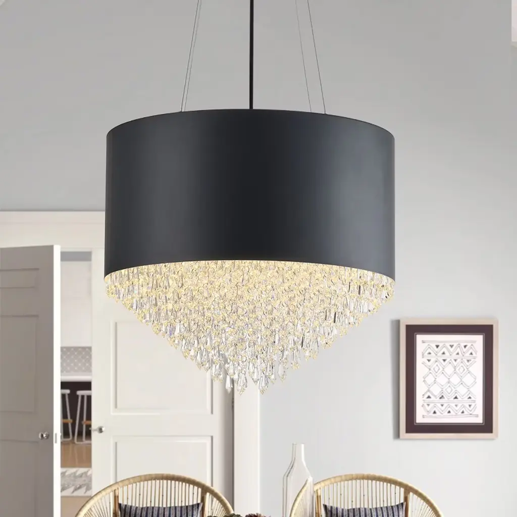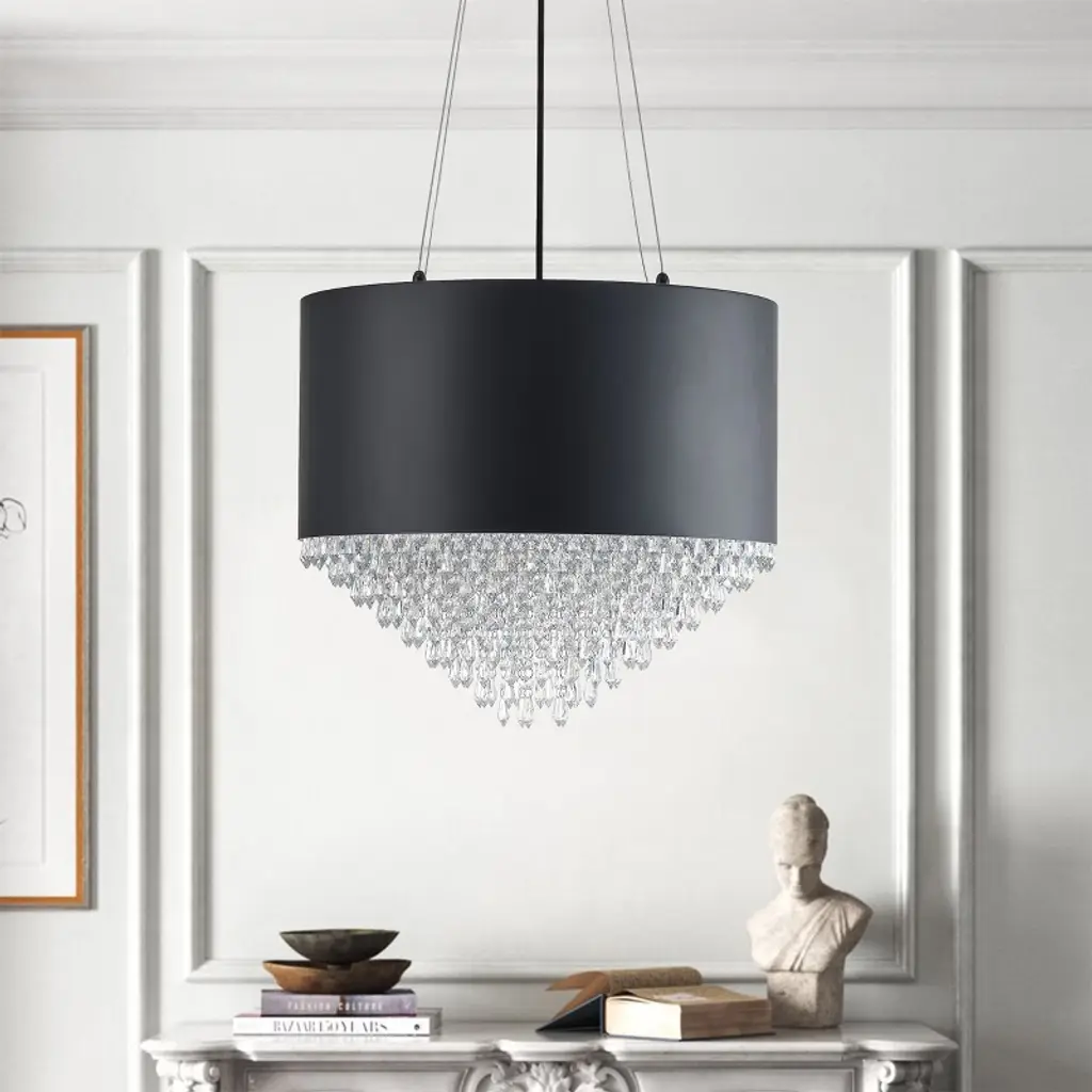 Modern Crystal Chandelier With Black Or White Drum Shade, Luxury Pendant Light For Dining Room, Bedroom