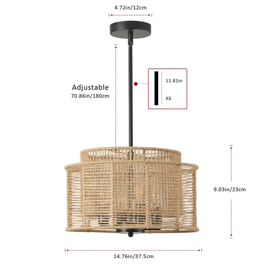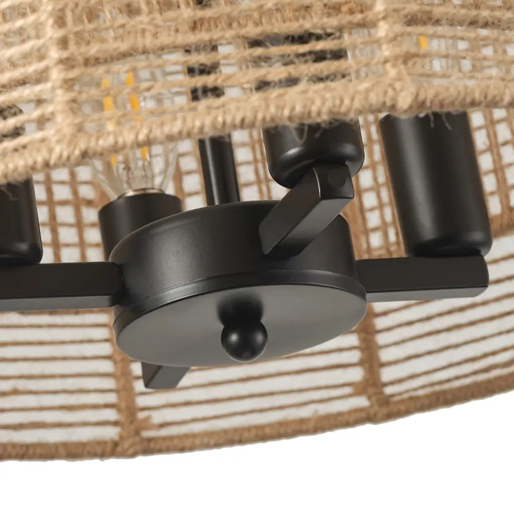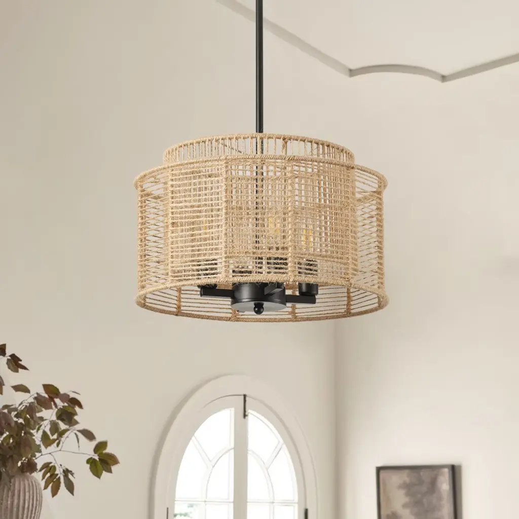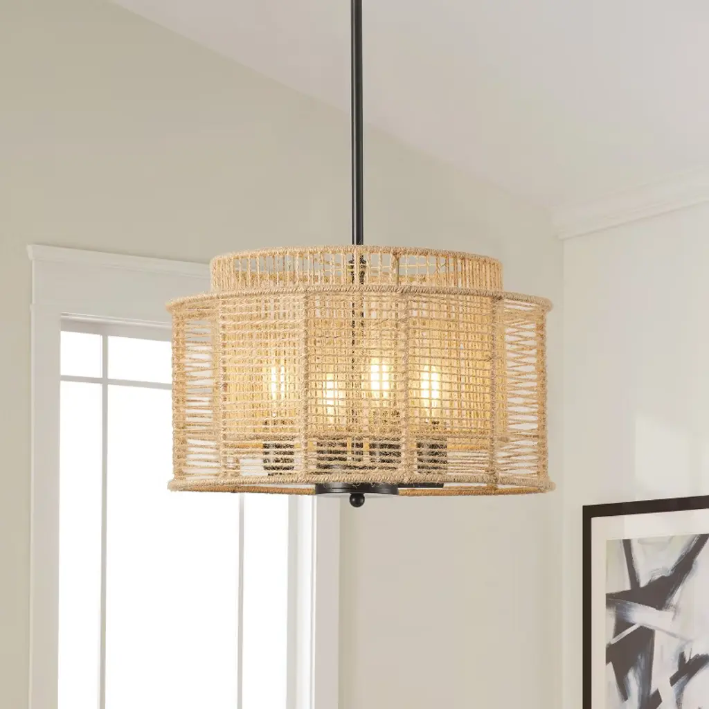 Add natural warmth to your space with this 4-light boho rope pendant chandelier. Featuring a handwoven dual-layer drum shade in yellow-toned hemp rope and a matte black iron frame, this ETL-listed fixture blends rustic charm with modern style. Compatible with E12 base bulbs (not included), it¡¯s perfect for kitchens, dining areas, bedrooms, or entryways.