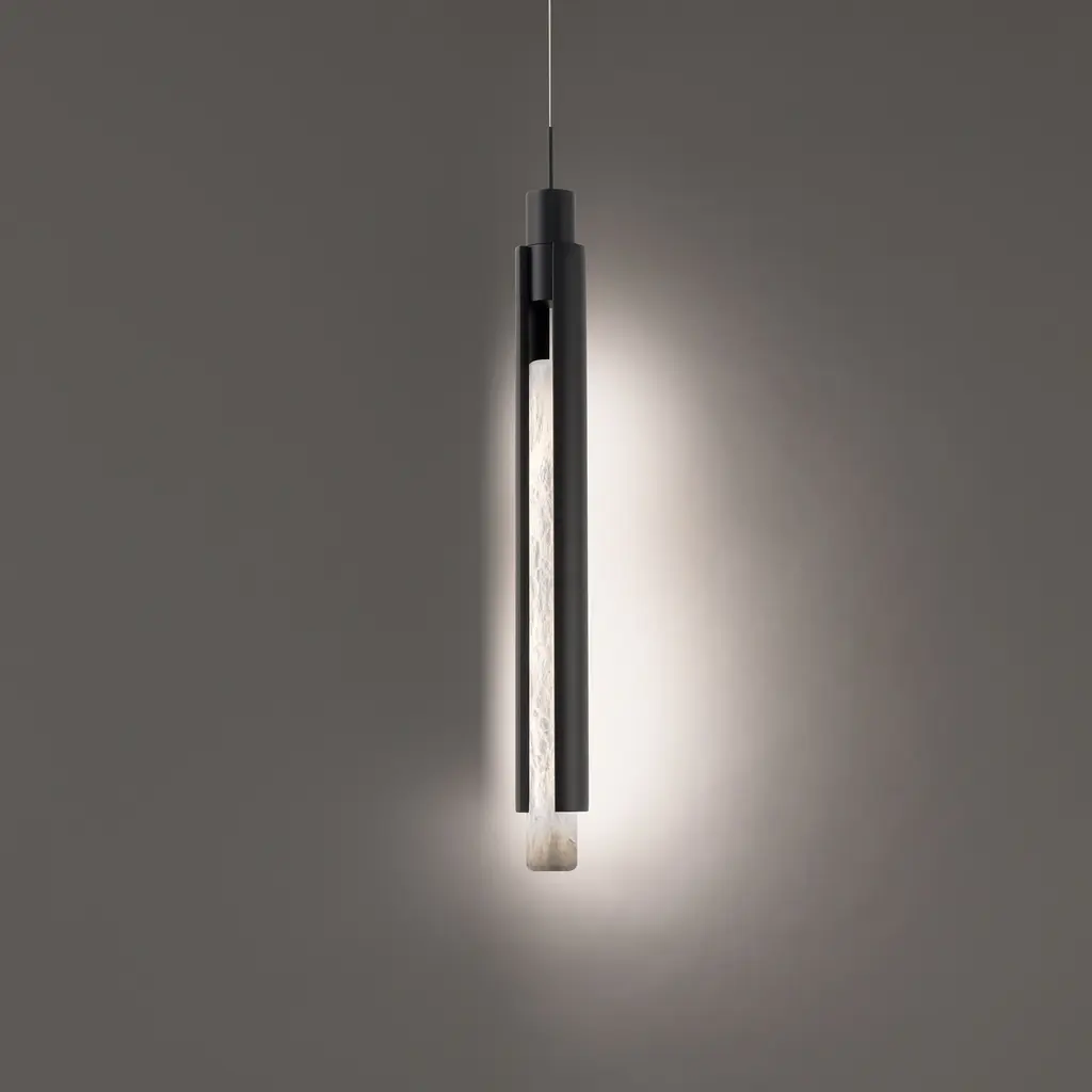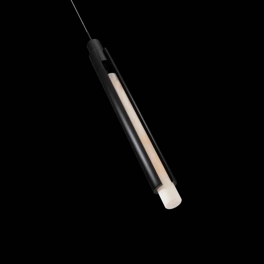 Cutting edge. Warm LED light is guided through a column of elegant Spanish Alabaster bound with a gleaming wrapped band.Features:Dimensions:Electrical Specifications: